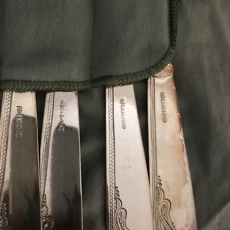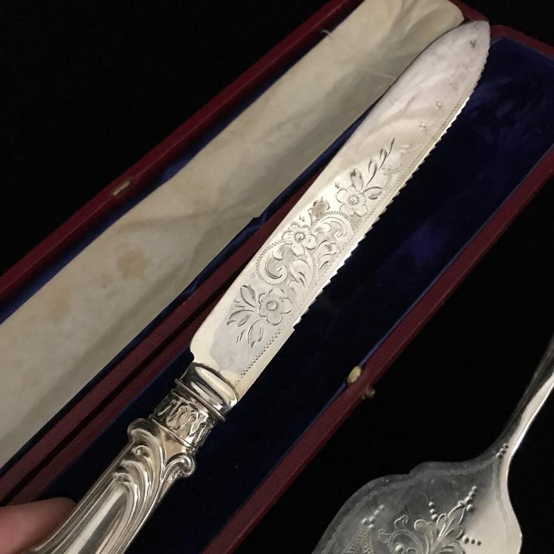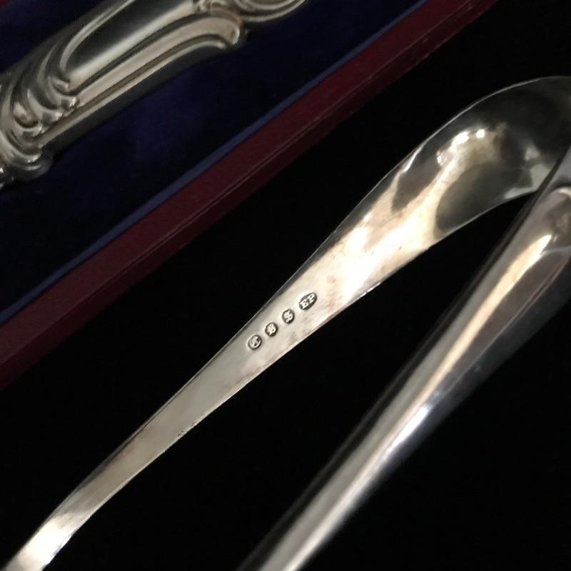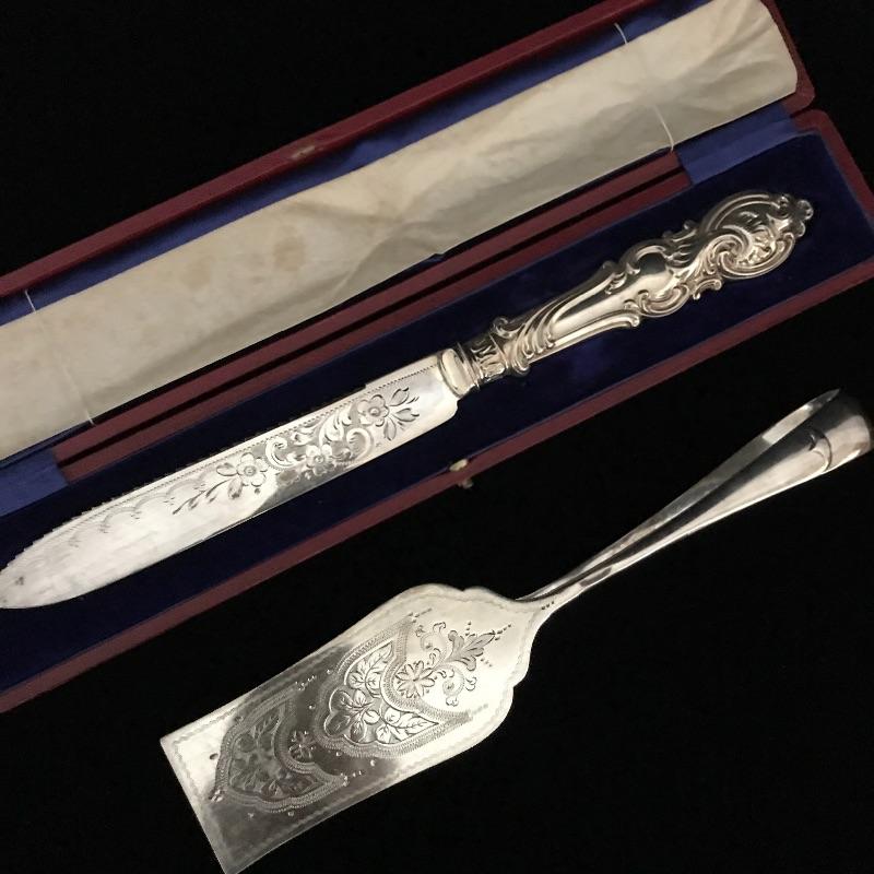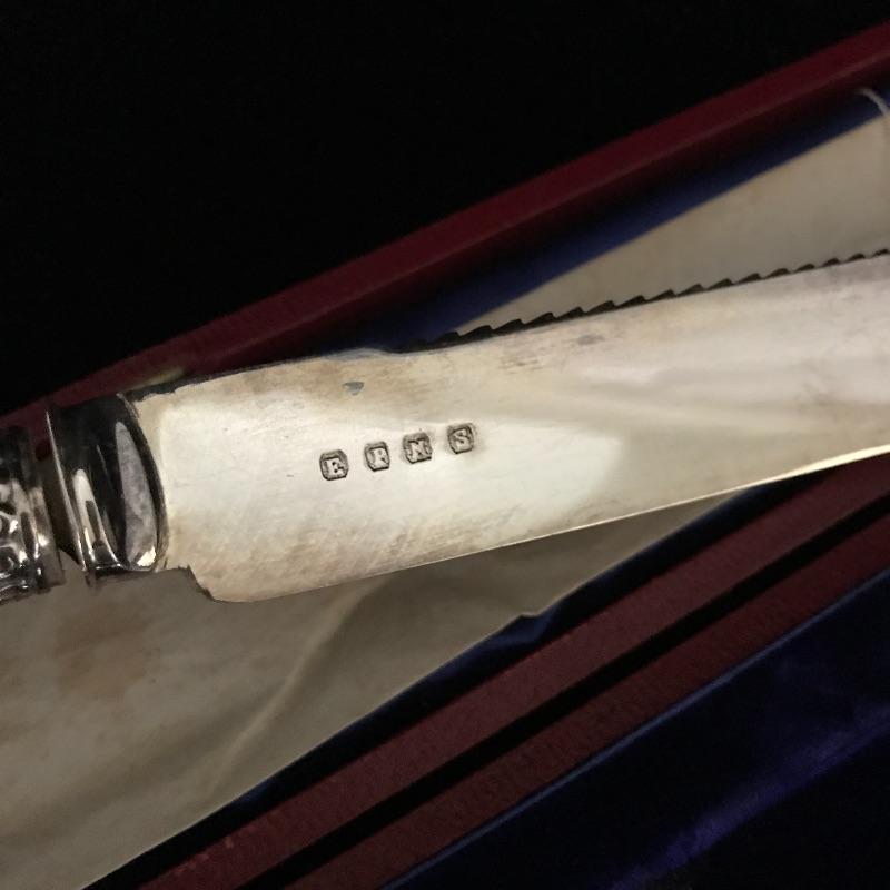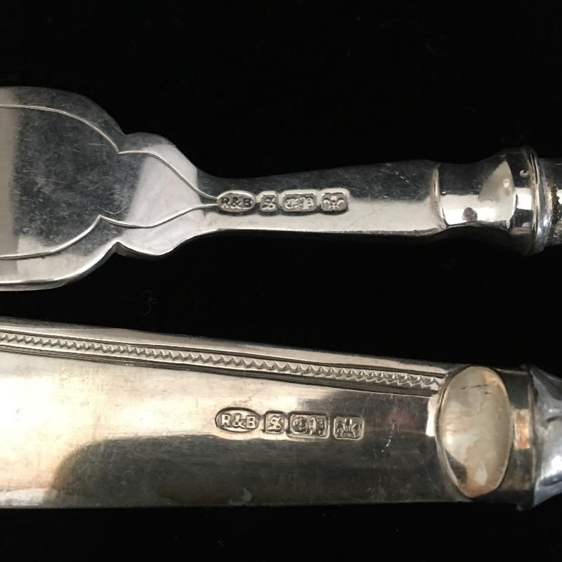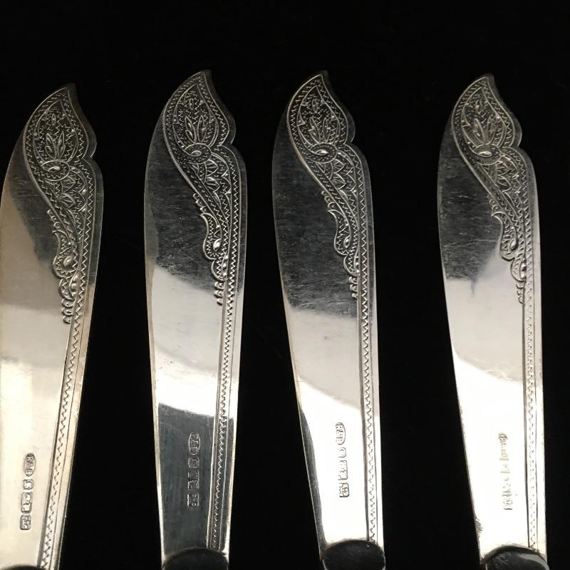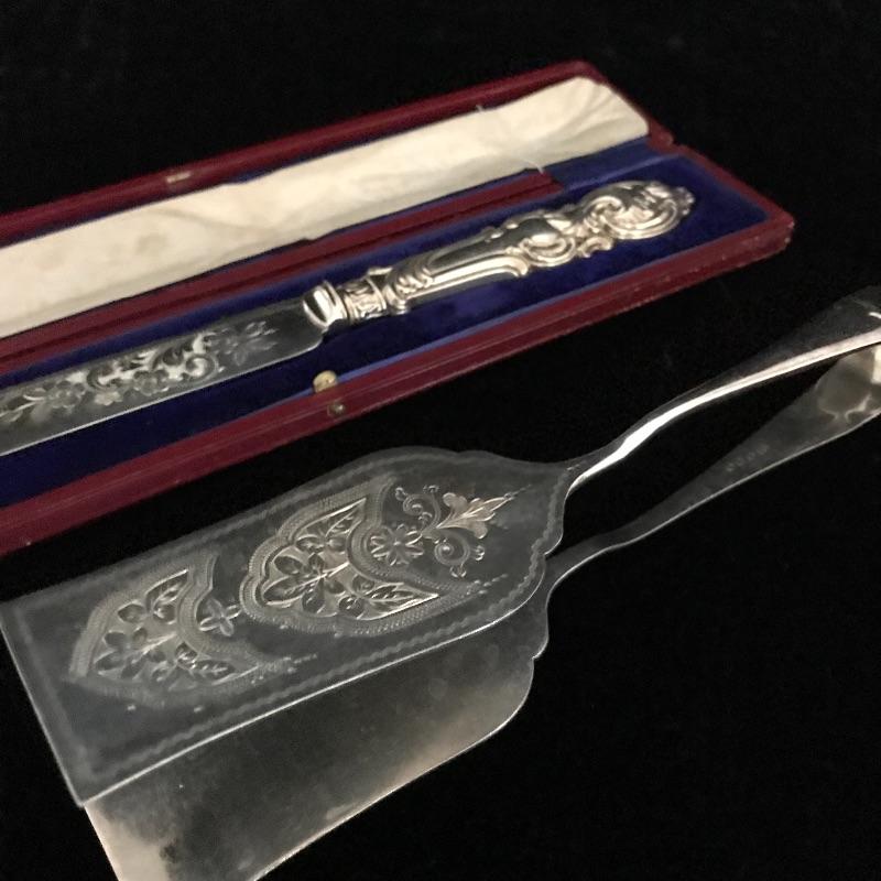 Collection to add elegance to any meal! Engraved silver flatware includes large knife, serving tongs, five fish knives and six forks all engraved. Largest knife measures 11” long.