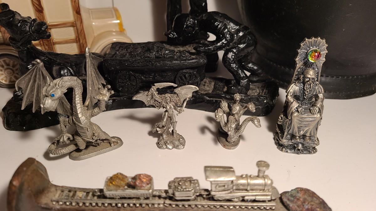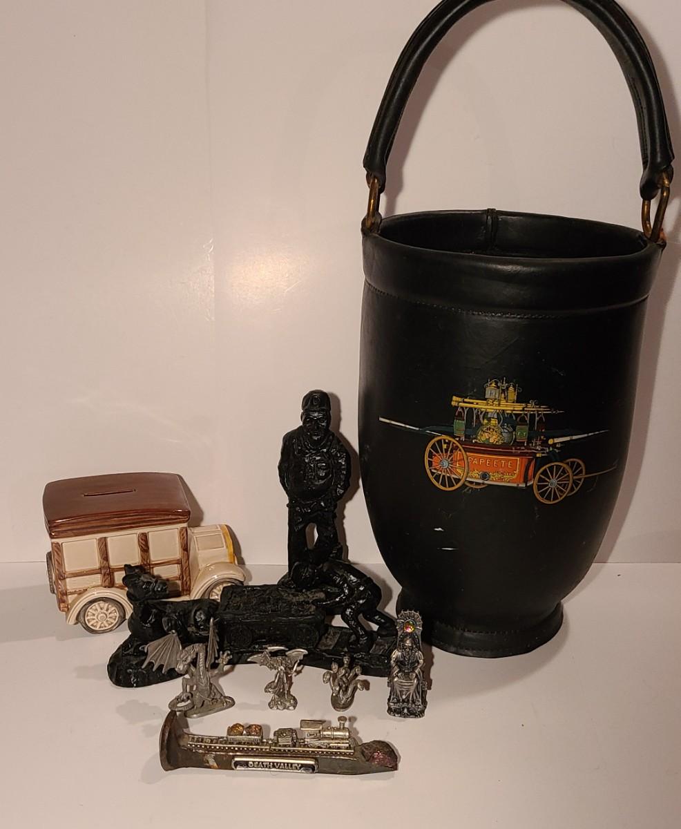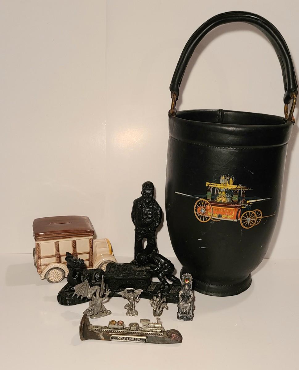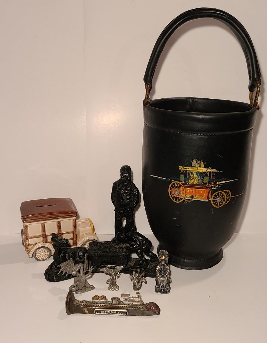 Vintage collectibles including: Fireman bucket but handle on right side is broken, needs repair, coal statues/figurines of coal miners, pewter dragons and wizards and more. Please see all pictures for content of the lot, condition of the lot, and measurements if taken. Pictures are the best representation of the items listed and items are untested unless indicated in description. Thank you for looking and have fun bidding!