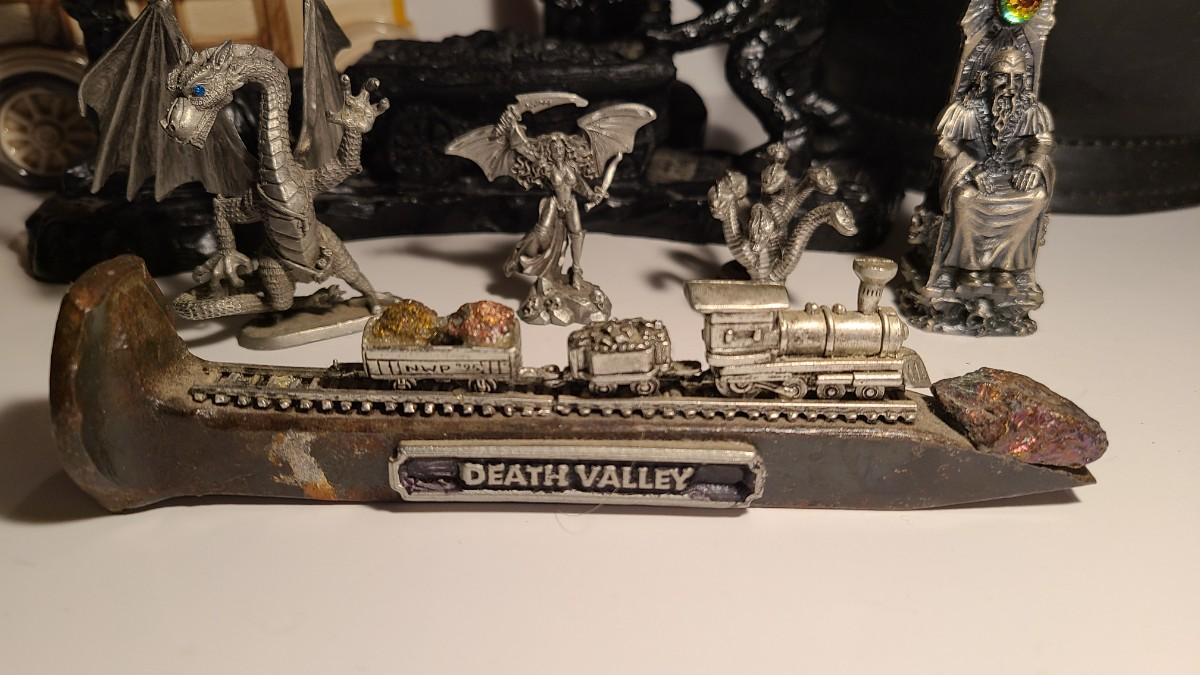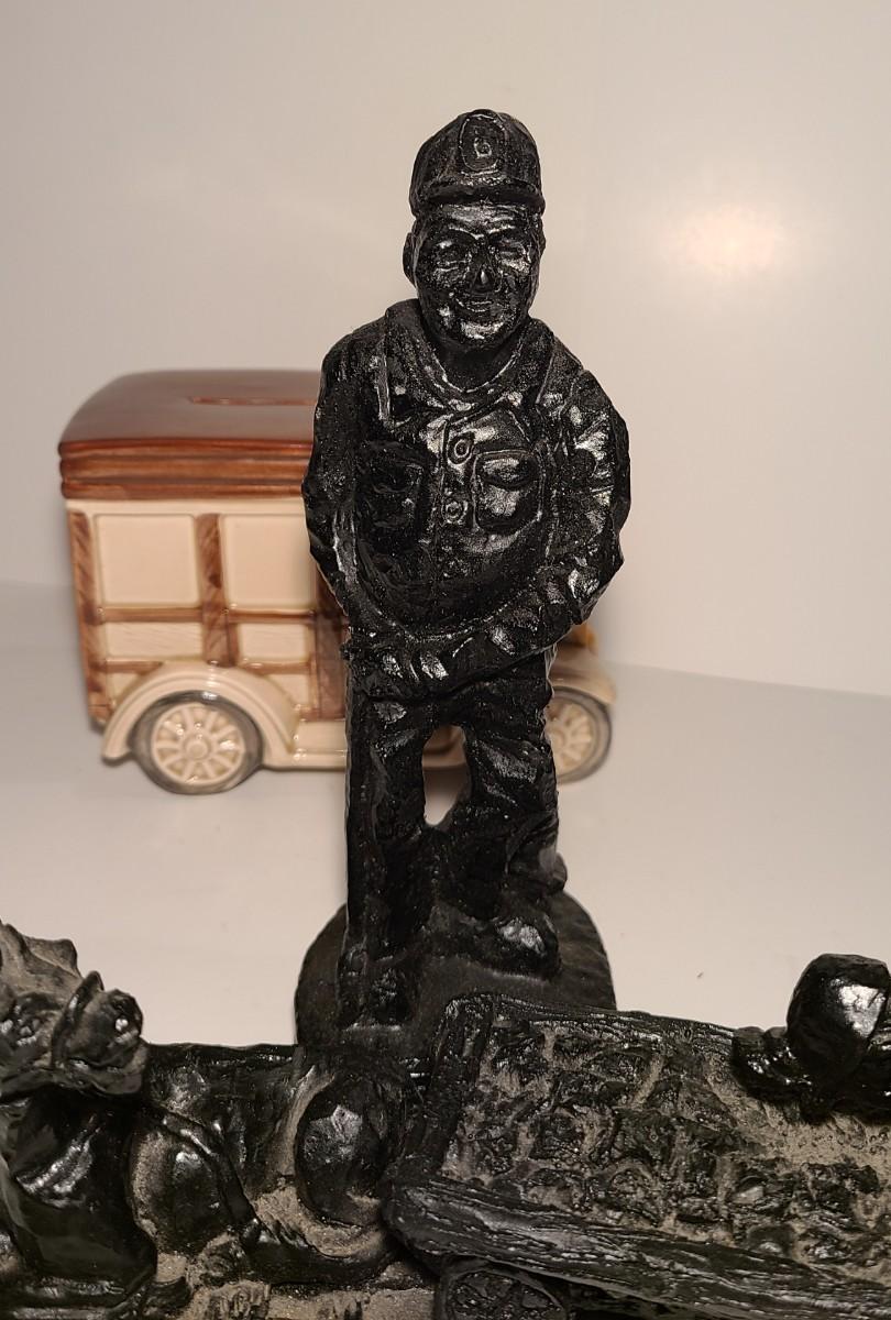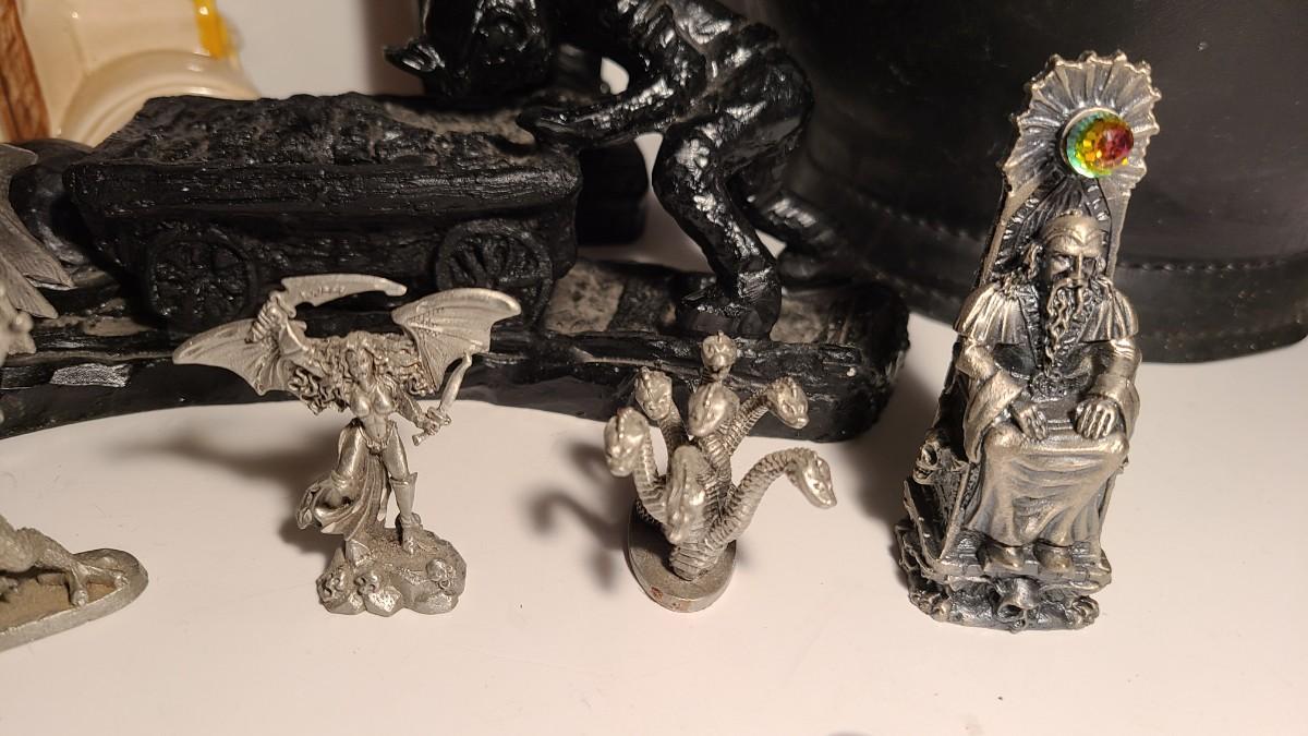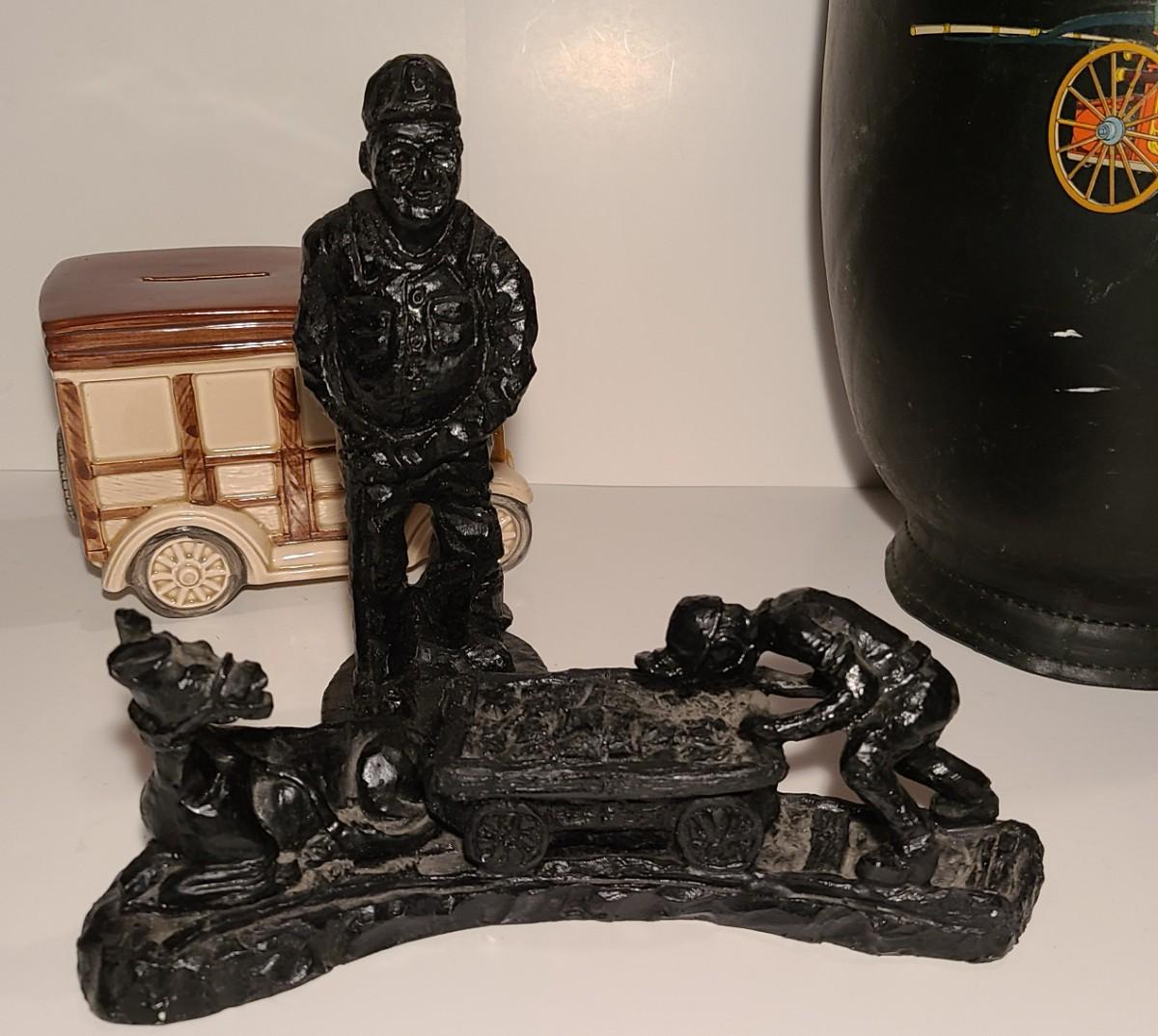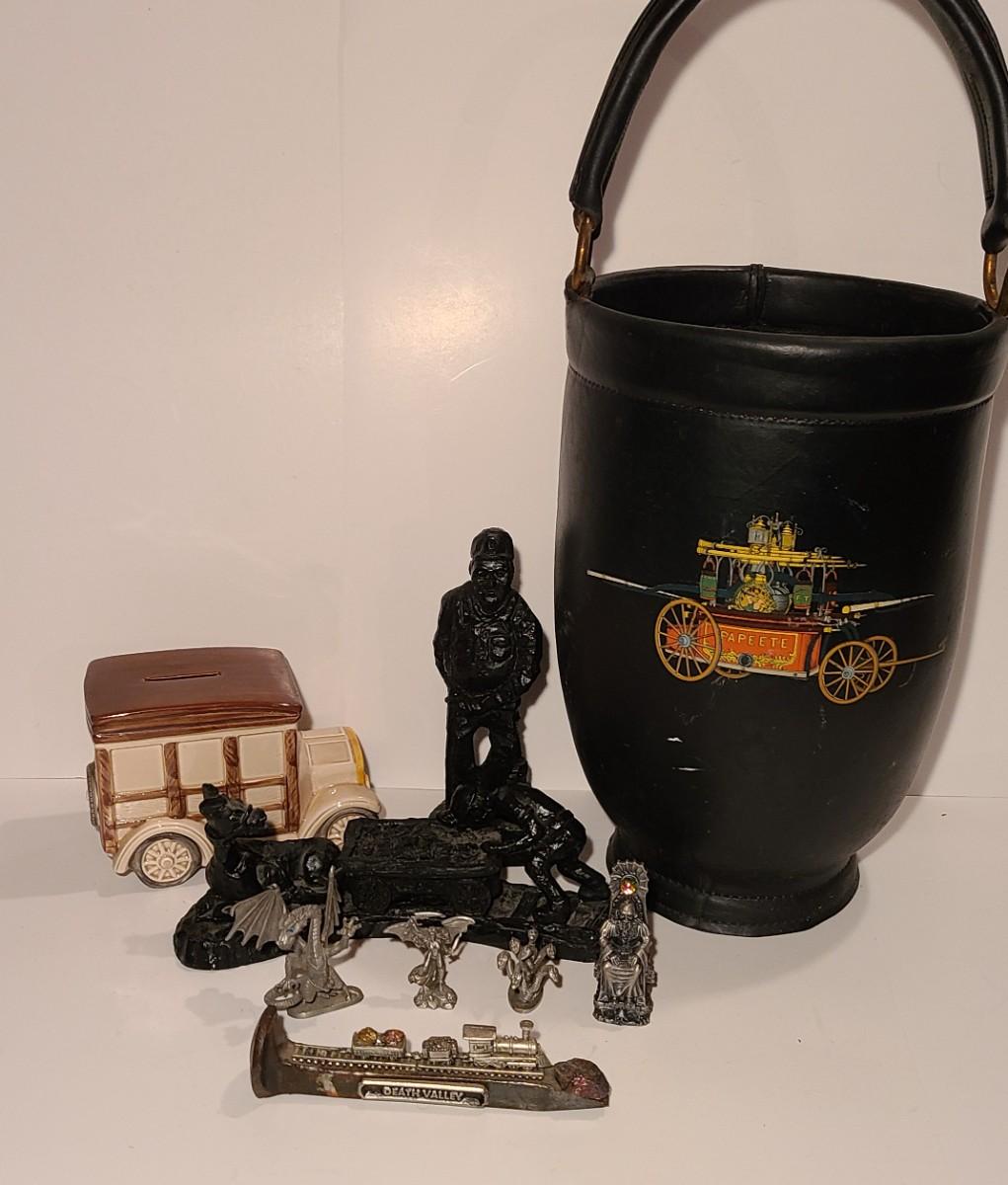 Vintage collectibles including: Fireman bucket but handle on right side is broken, needs repair, coal statues/figurines of coal miners, pewter dragons and wizards and more. Please see all pictures for content of the lot, condition of the lot, and measurements if taken. Pictures are the best representation of the items listed and items are untested unless indicated in description. Thank you for looking and have fun bidding!