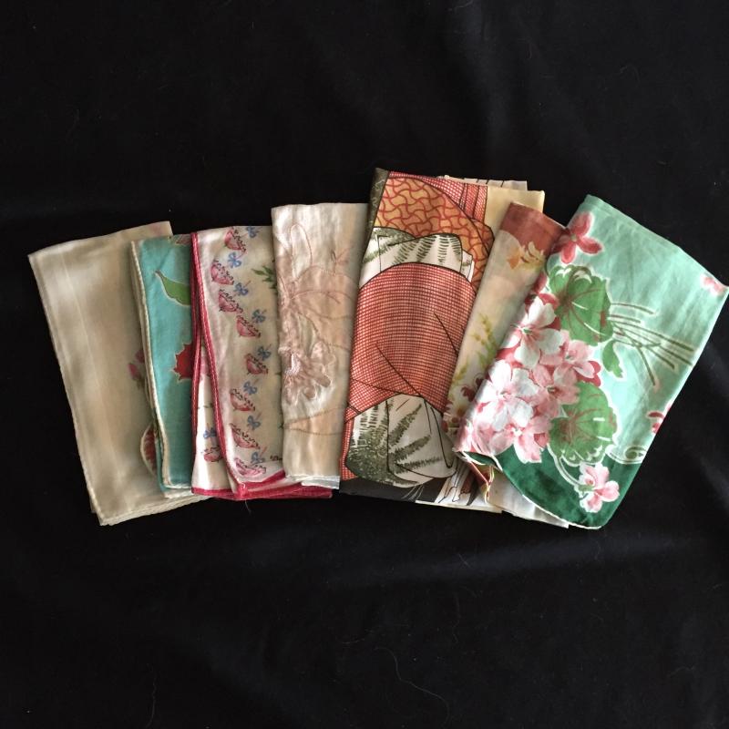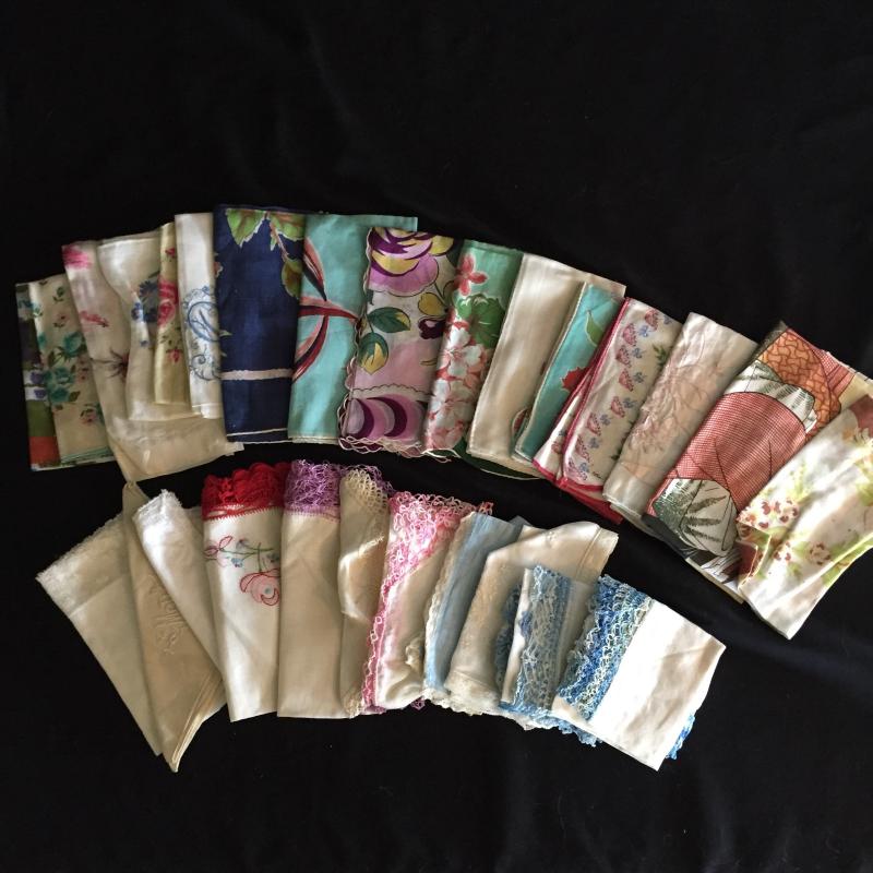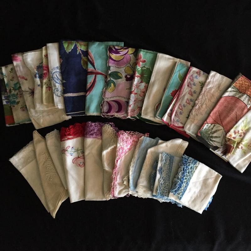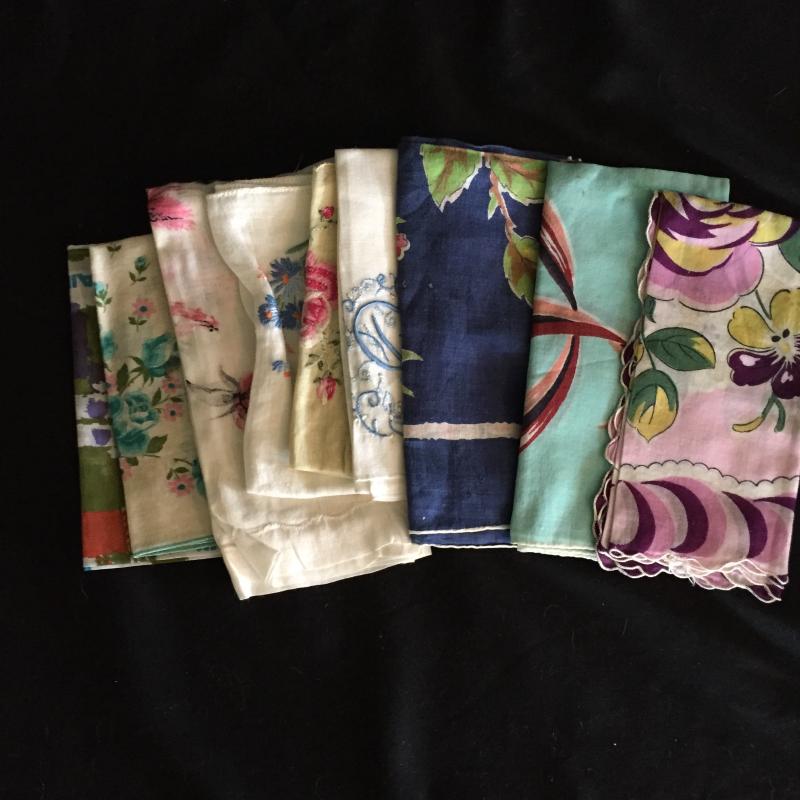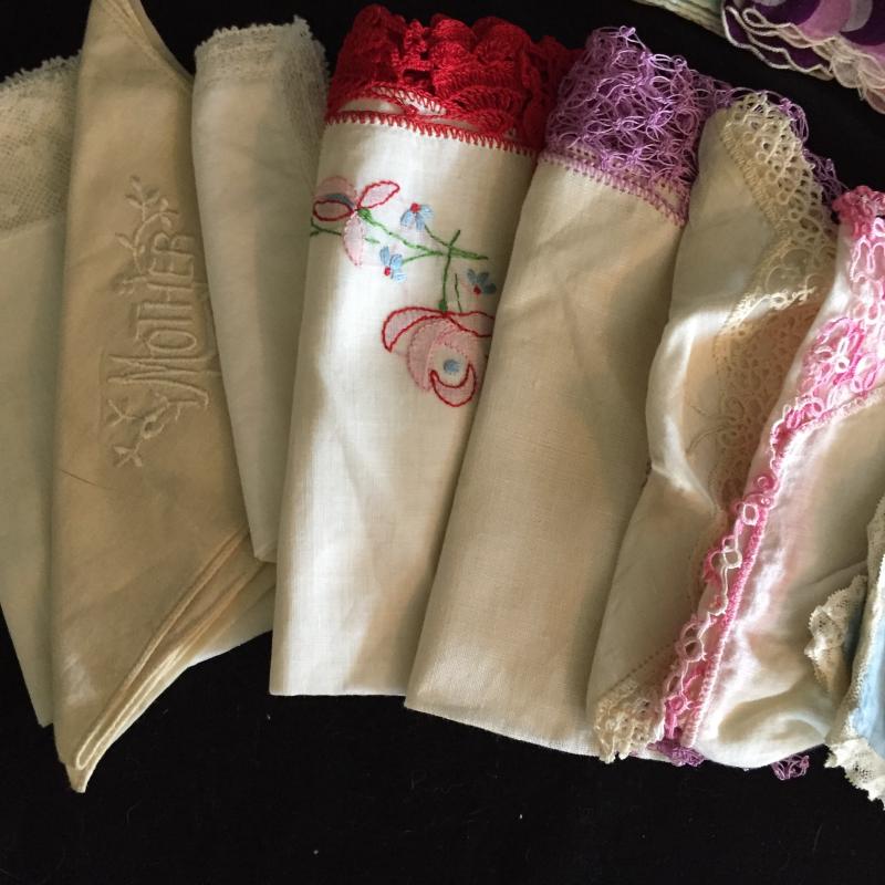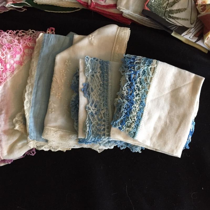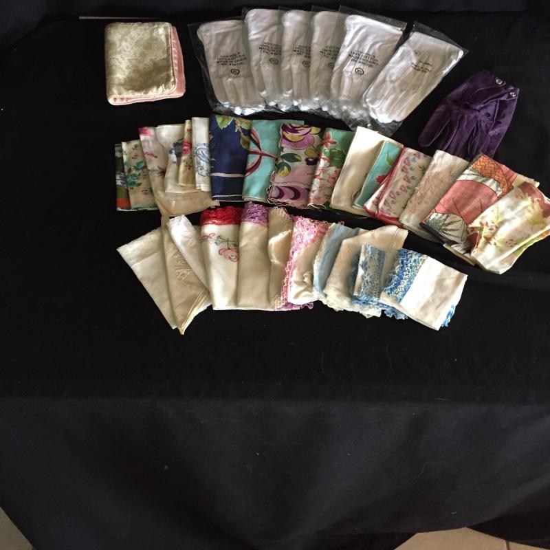 Delicate collection of gloves and handkerchiefs. White gloves are size XL and purple gloves are size medium. Handkerchiefs are in good condition. Local pickup only.