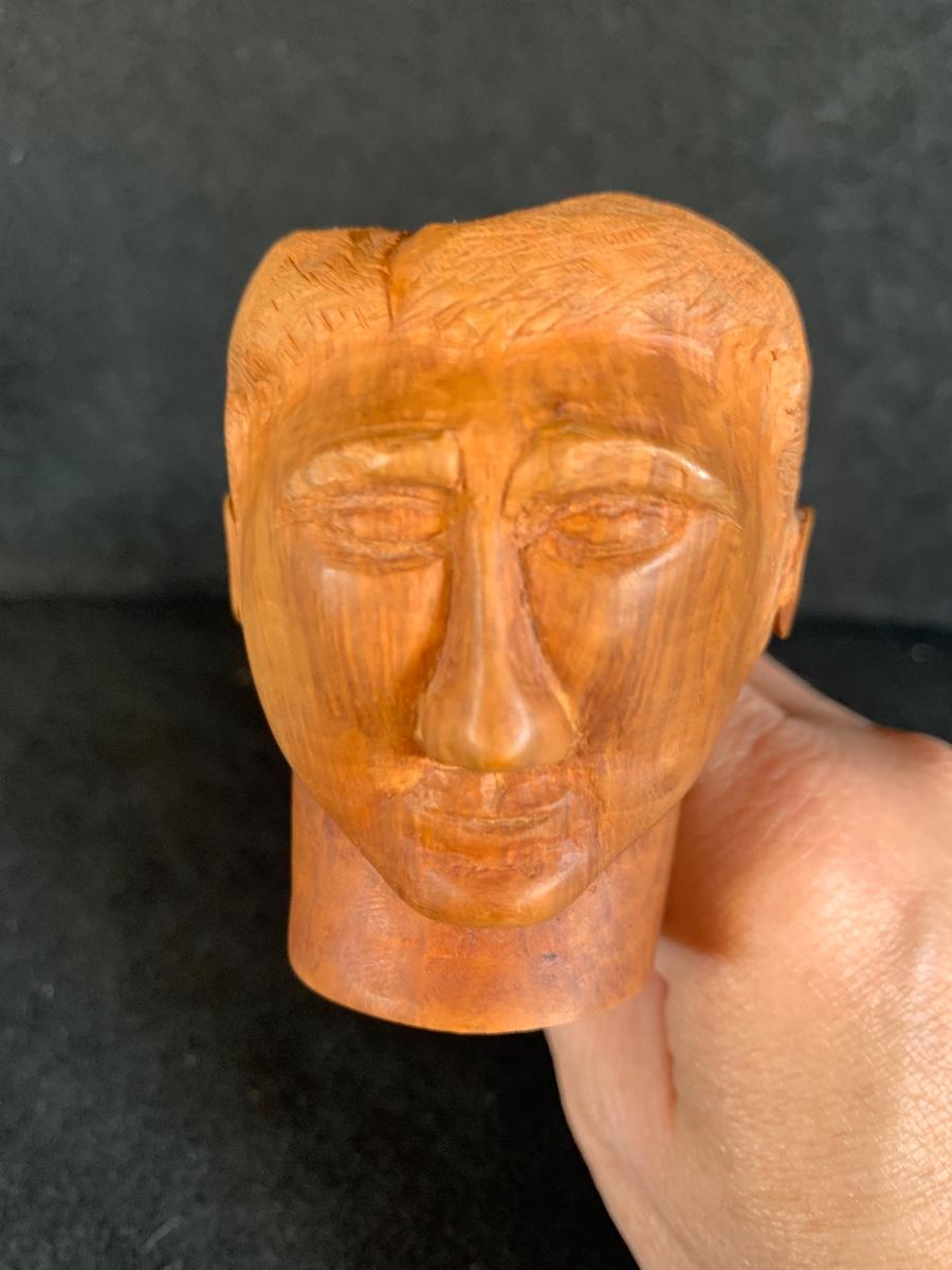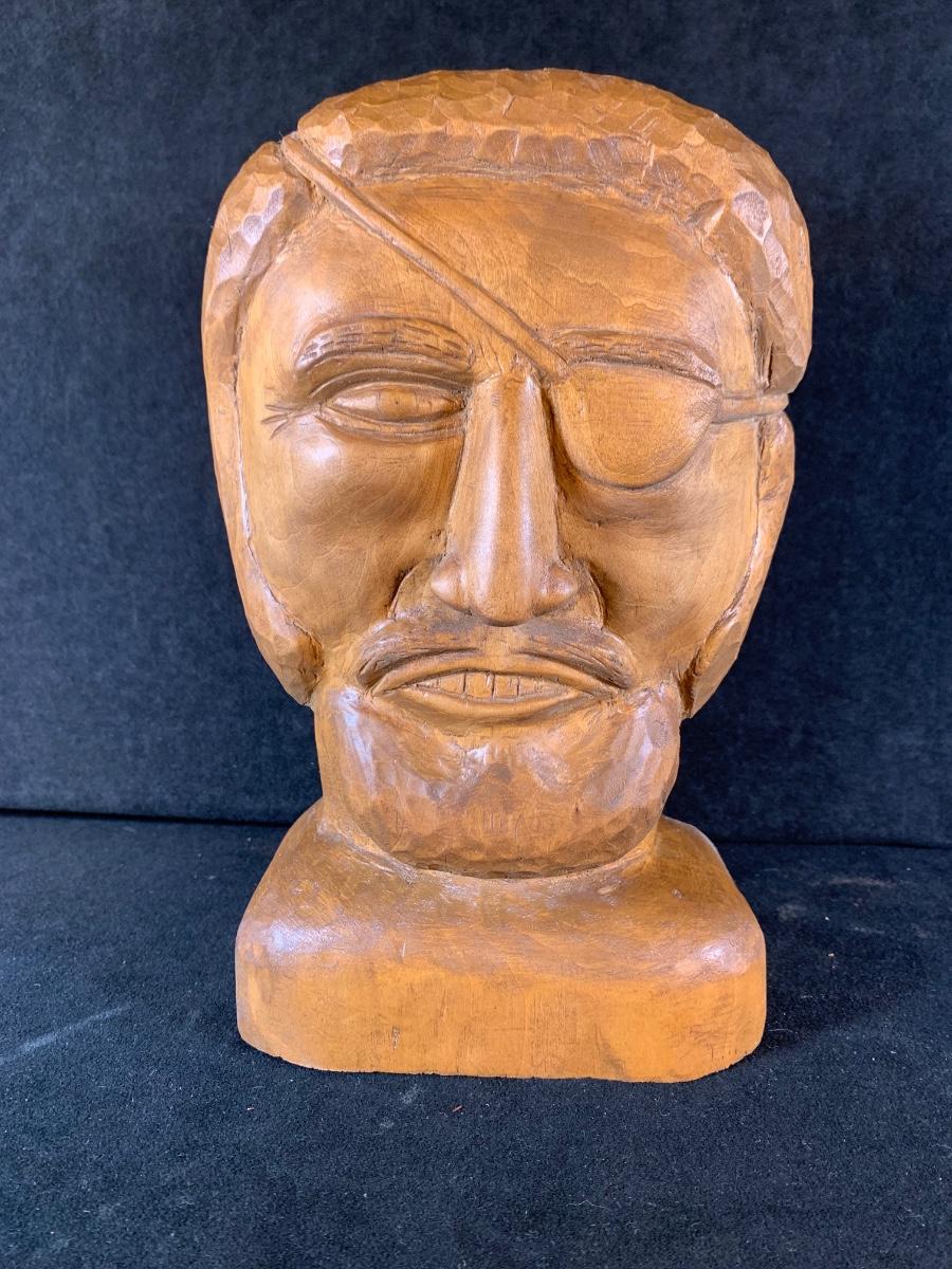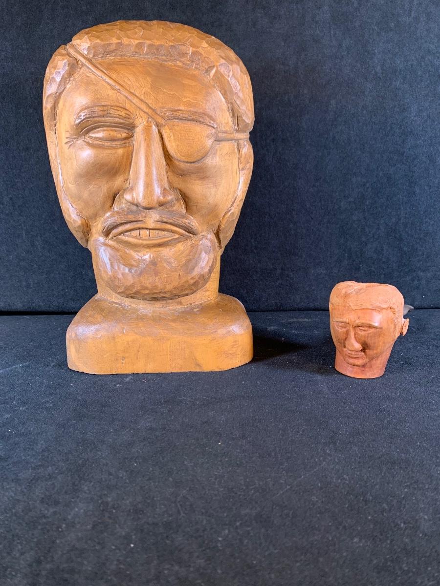 Hand carved man head with eye patch and man face pipe. Man measures 9 1/2H x 6"W, pipe is 7"L x 2 3/4H