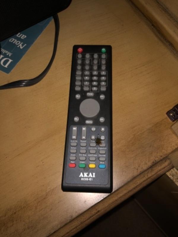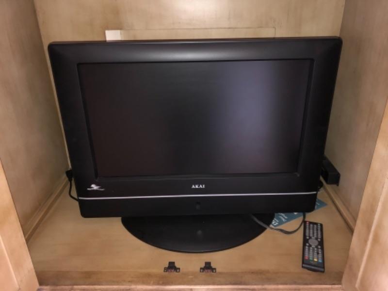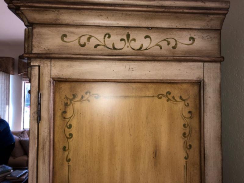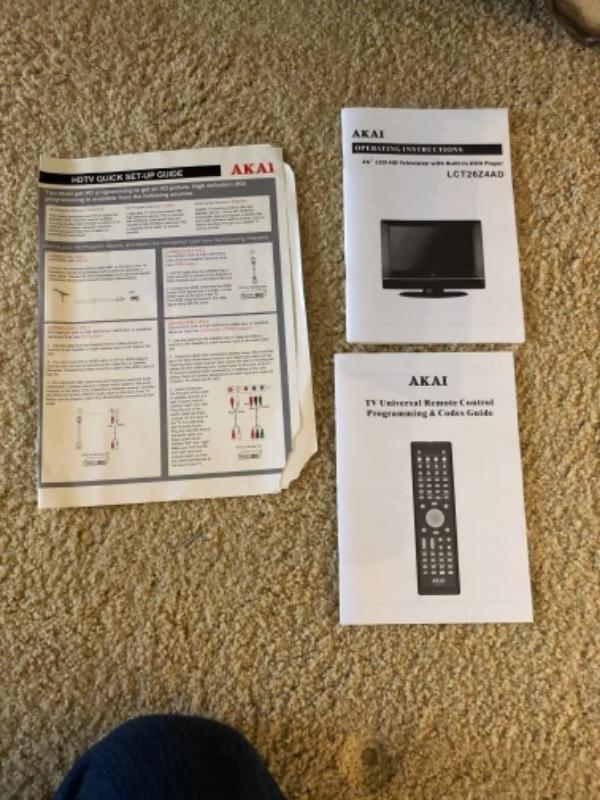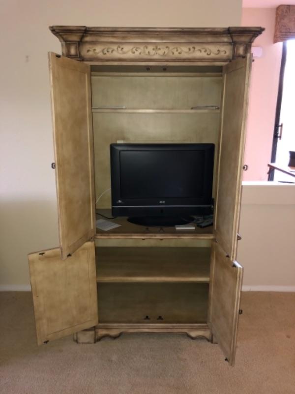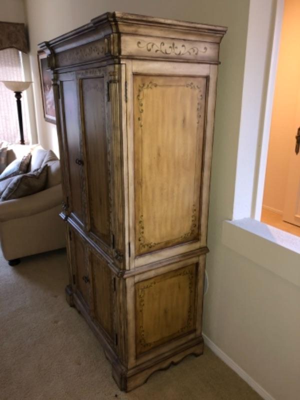 Lot 47. Hand painted wooden television cabinet (78”H x 46”W x 25”D) with AKAI 26” television with remote and manual--WAS $195““NOW $97.50