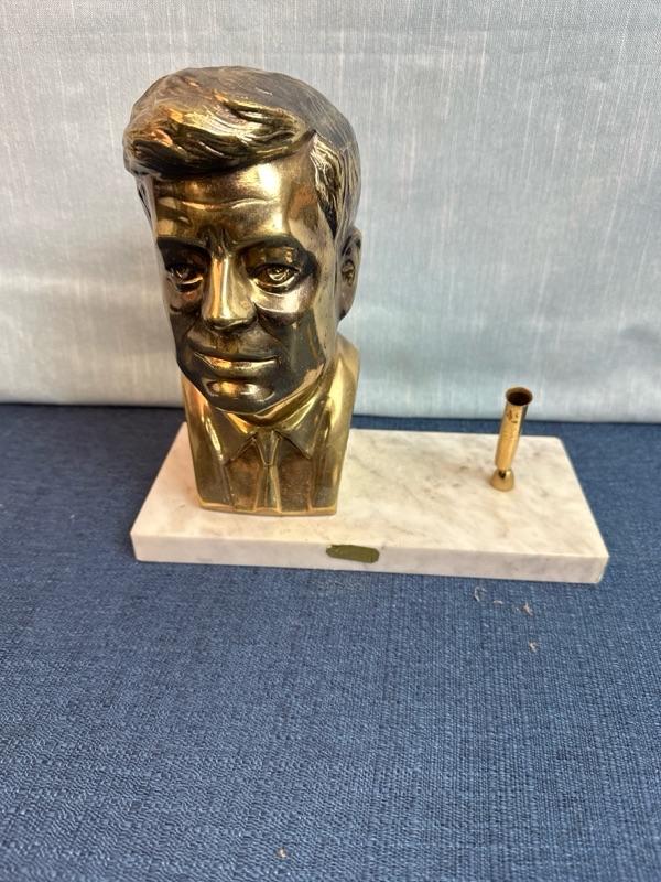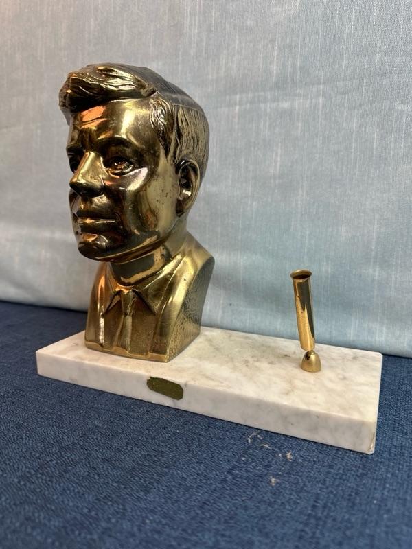 Lot 47 JFK desk set with metal bust 7 1/2 inches tall and marble base 9 inches across