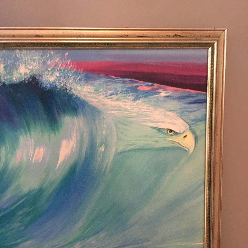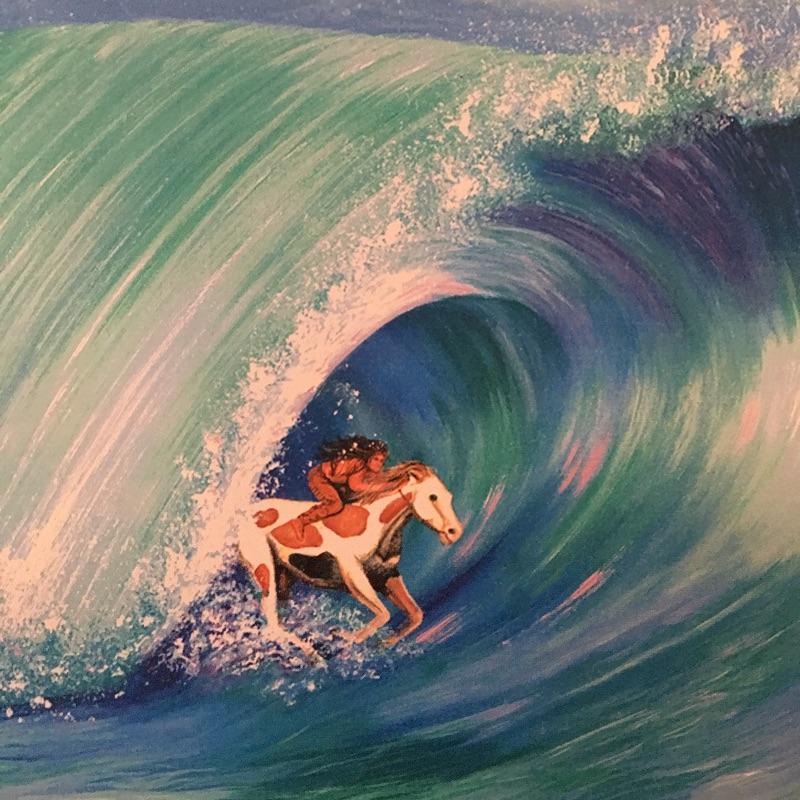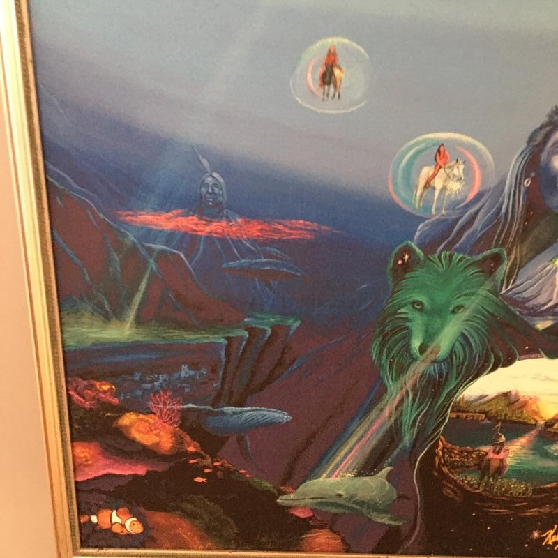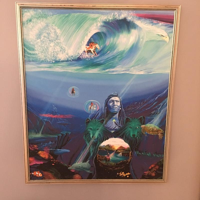Renowned artist Kelly Hostetler framed art. Start a collection with this unique artwork blending the sea with Native Americans. Frame measures 30” x 36”.
