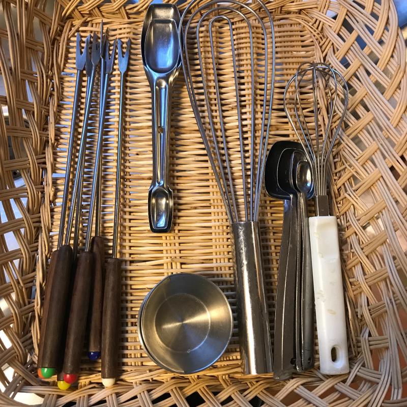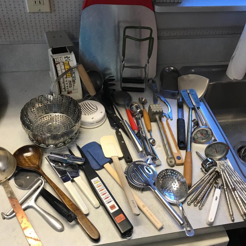 Misc. pieces such as nut crackers, pizza cutter, thermometers, fondue forks, measuring spoons, spatulas, scale, steam basket, openers and more. This lot is available for local pick up in Flat Rock, NC only.