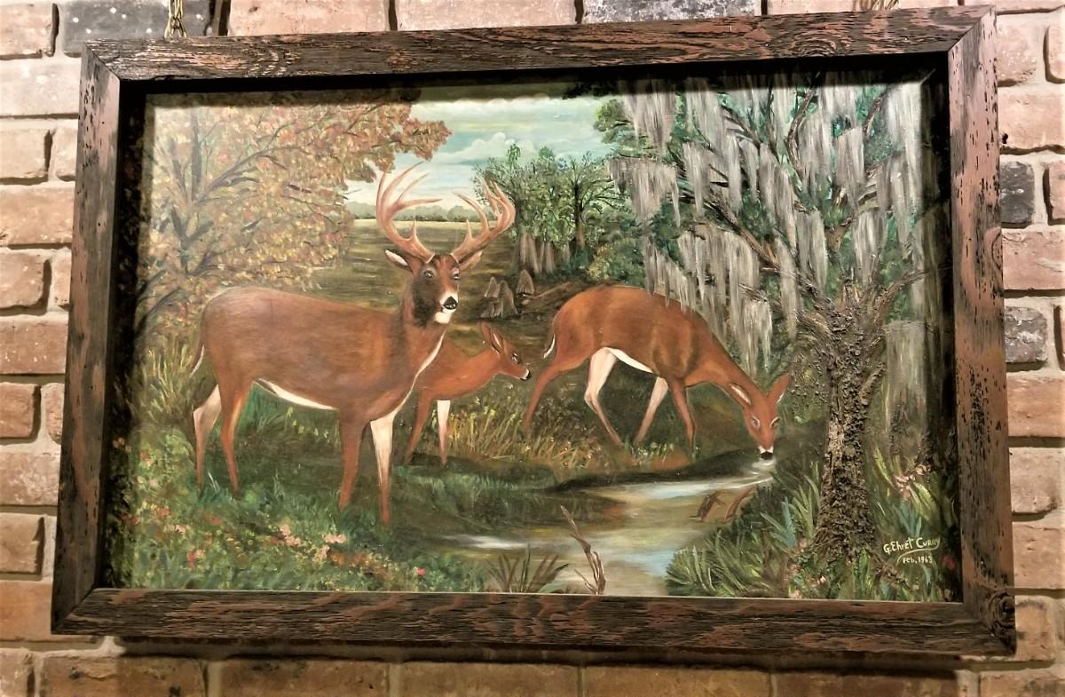 Lot #47  Kitschy Painting of Deer at a Stream - dated 1963