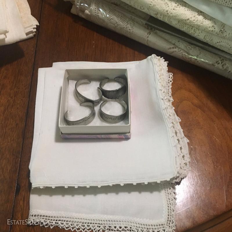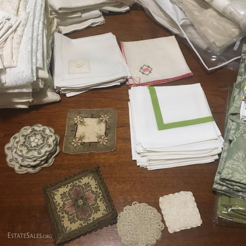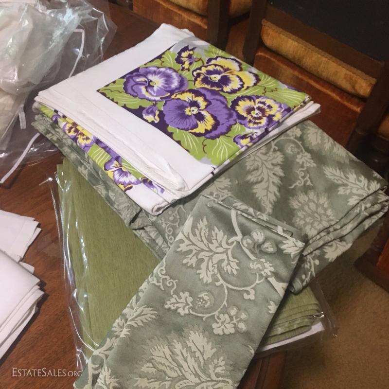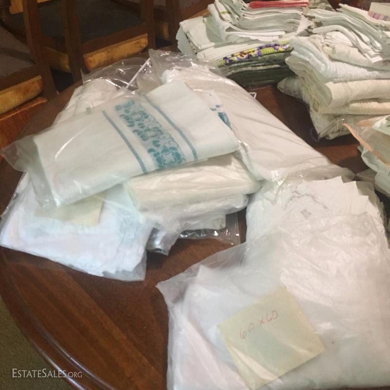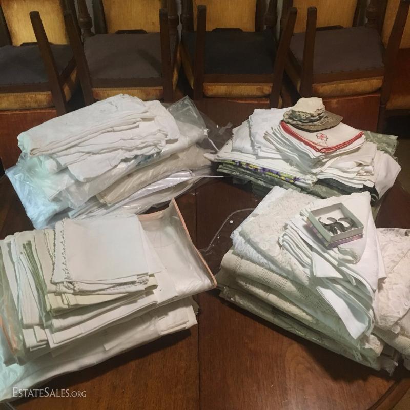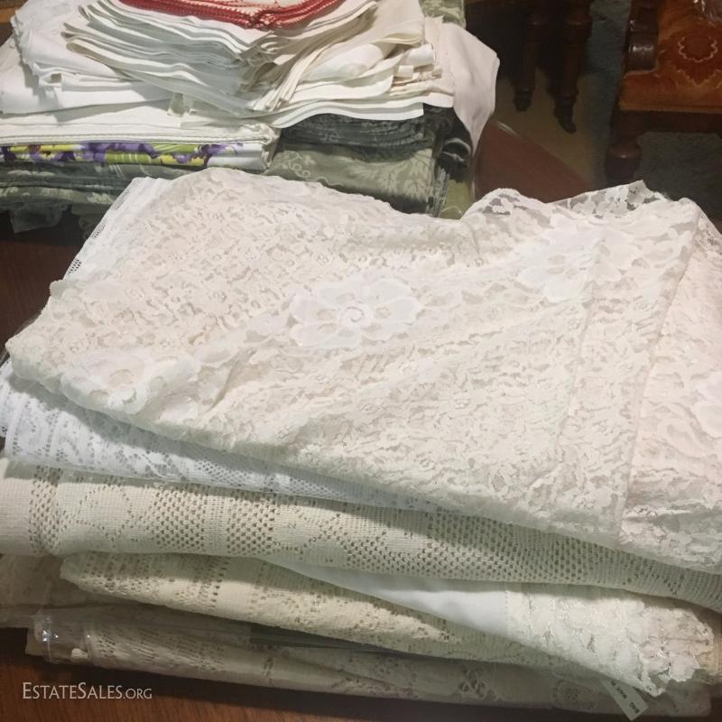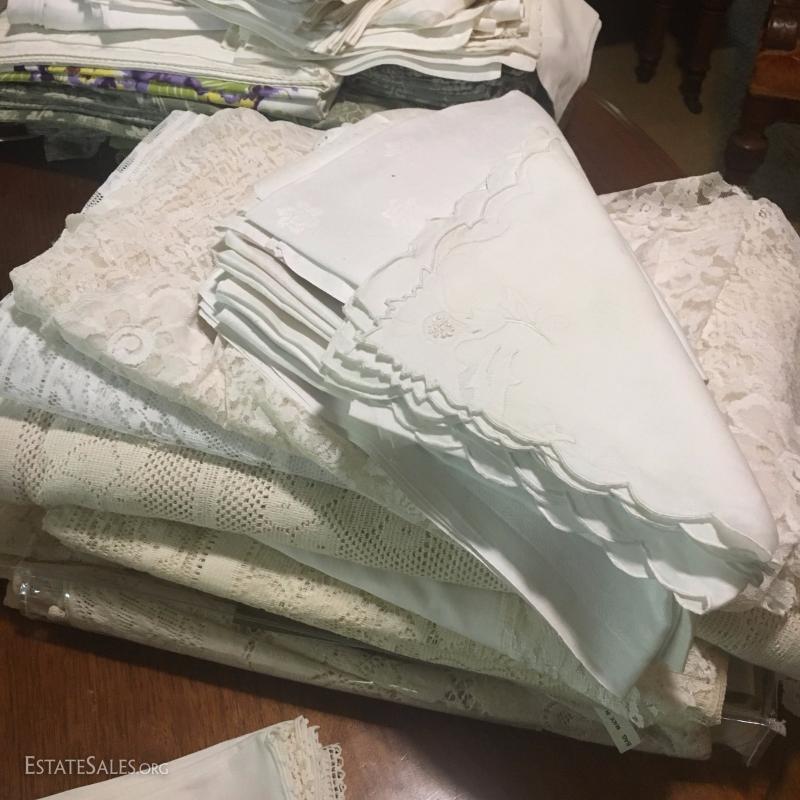 Large lot of linens and lace tablecloths. Embroidered White Linen included. Several other styles and sizes. Some include matching napkins. Many of these fit the different sizes of the antique expandable table Lot 46.