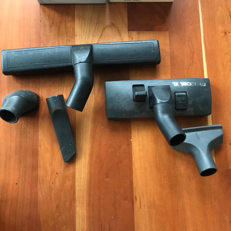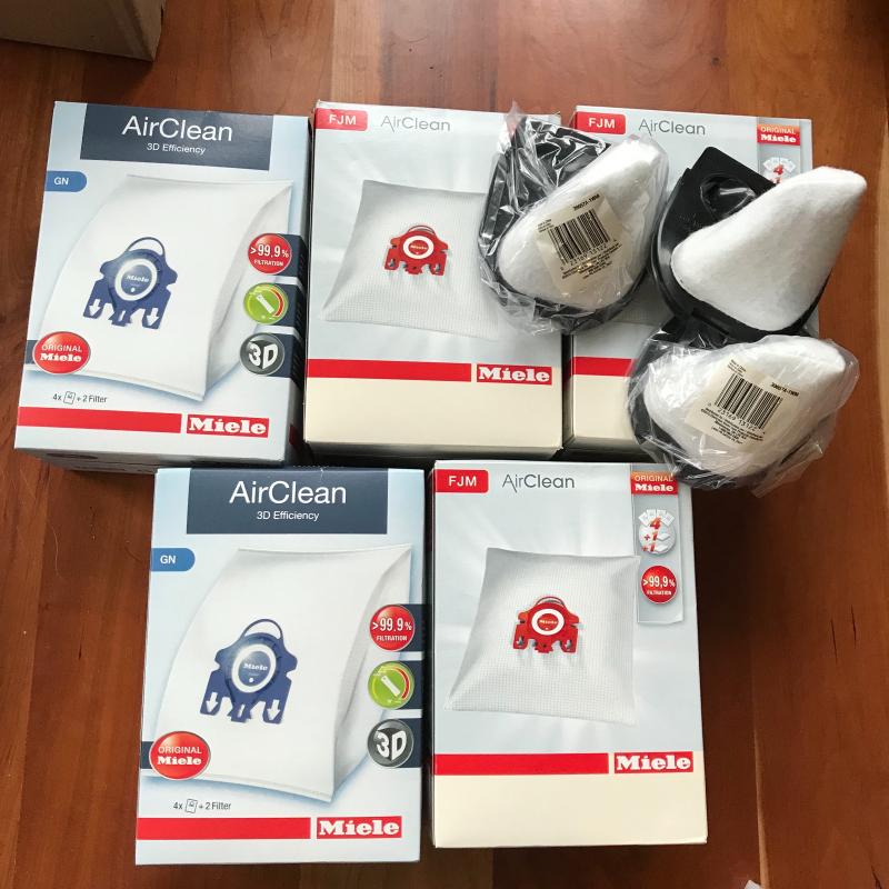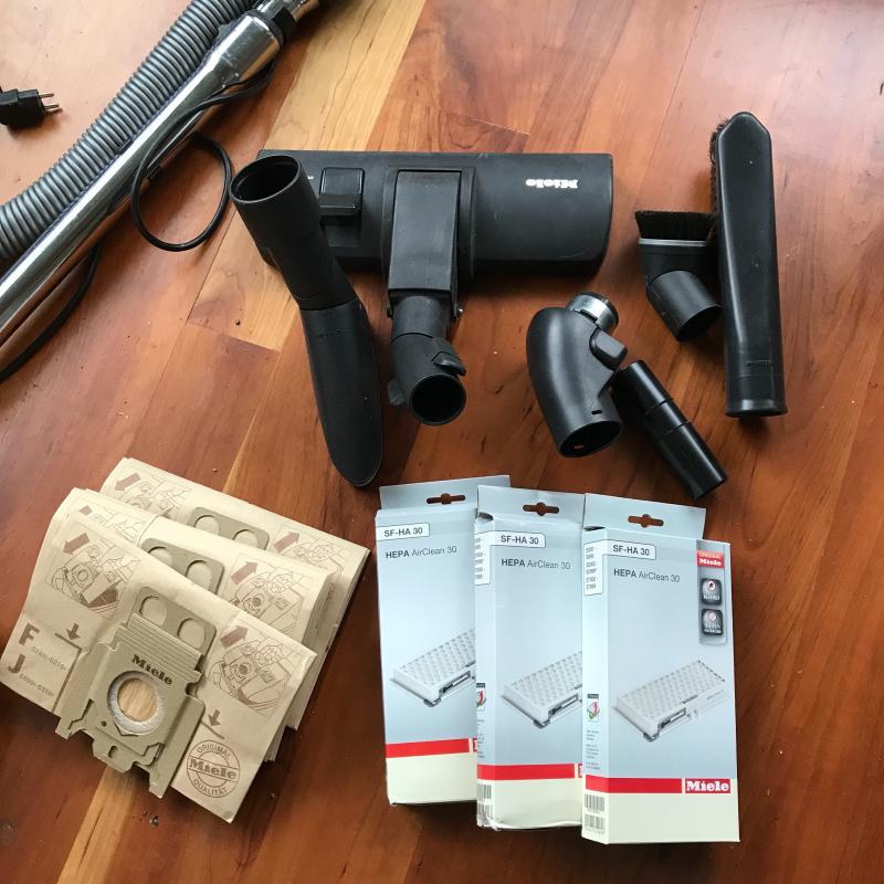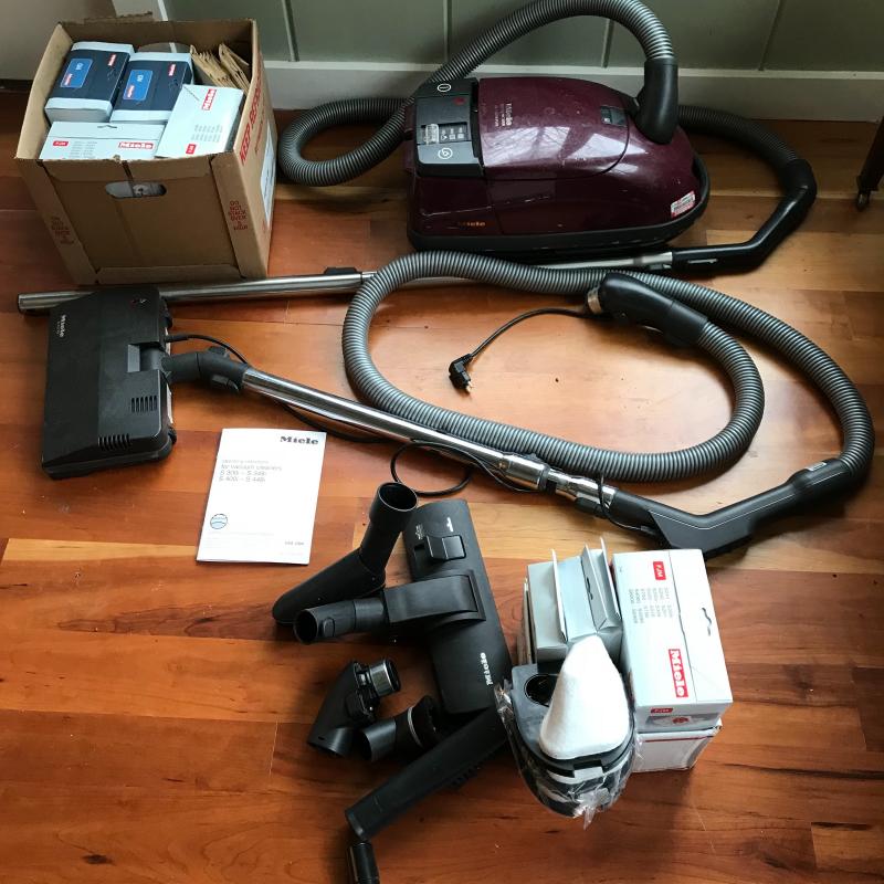 Deluxe Miele vacuum cleaner with multiple attachments in working condition. Miele has automatic cord winding and five settings. Vacuum comes with a plethora of Miele air filters and six extra dustbags. Owner’s manual is also included. No shipping.