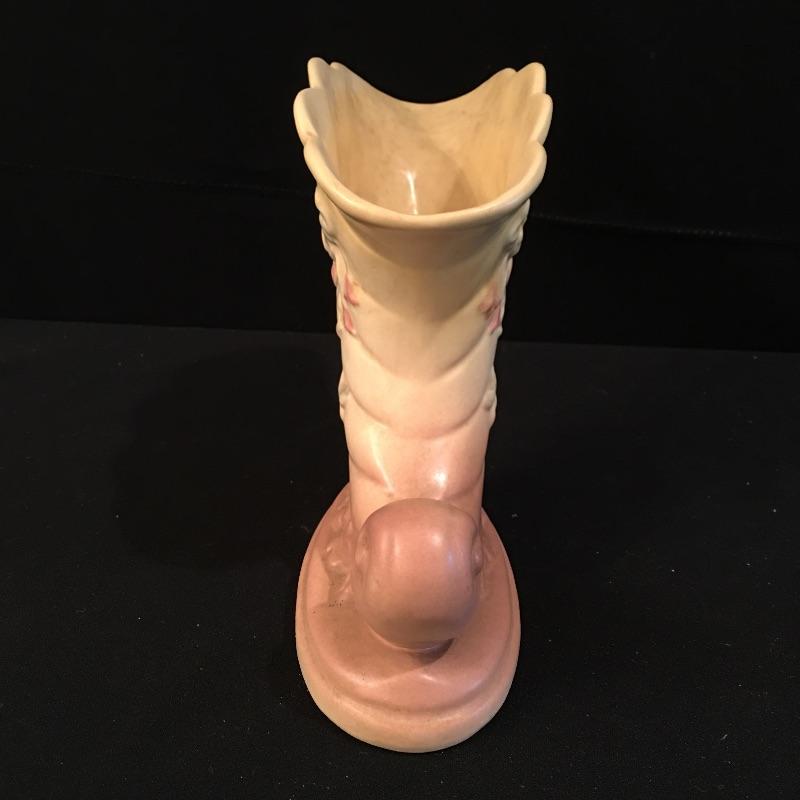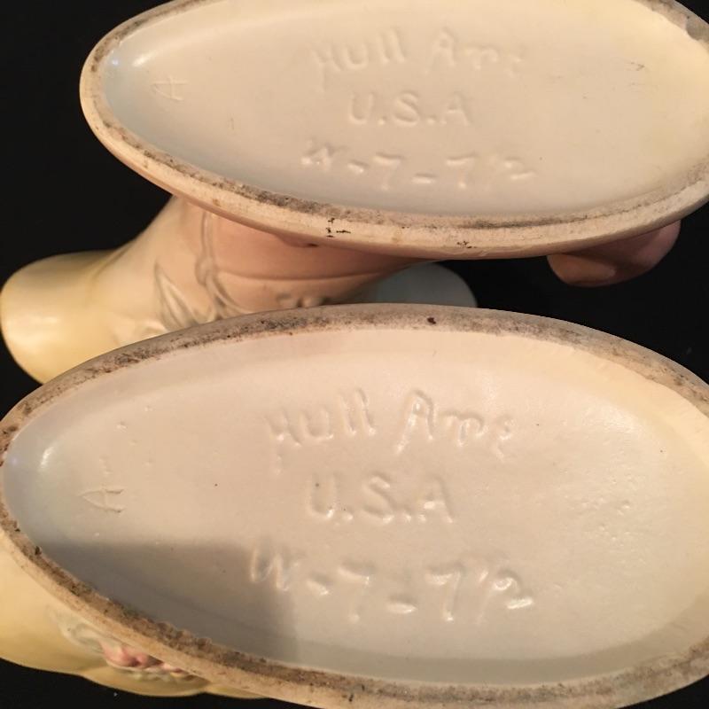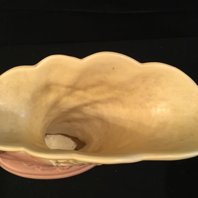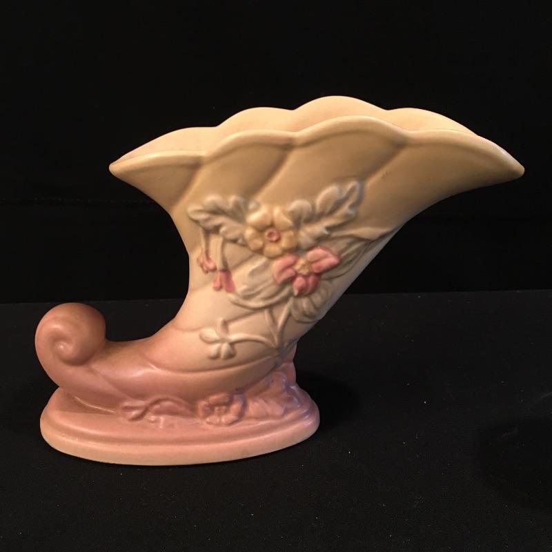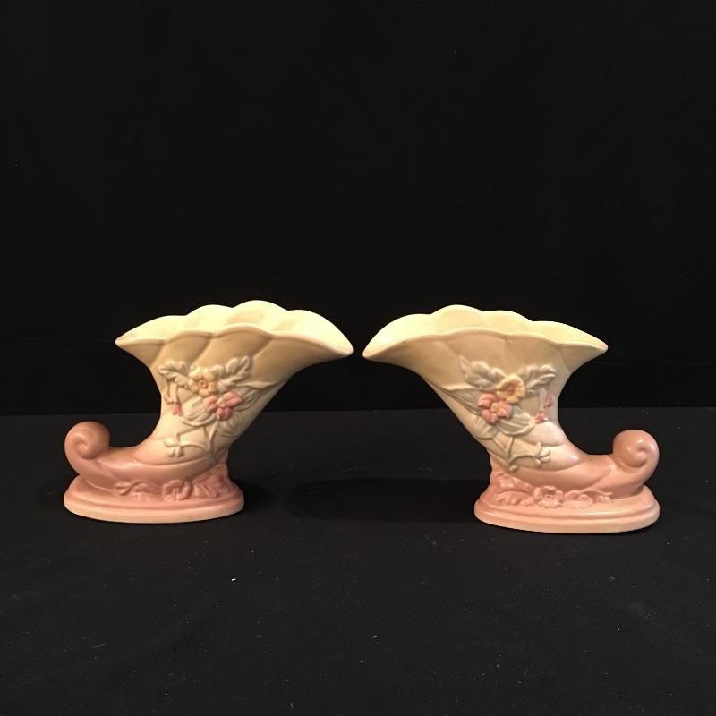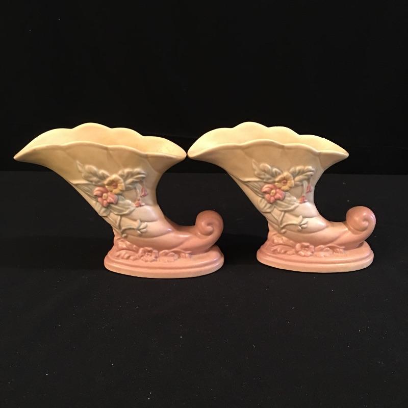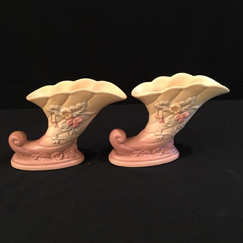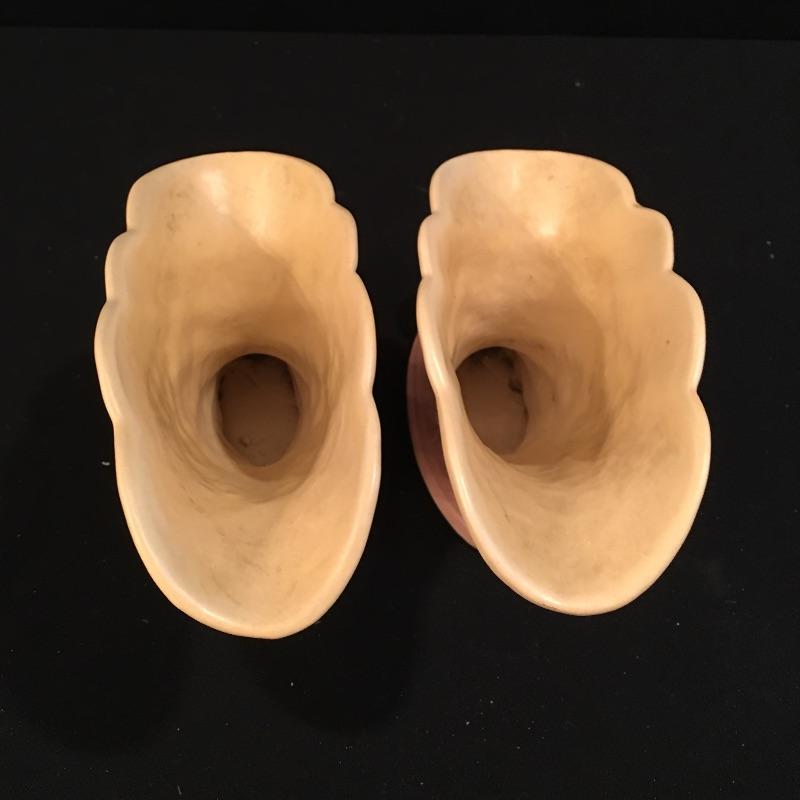 A nice way to add to your collection of Hull pottery is this Vintage Hull Pottery USA multi-color scallop edge cornucopia art vases W-7-7 1/2.
