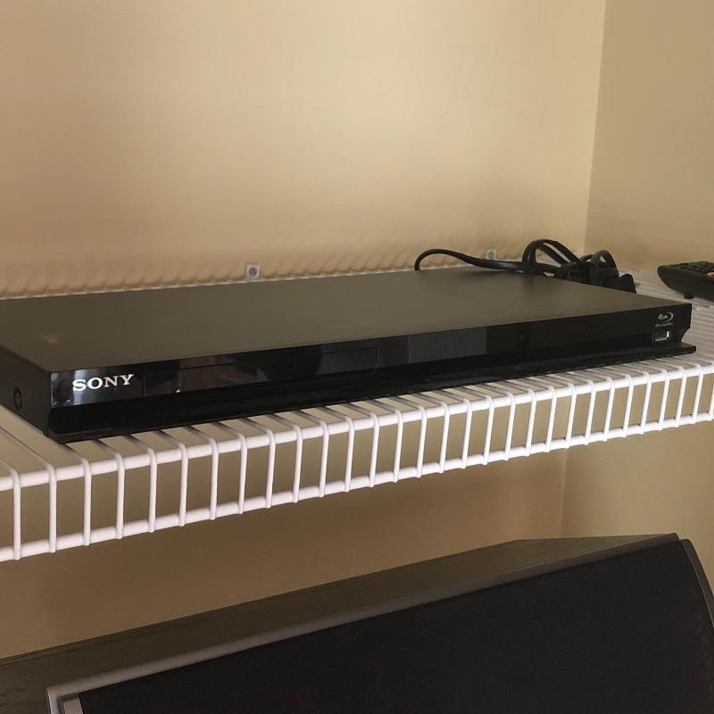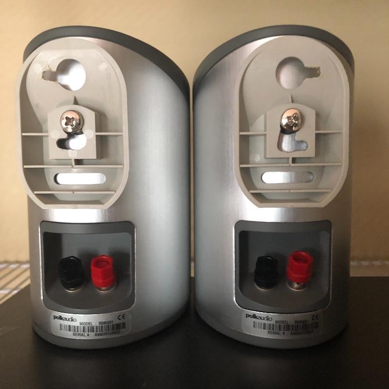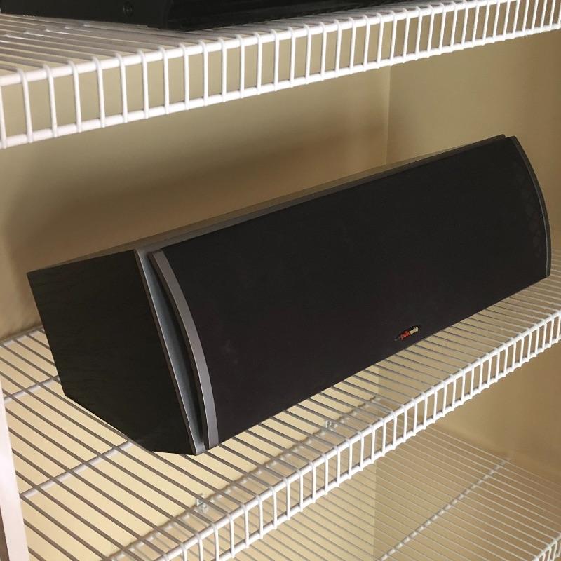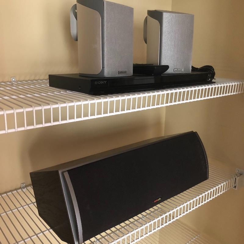 Three Polk Audio speakers here, the large one is a center speaker for your home theater system. The two smaller bookshelf speakers are model RM6801. Lastly we have a Blu Ray disc player with remote, see images for more information.