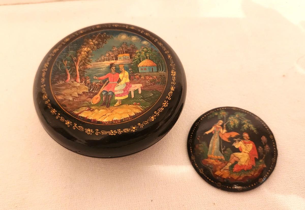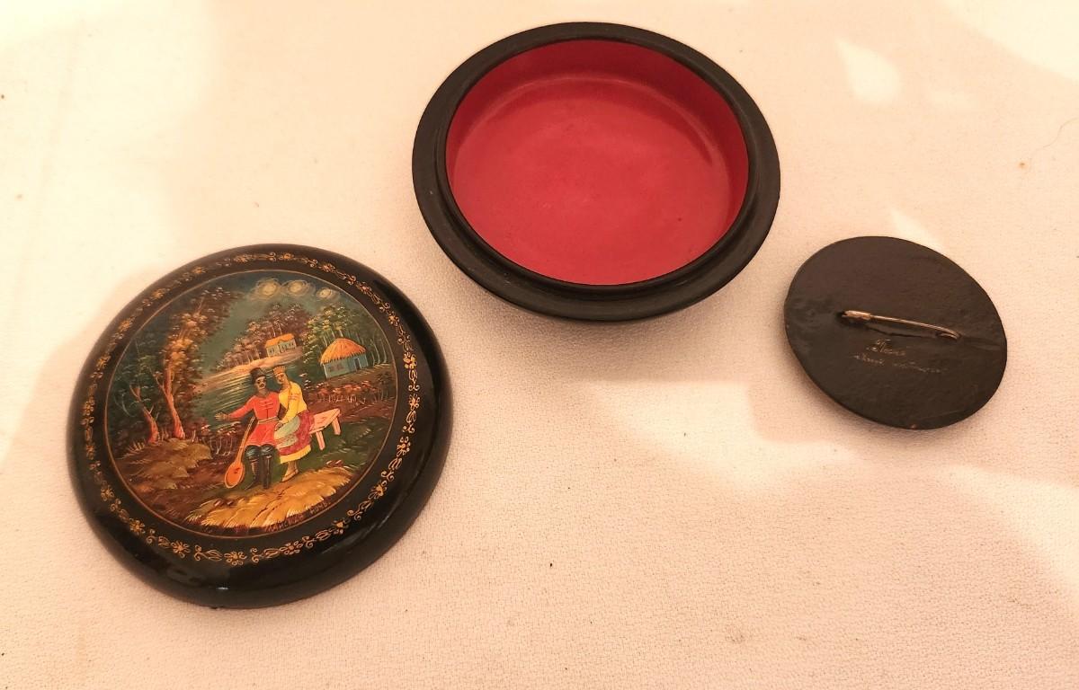 Charming Russian "Fairy Tale" lacquer box - hand painted - with matching brooch. Box 3.5" across, brooch 3" across. Brooch is signed. Both in excellent condition.