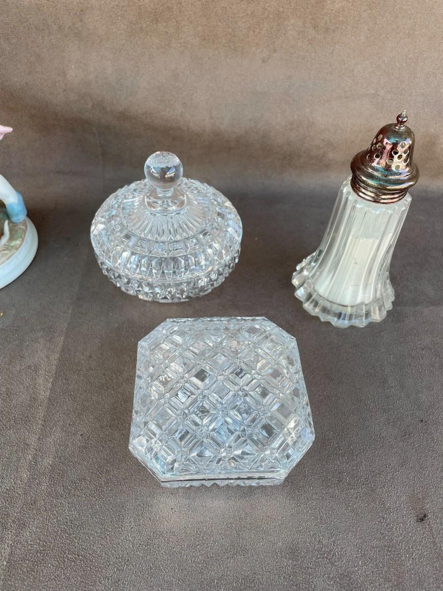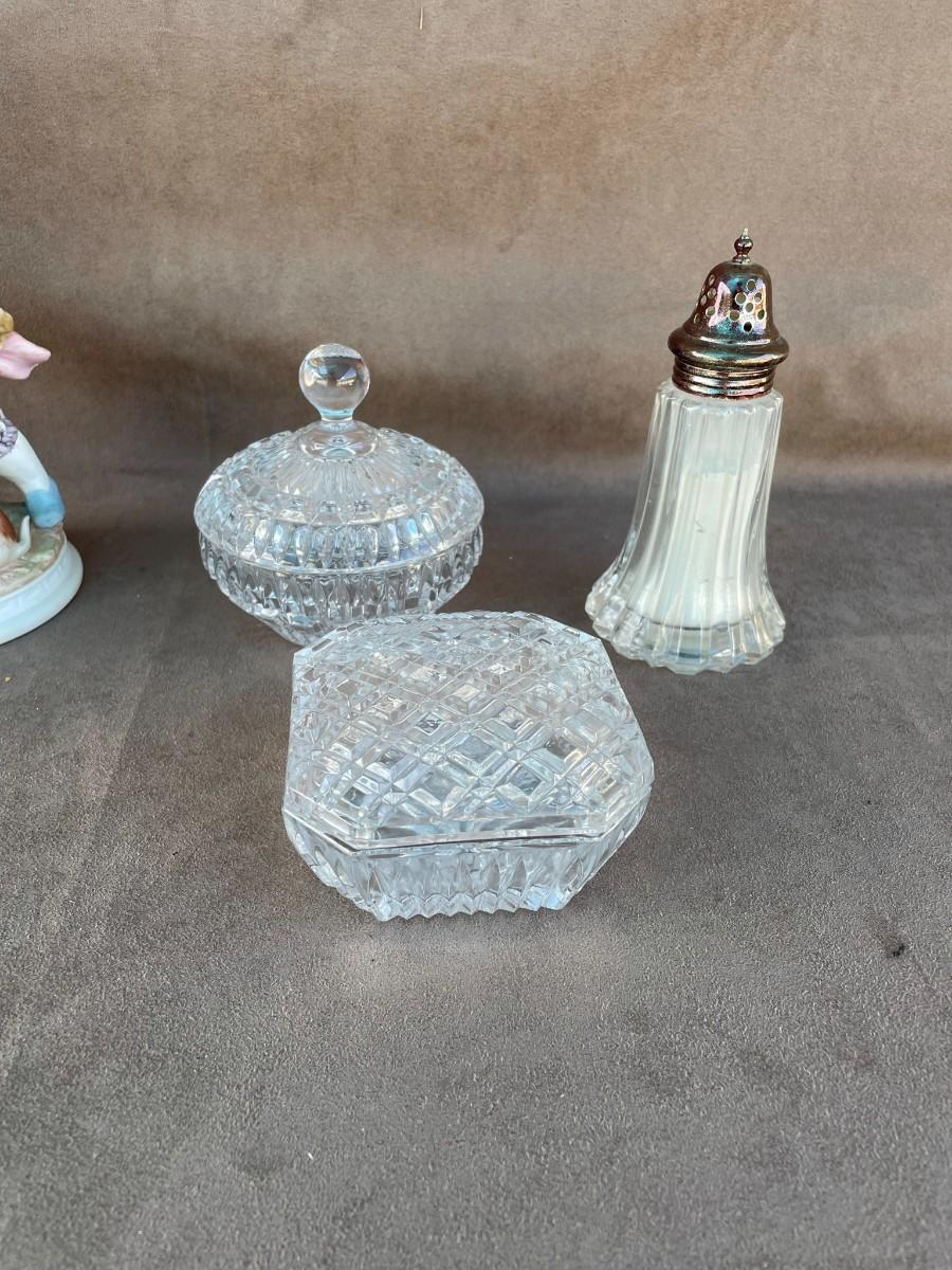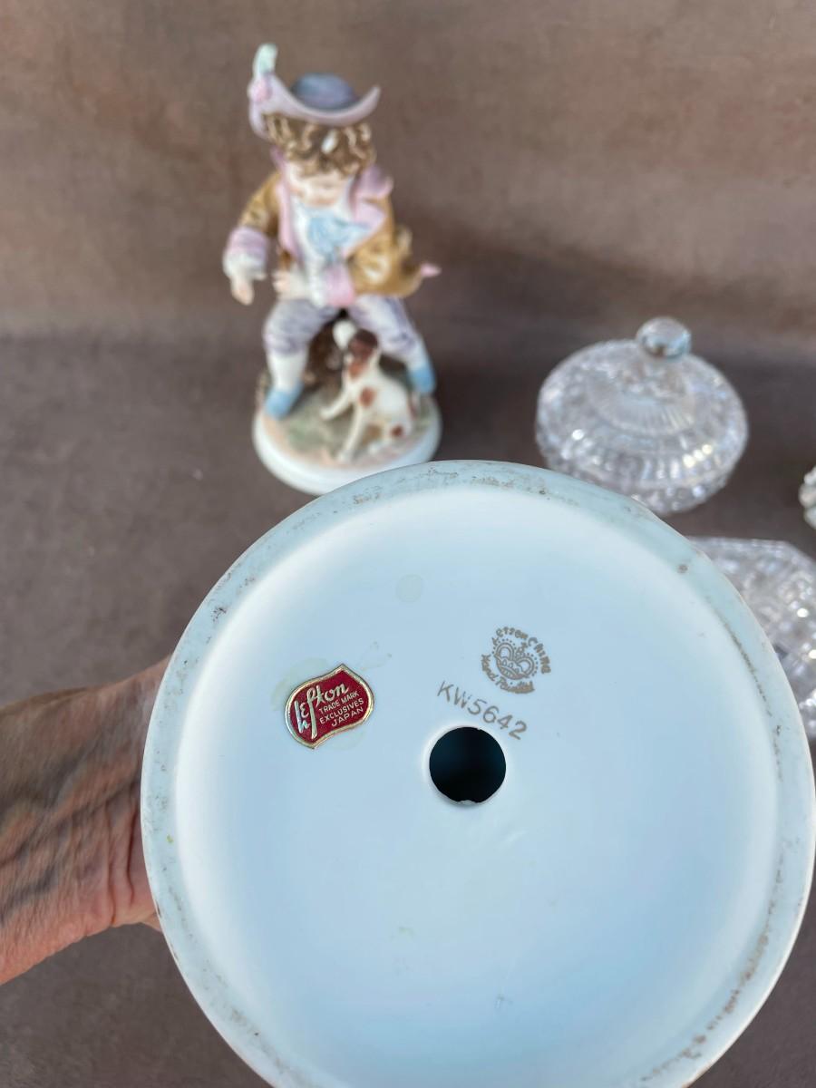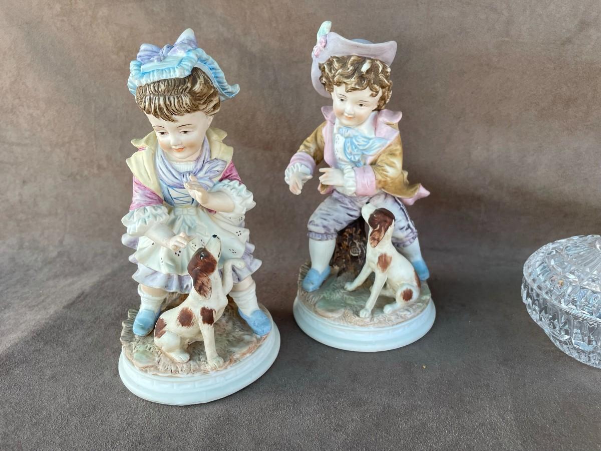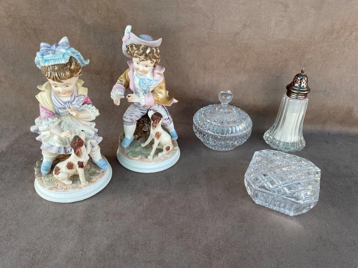 Set of 2 Lefton Porcelain Figurines KW5642 Boy & Girls with Their Dog, two covered trinket dishes and a talc shaker