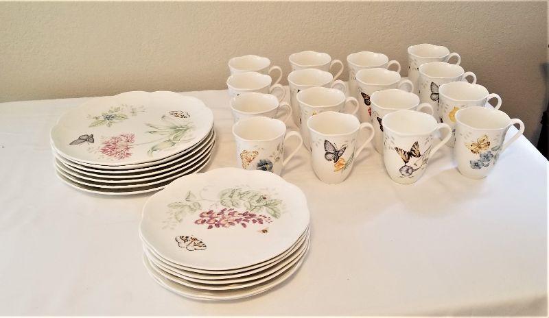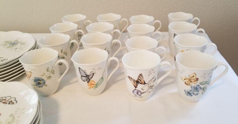 You get all you see here - 16 mugs, 7 salad plates, 7 dinner plates - all in the Lenox "Butterfly Meadow" pattern. Plates are 11" across. Good condition.