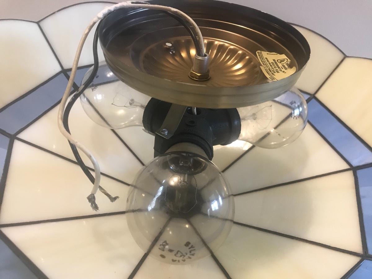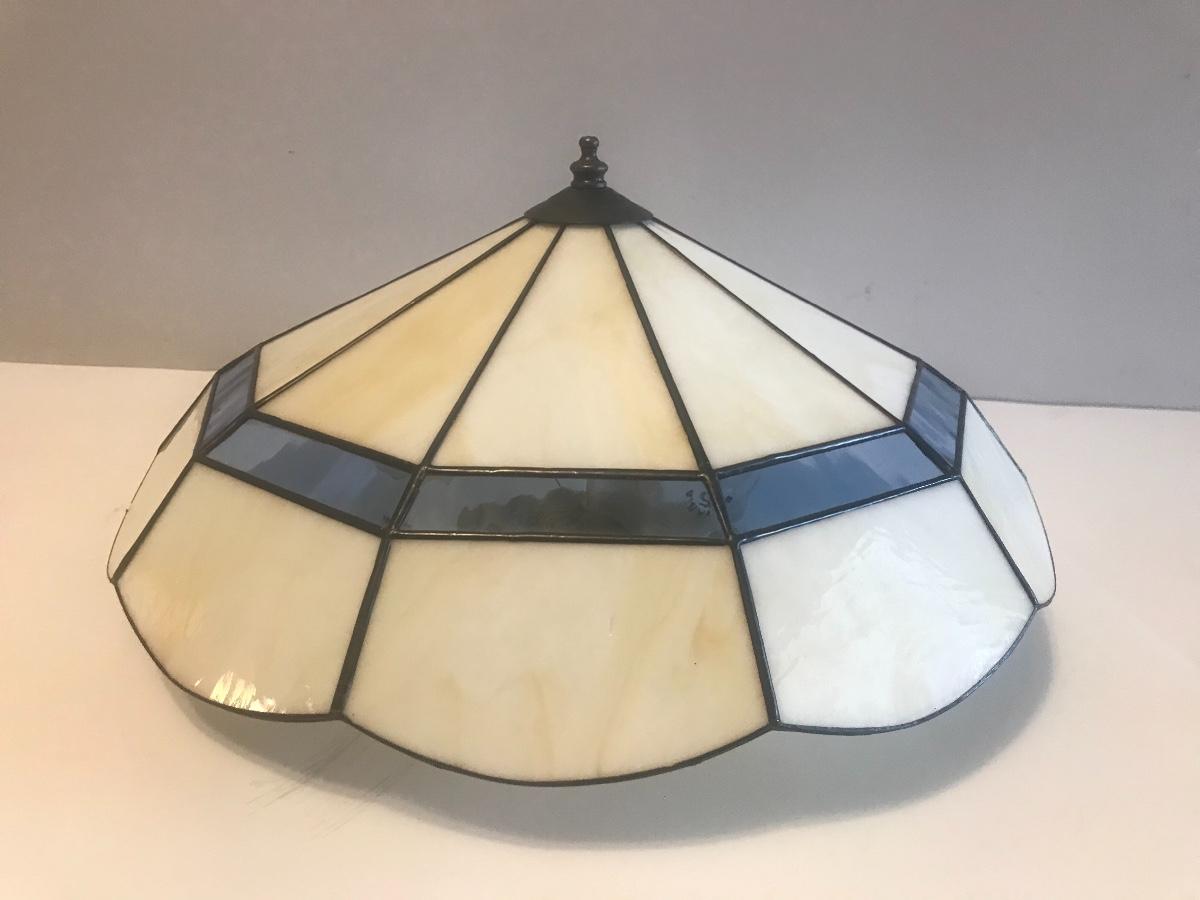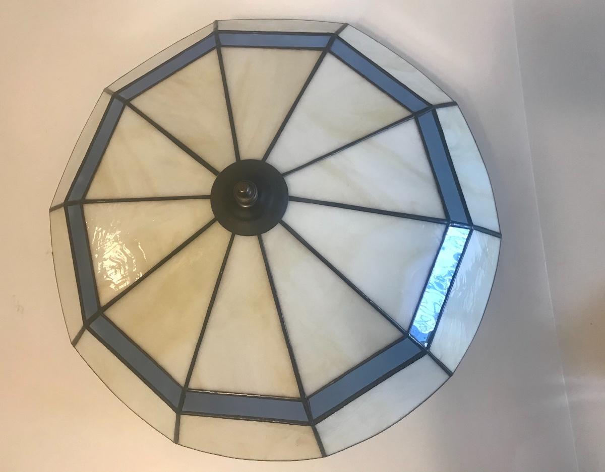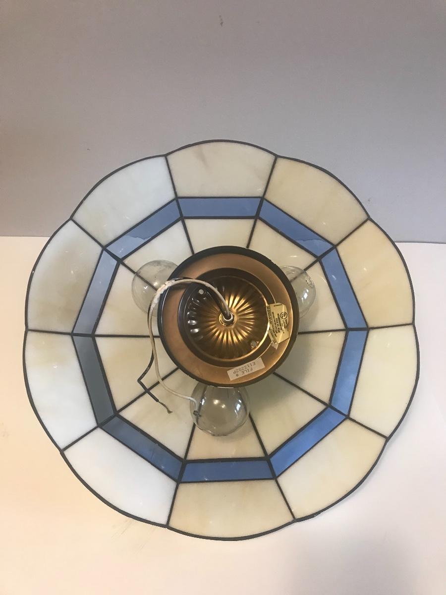 Ceiling light made with stained glass, ivory and blue. Stunning when lit. Includes hardware. Please see all pictures for