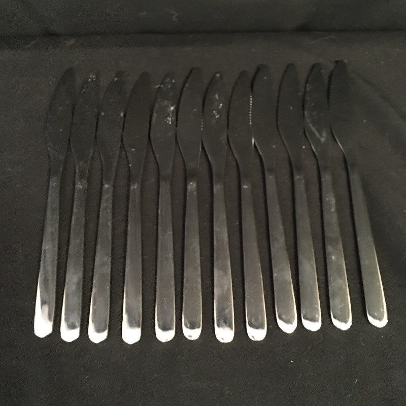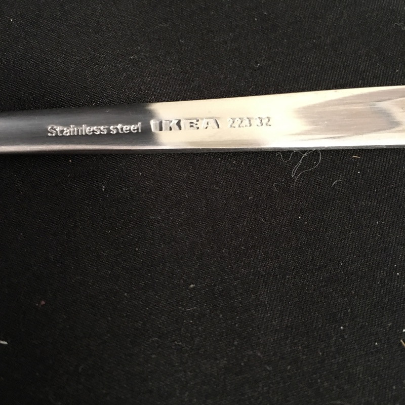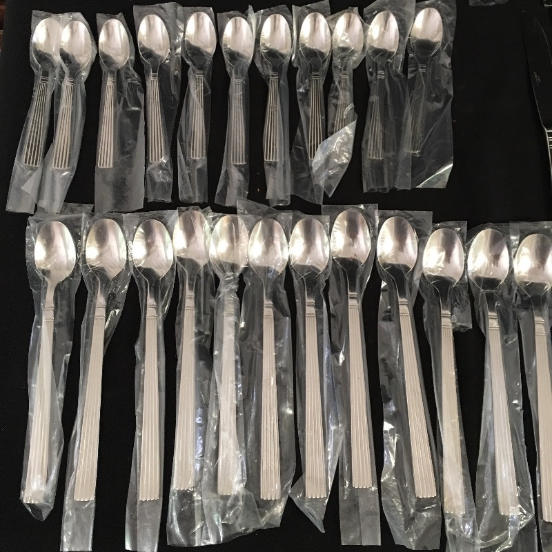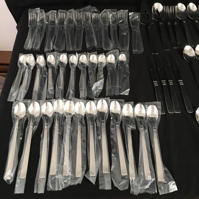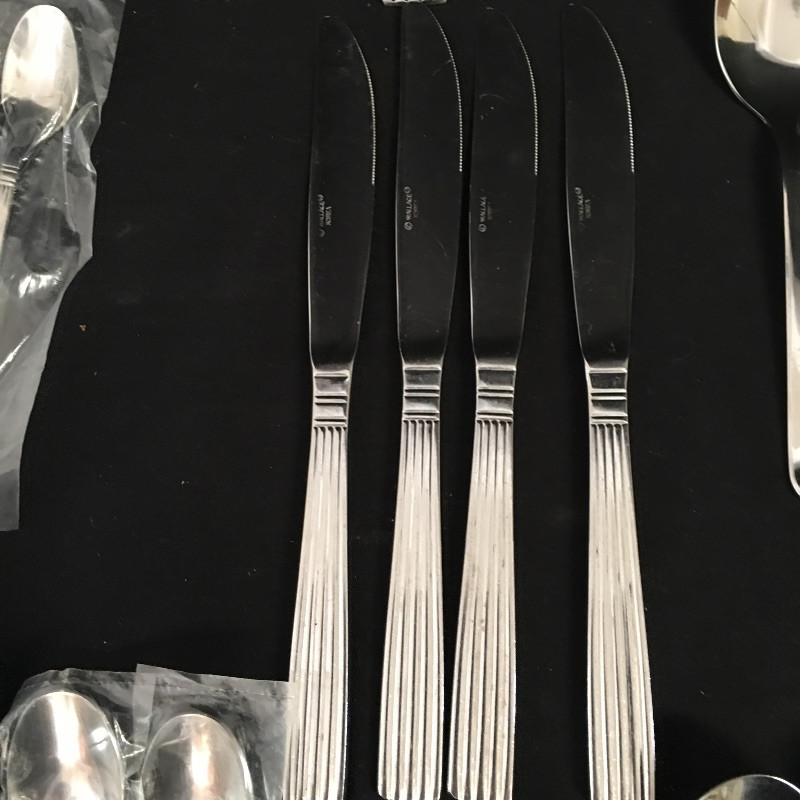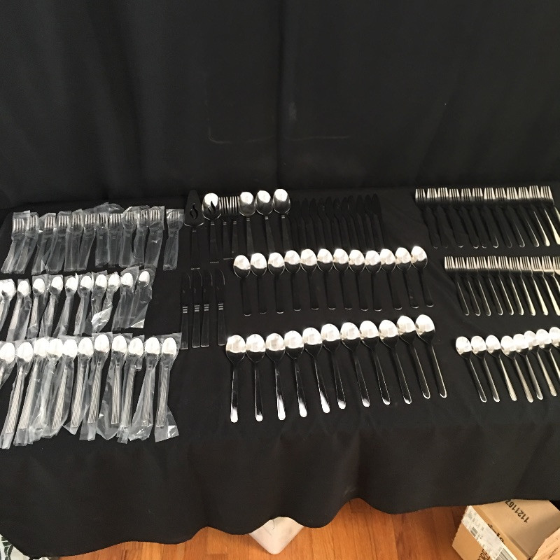 Not one, but two sets of stainless steel flatware that includes an IKEA flatware set that is six piece, eleven place settings with a few extras and a Wallace set that is incomplete with eleven small spoons, twelve tea spoons, twelve forks all in plastic and then three spoons, two forks, four knives and two serving tools.
