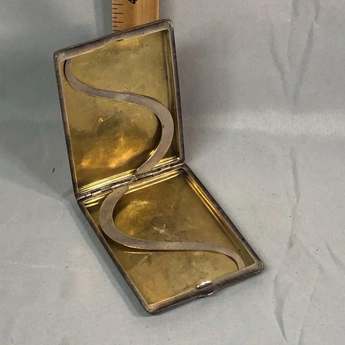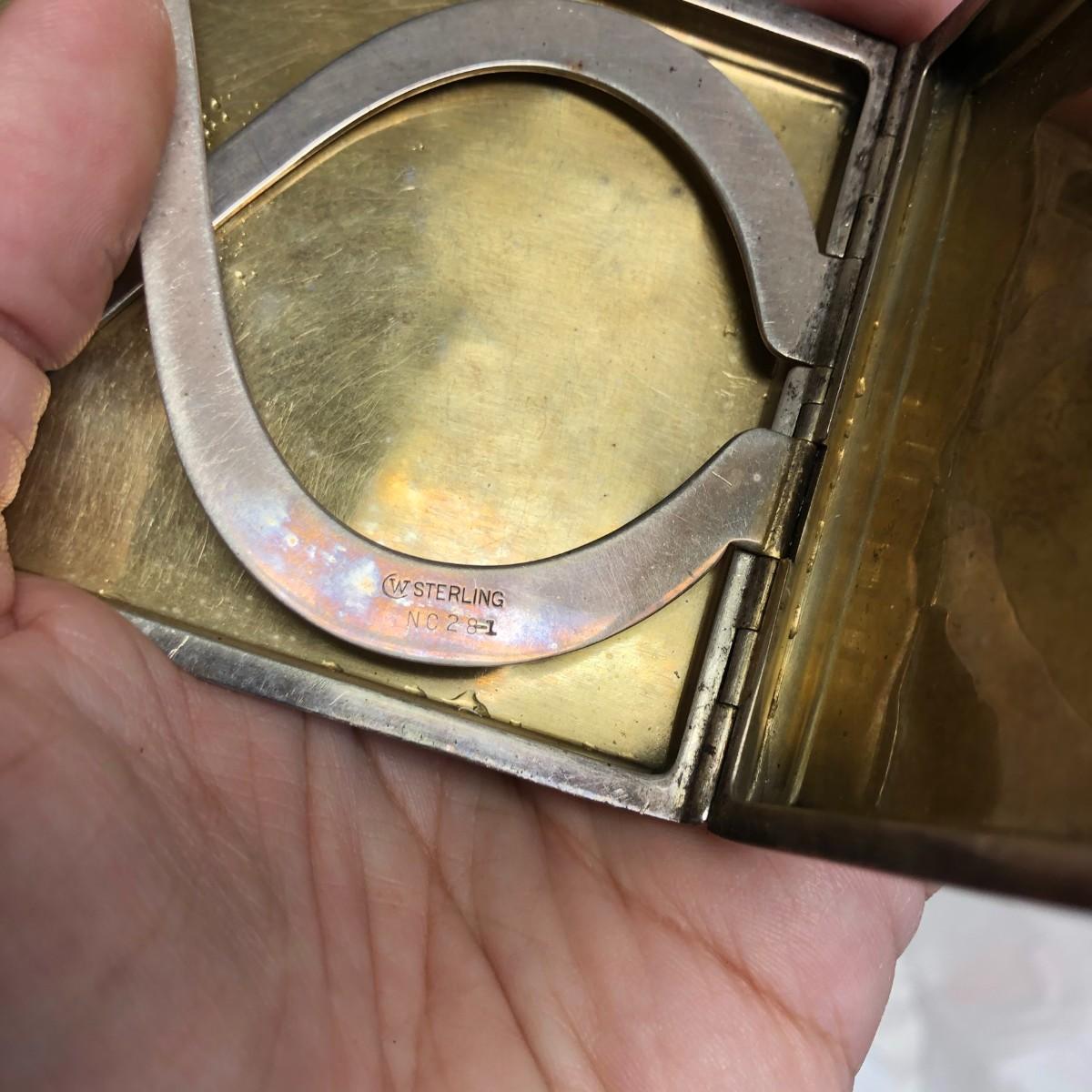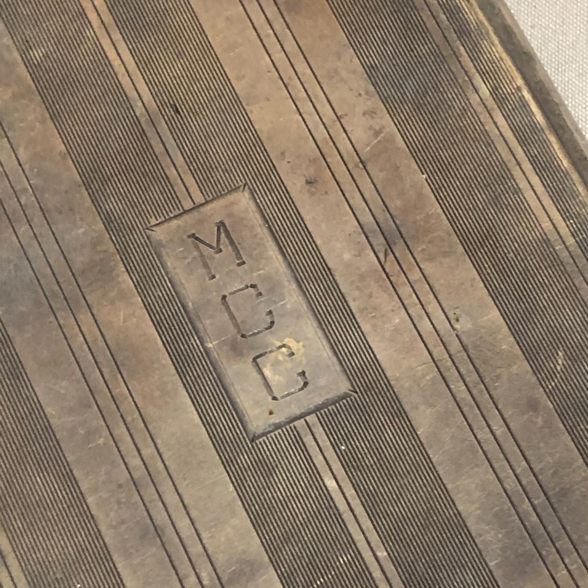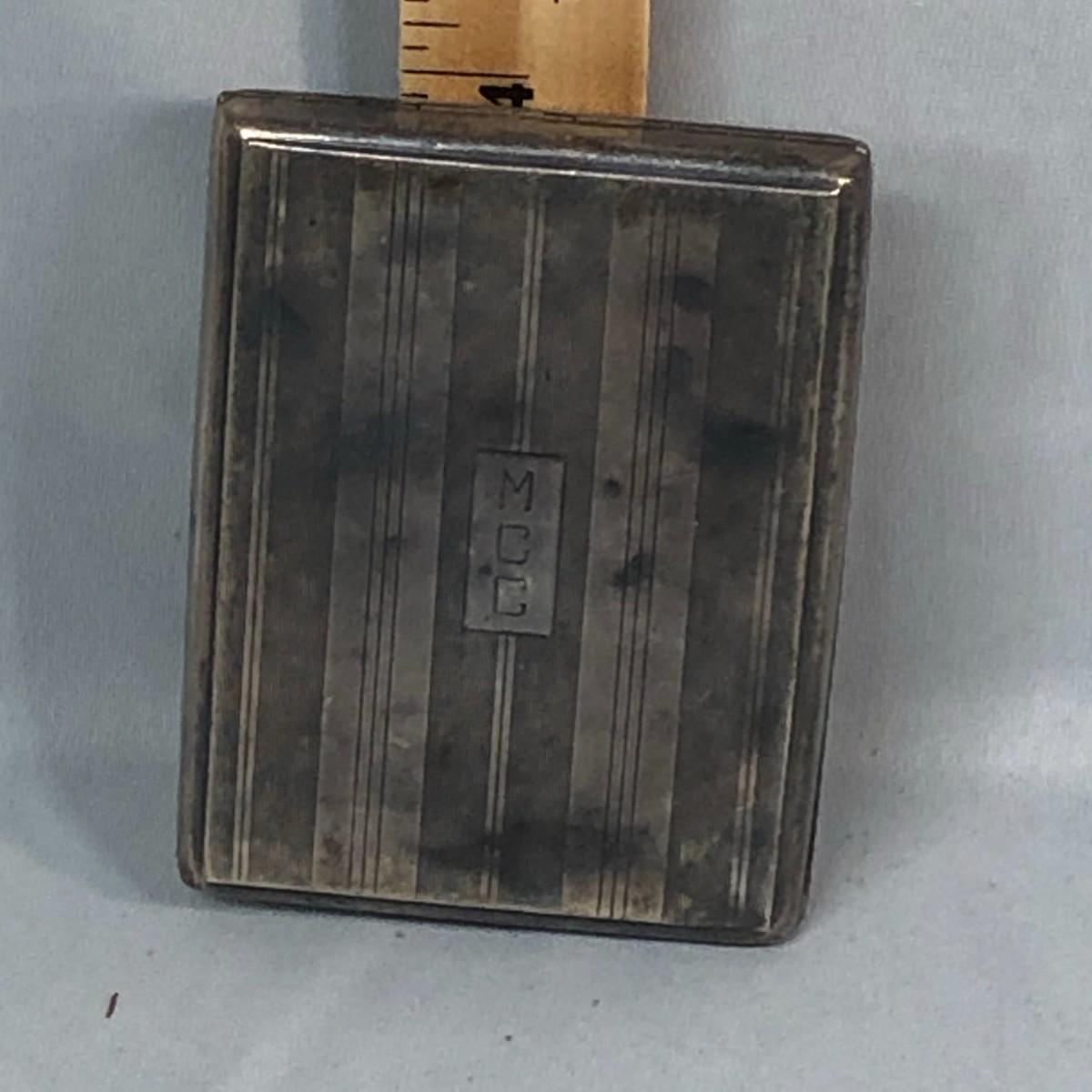 There are some faint dings on this, but it is still in overall great condition. It is monogrammed "MCG" and one of the internal prongs is marked Sterling Silver.