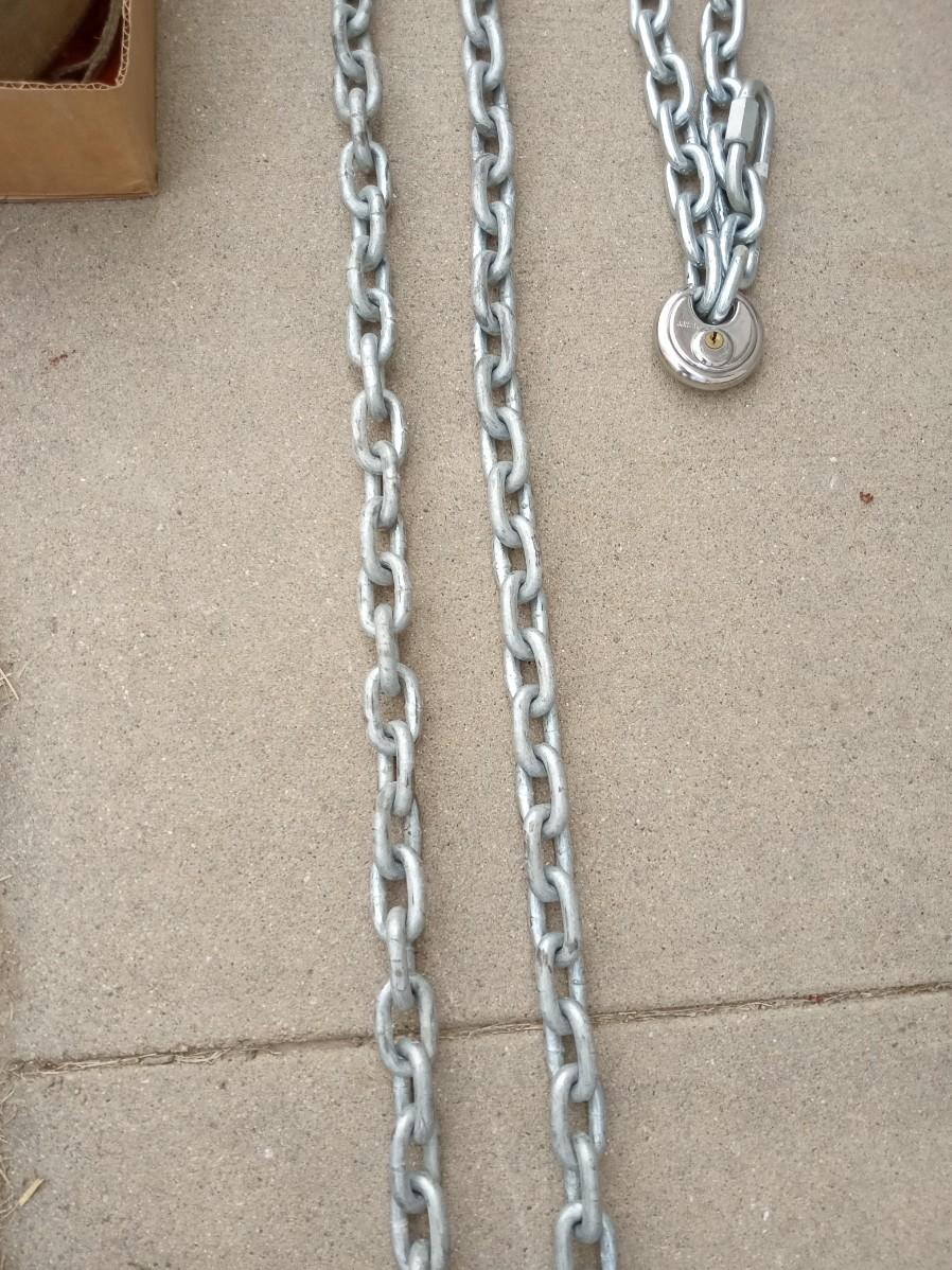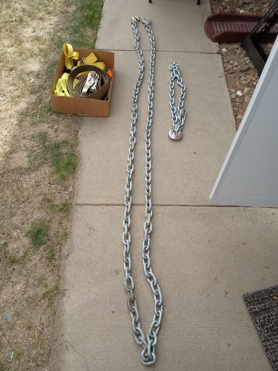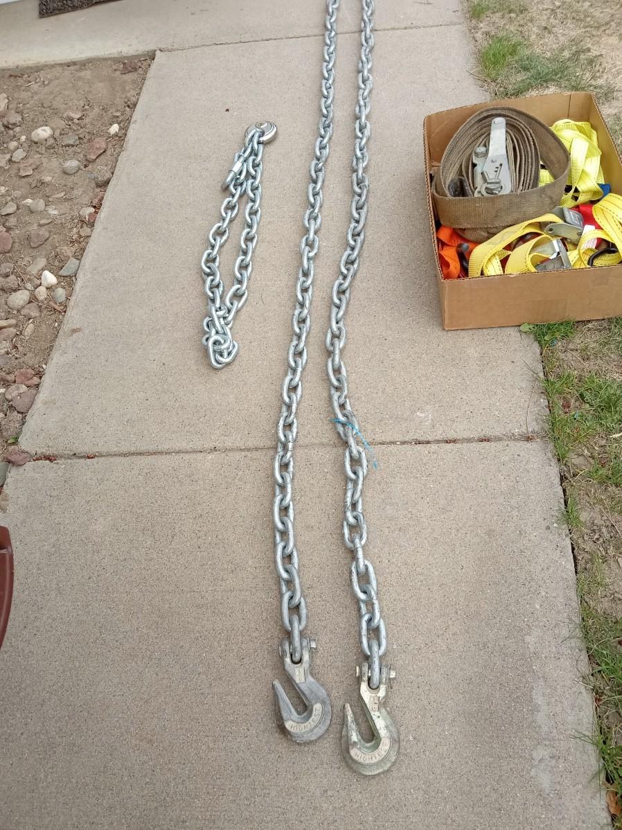 14 FT TOW CHAIN, ANOTHER CHAIN WITH A LOCK THAT HAS NO KEY AND AT LEAST 2 COMPLETE RATCHET STRAPS AND PARTS OF OTHER ONES