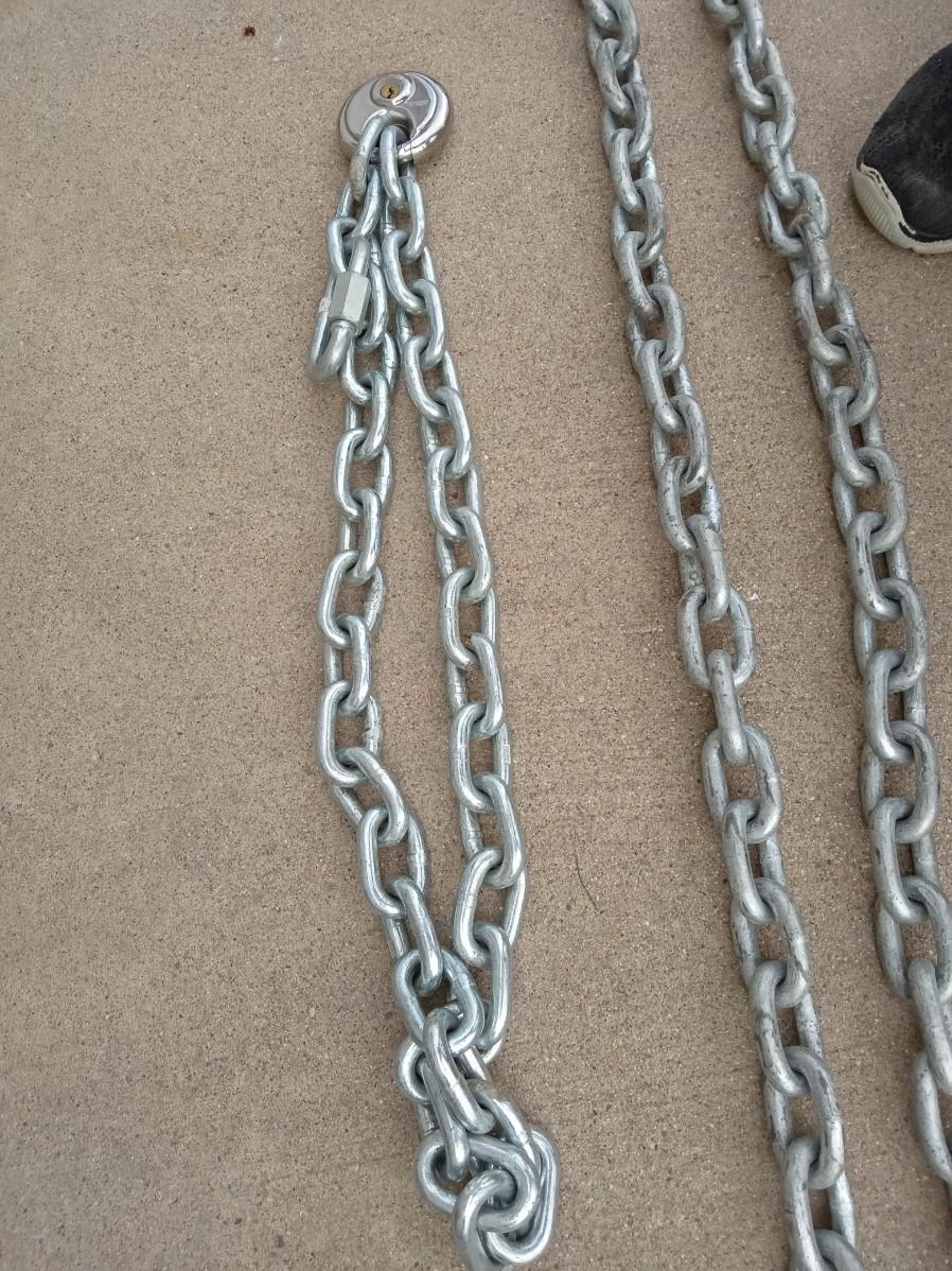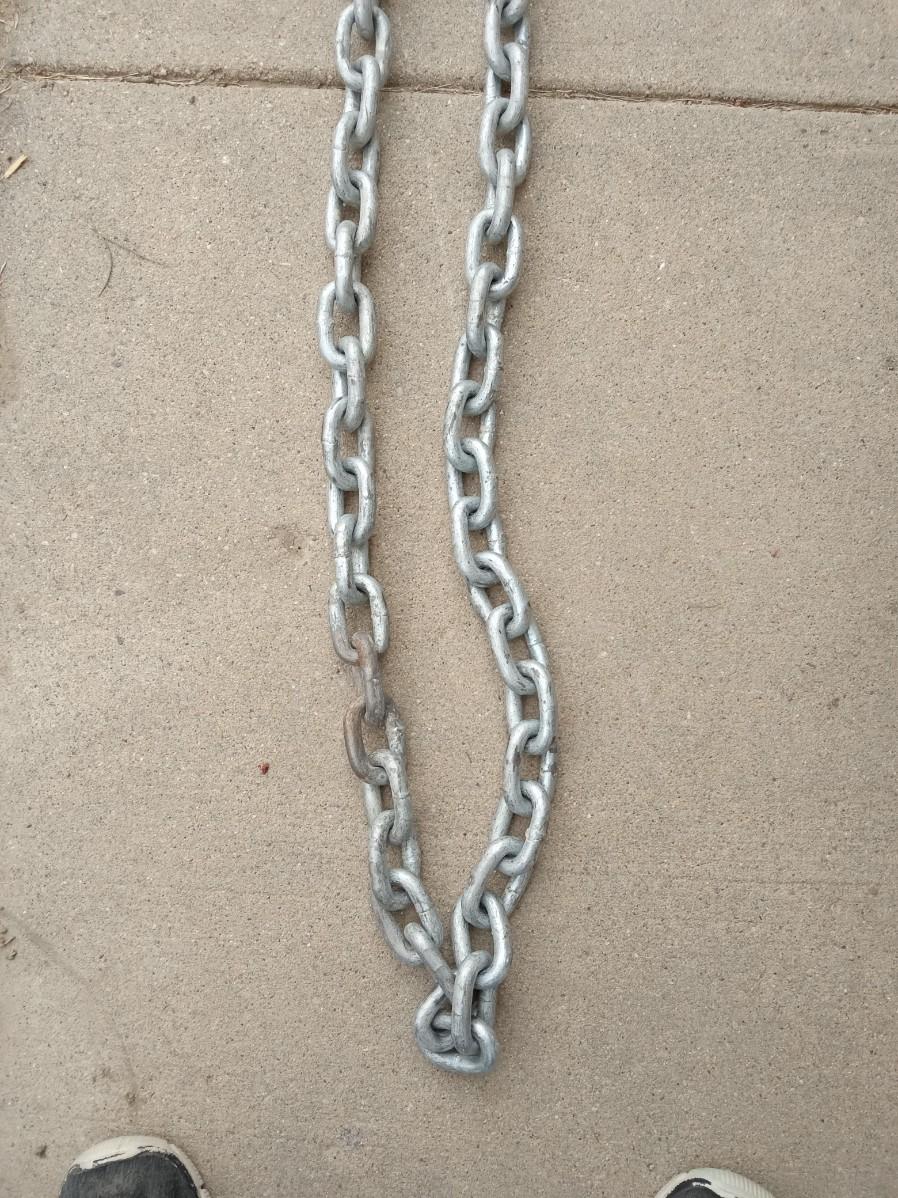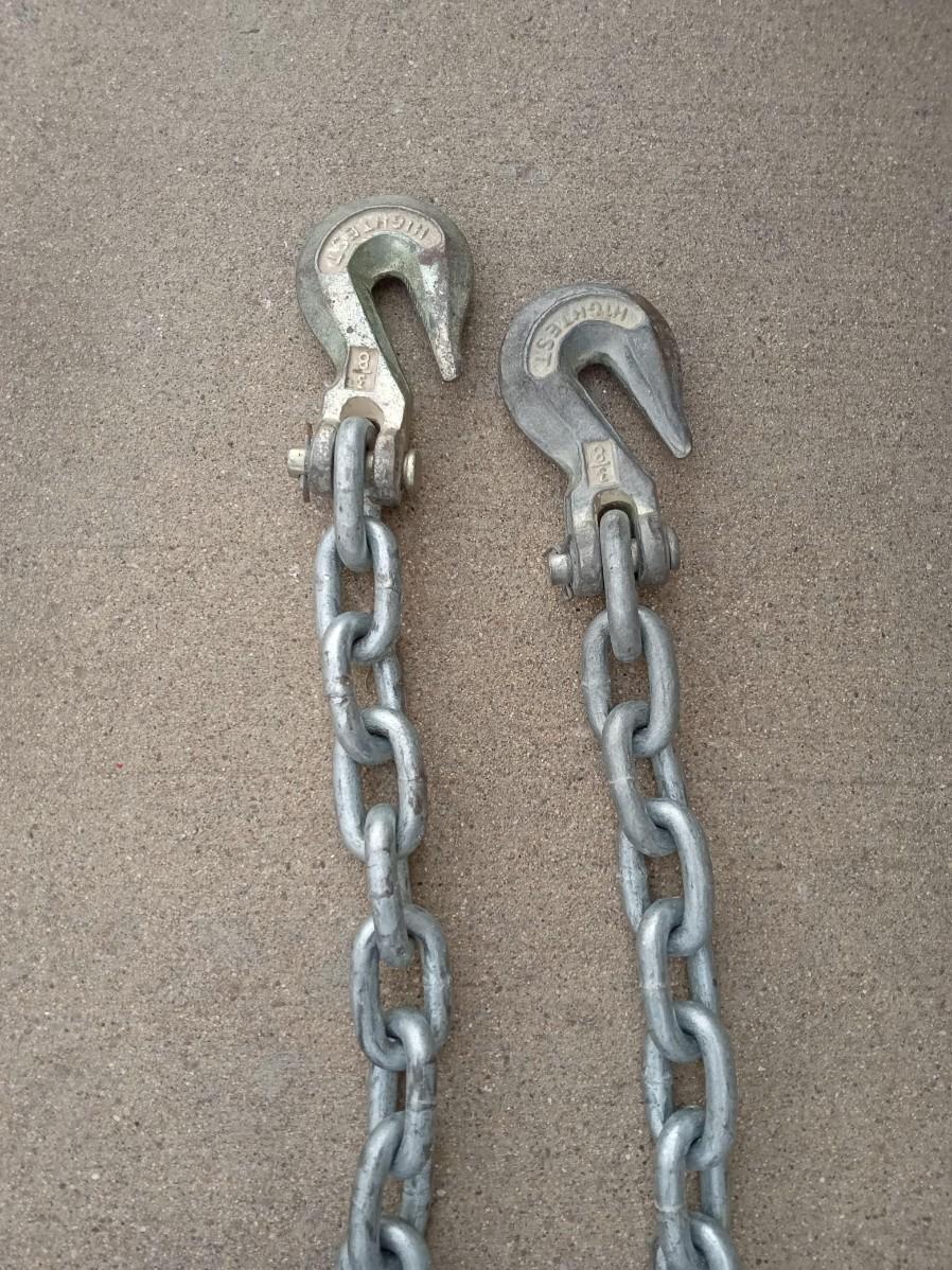 14 FT TOW CHAIN, ANOTHER CHAIN WITH A LOCK THAT HAS NO KEY AND AT LEAST 2 COMPLETE RATCHET STRAPS AND PARTS OF OTHER ONES