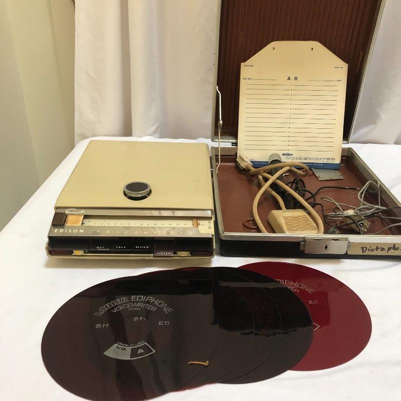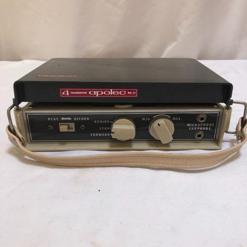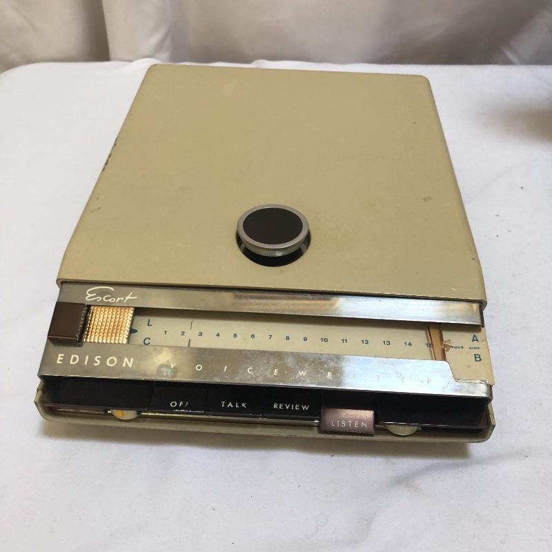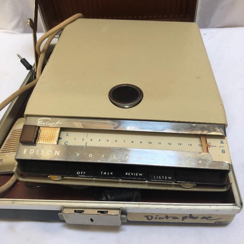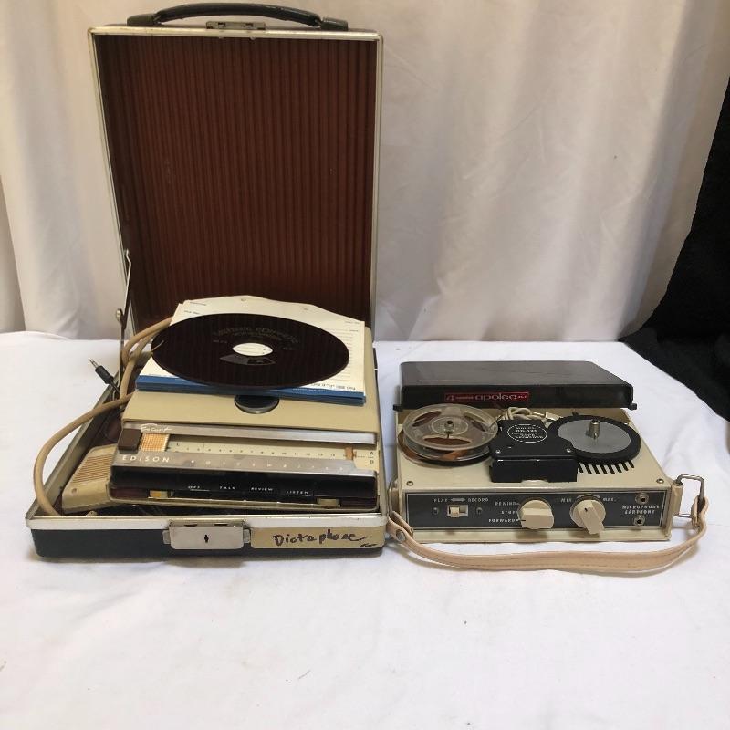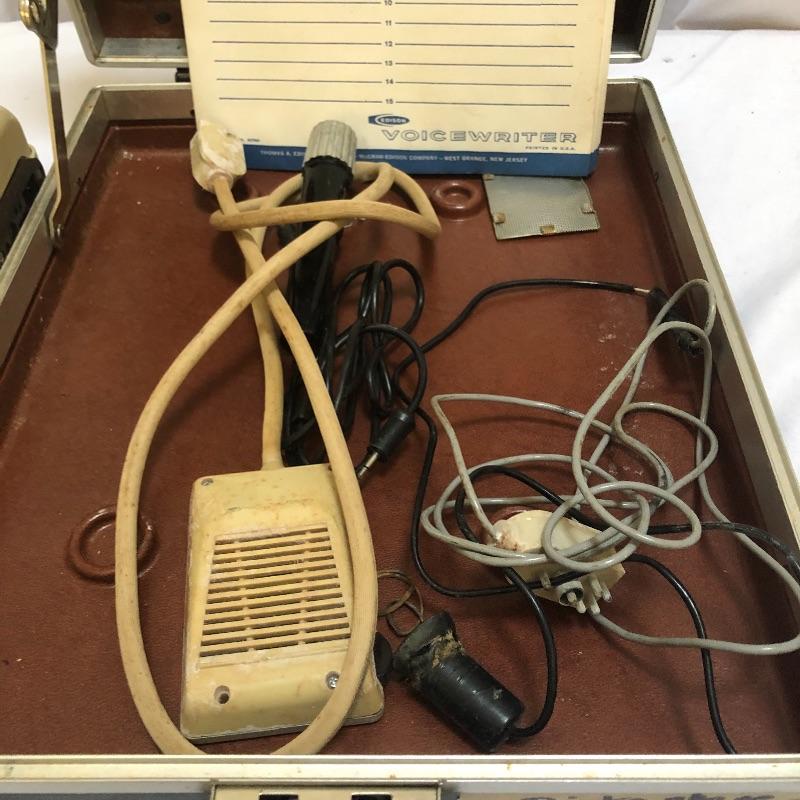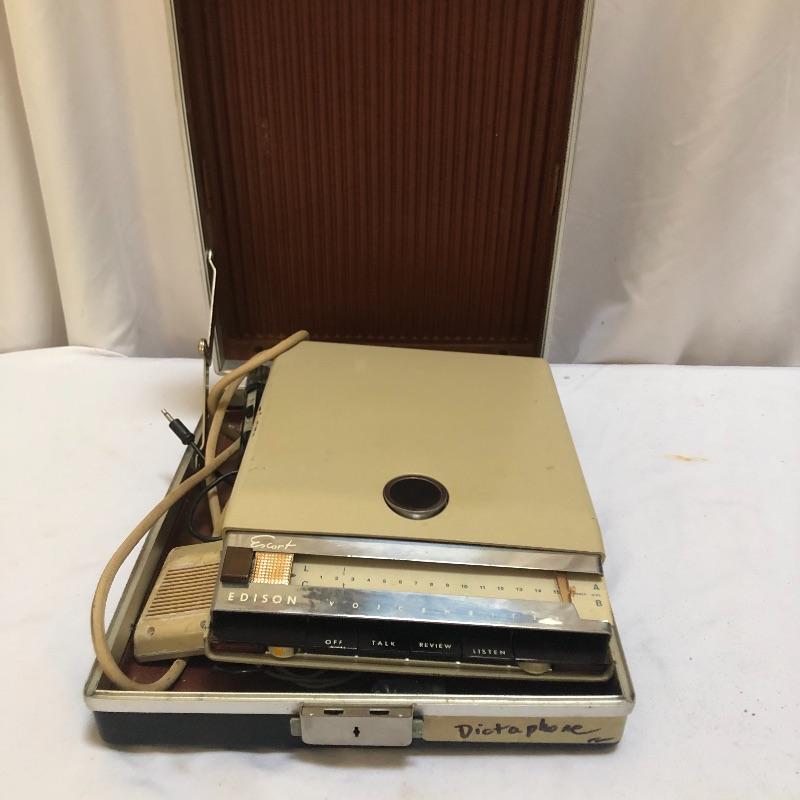 A great find for the lover of vintage recorders. Lot includes Edison Escort Voicewriter with case and accoutrements and a Apolec model # RK-125 transistor tape recorder with microphone. Both items were not tested as they need batteries and battery compartments are screwed on. Cords are slightly dirty but can easily be cleaned off.