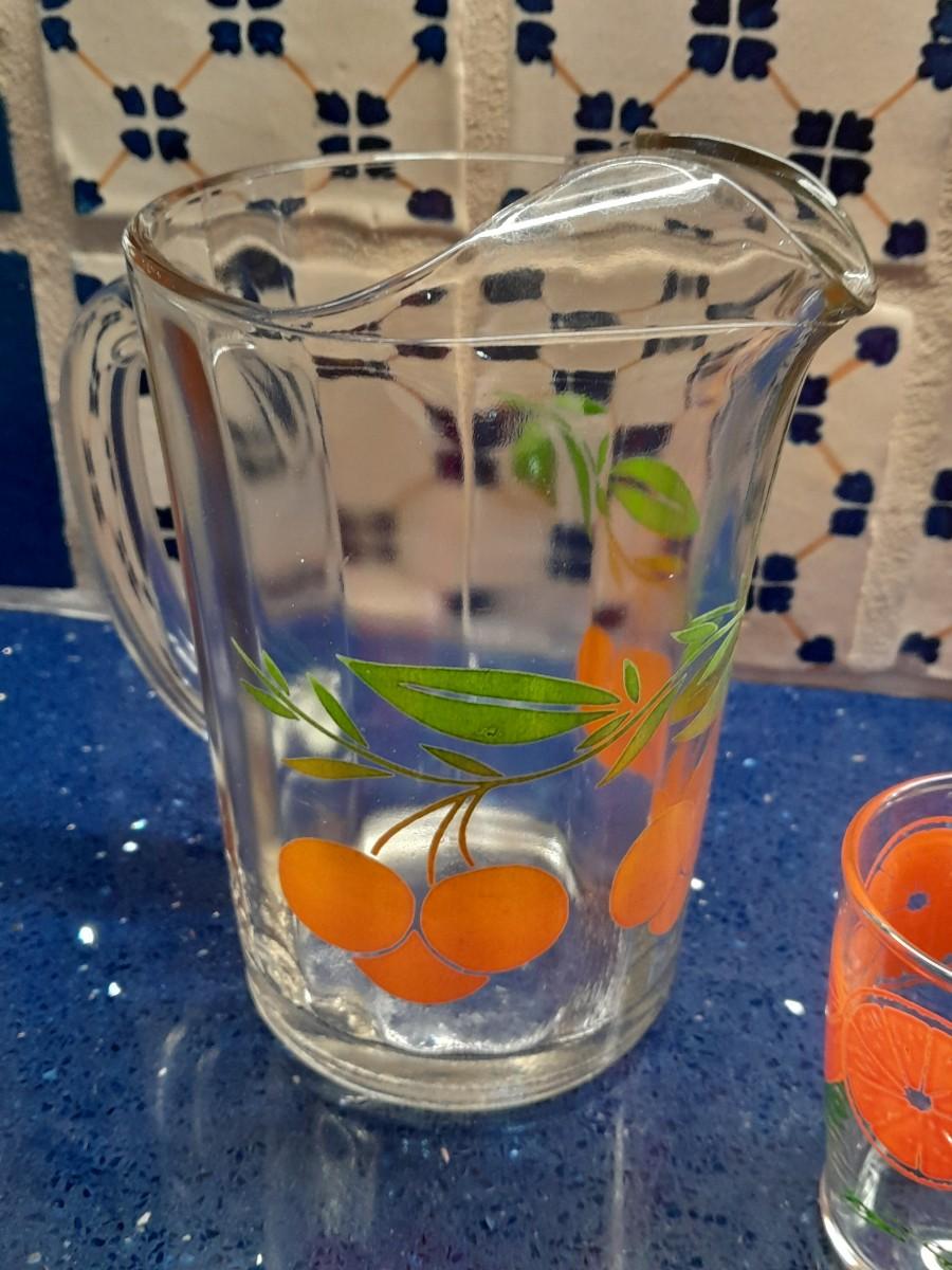 LOT 47 VINTAGE JUICE PITCHER AND GLASSES AND FRUIT SHAPED DISHES