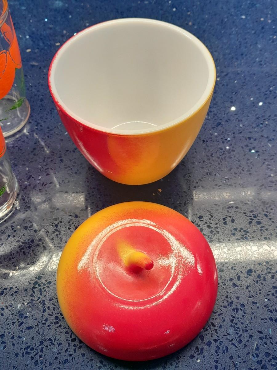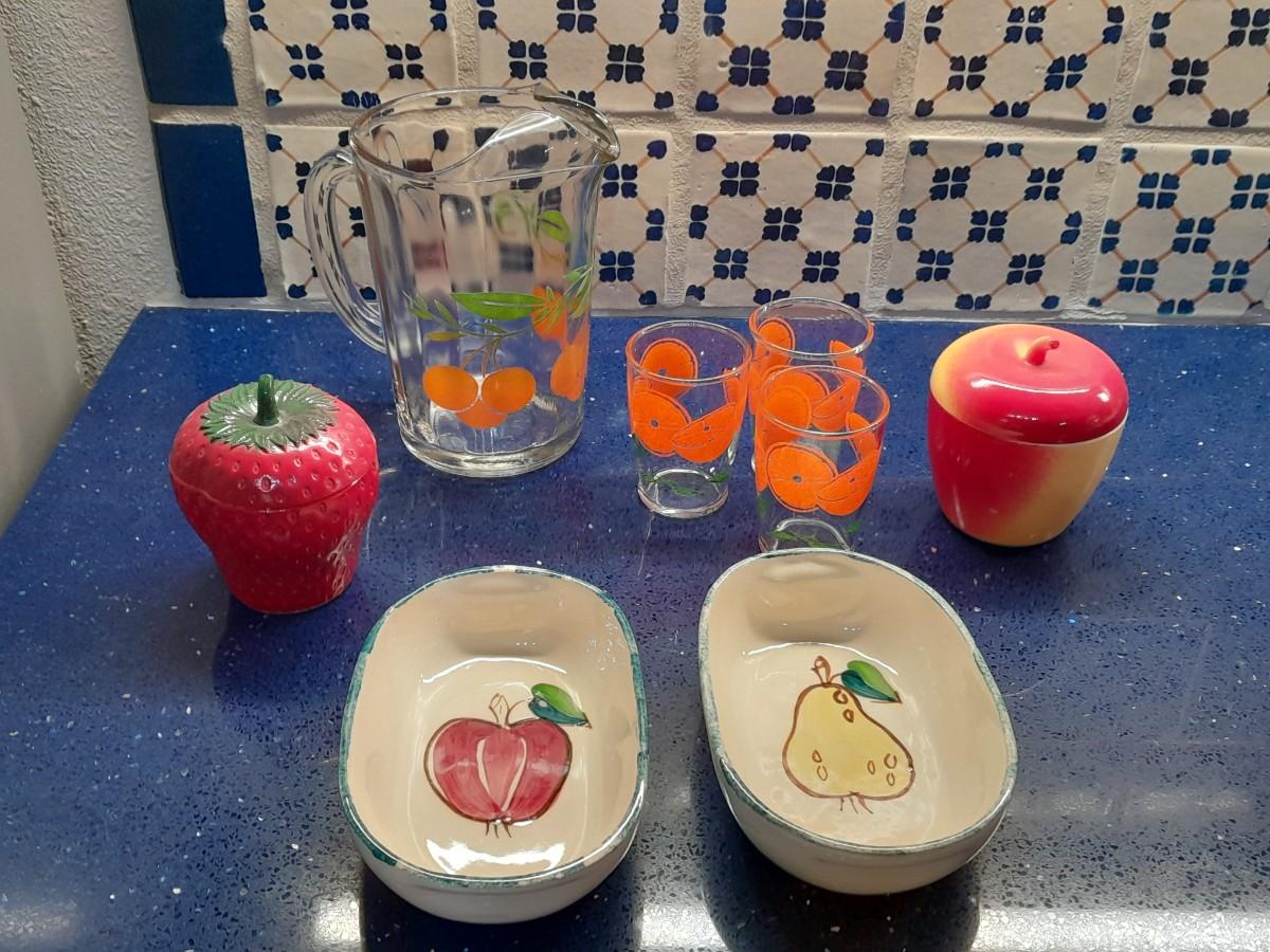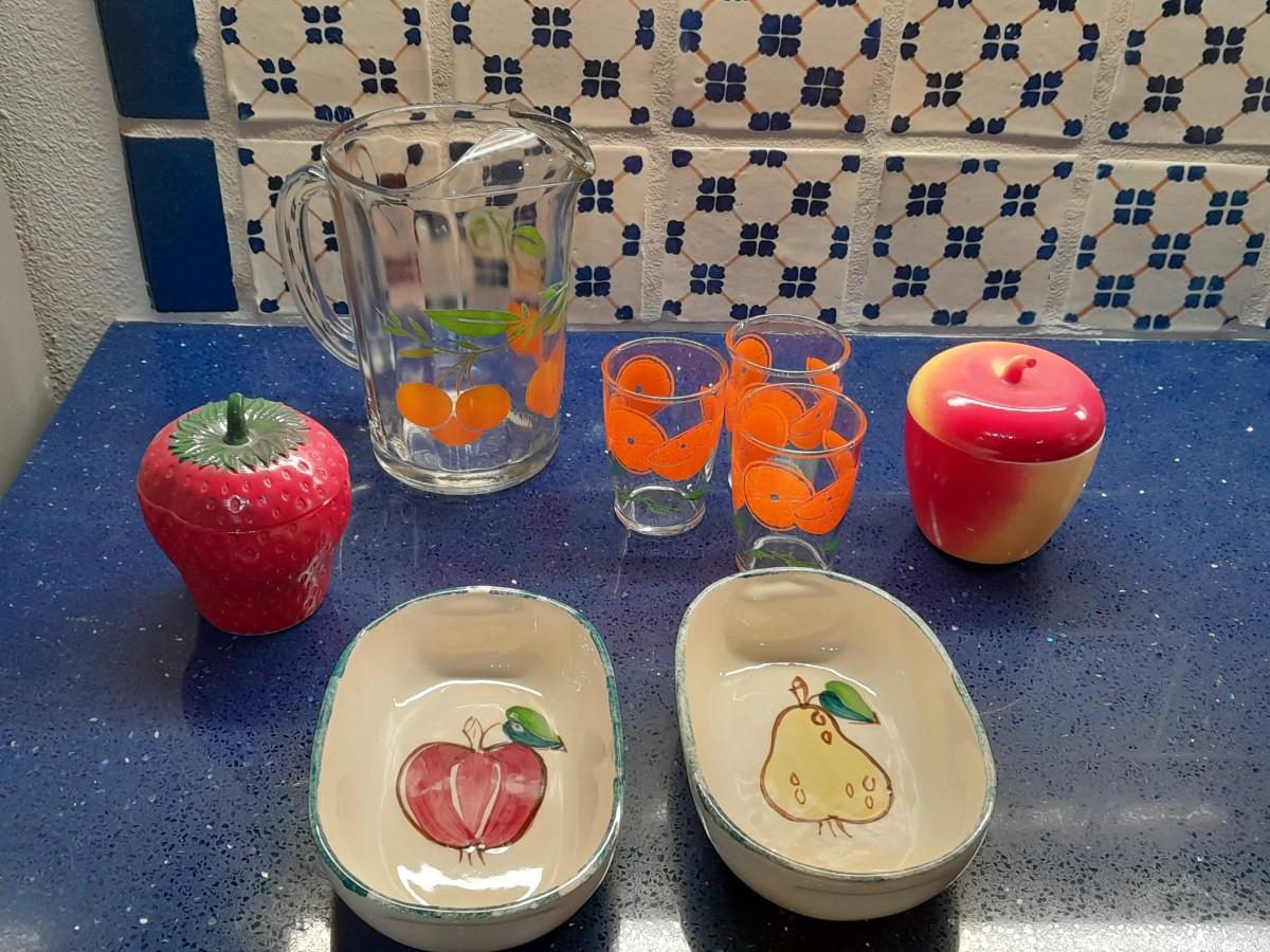 VINTAGE JUICE PITCHER AND GLASSES WITH FRUIT SHAPED, LIDDED DISHES