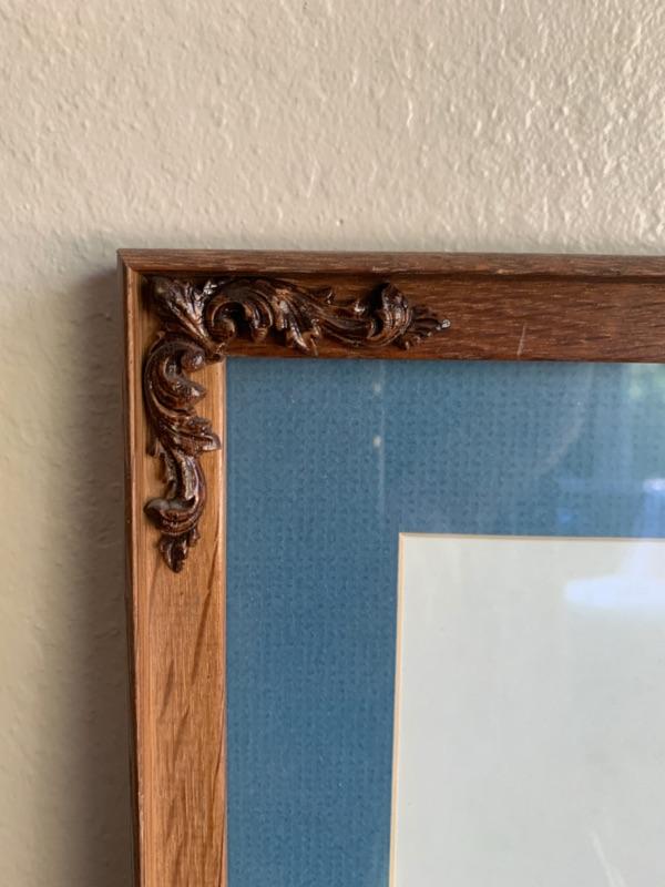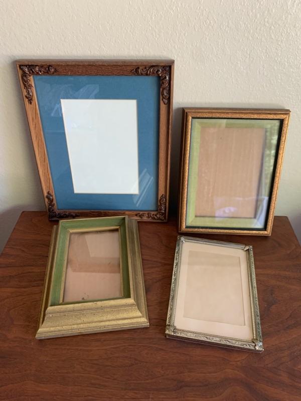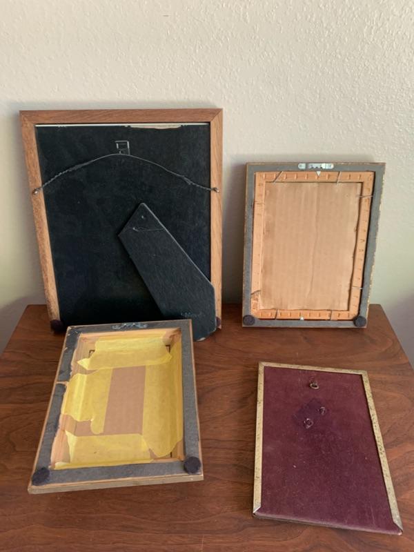 5" x 7 metal frame, 4 1/4" x 6 1/4" wood frame, 3 1/2" x 5 1/2" wood and 4 3/4" x 6 1/2" wood with blue mat. All have glass and backing, minimal wear.
