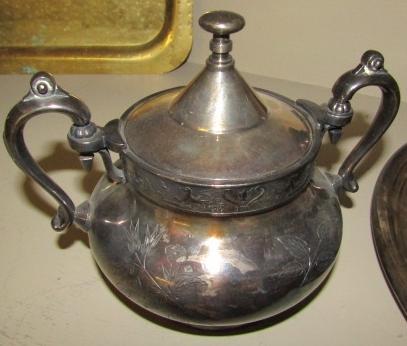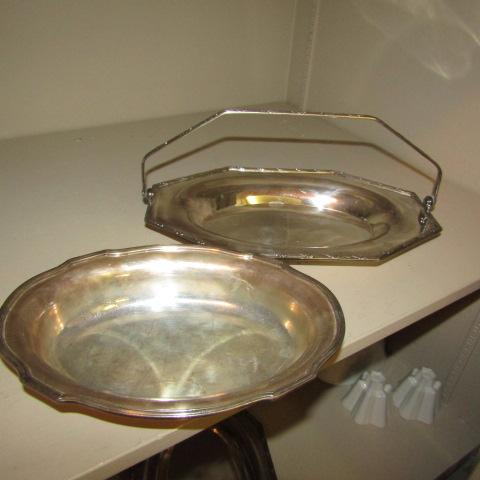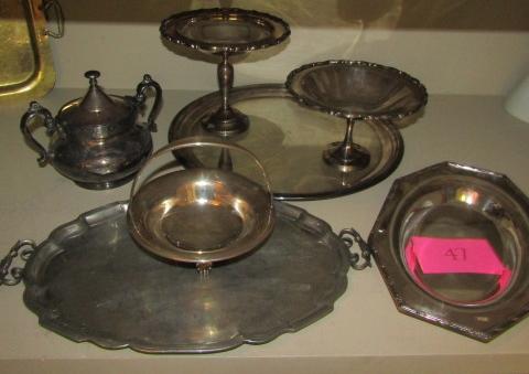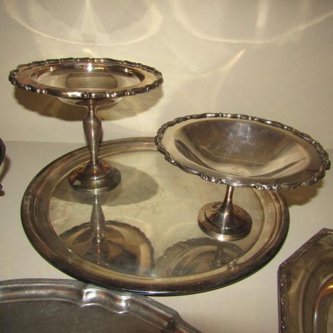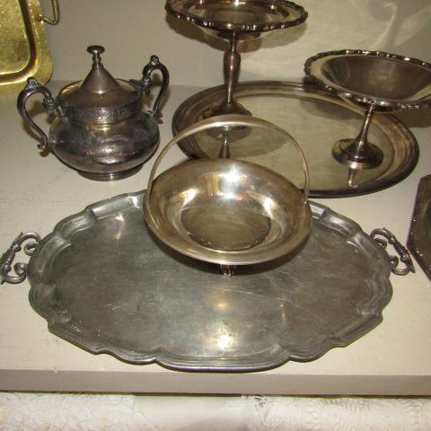 2 PLATTERS, 2 STEMMED NUT/CANDY DISHES, SUGAR BOWL W/LID, BOWL W/HANDLE AND RELISH DISH