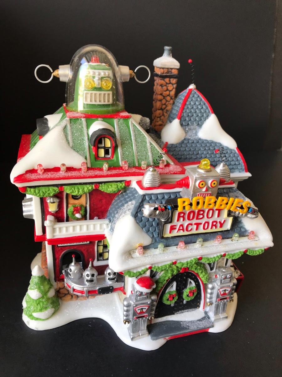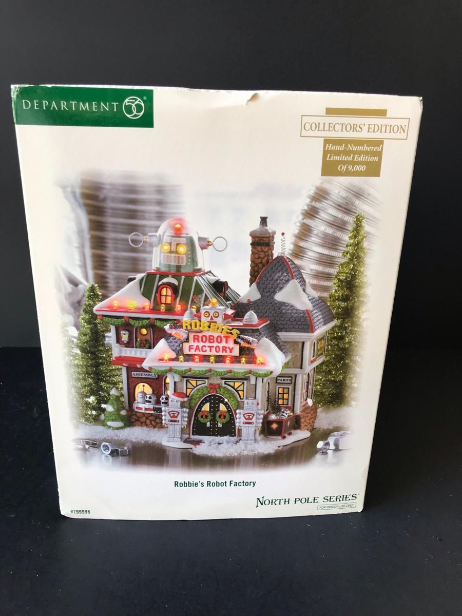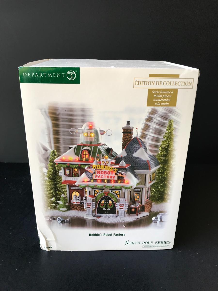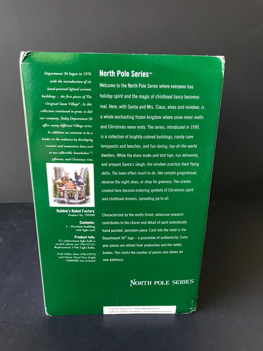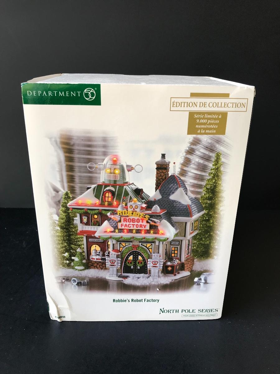 Robbie's Robot Factory - Department 56 - North Pole Series. All Holiday items in this auction are as-seen. The client collected a lot of holiday pieces and some are new in box, some were displayed once and come with original box, and some have been displayed and come with no box. They are all pre-owned in some fashion and have been stored in an attic or on shelf in library. Please see all pictures. The pictures show condition, measurements if taken, and what is included in the lot. Due to the large amount that we photograph and the time frame, we are not always able to take measurements. All items unless noted, are pre-owned and have been used. Thank you