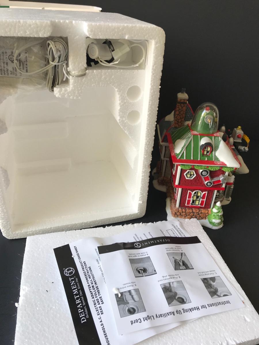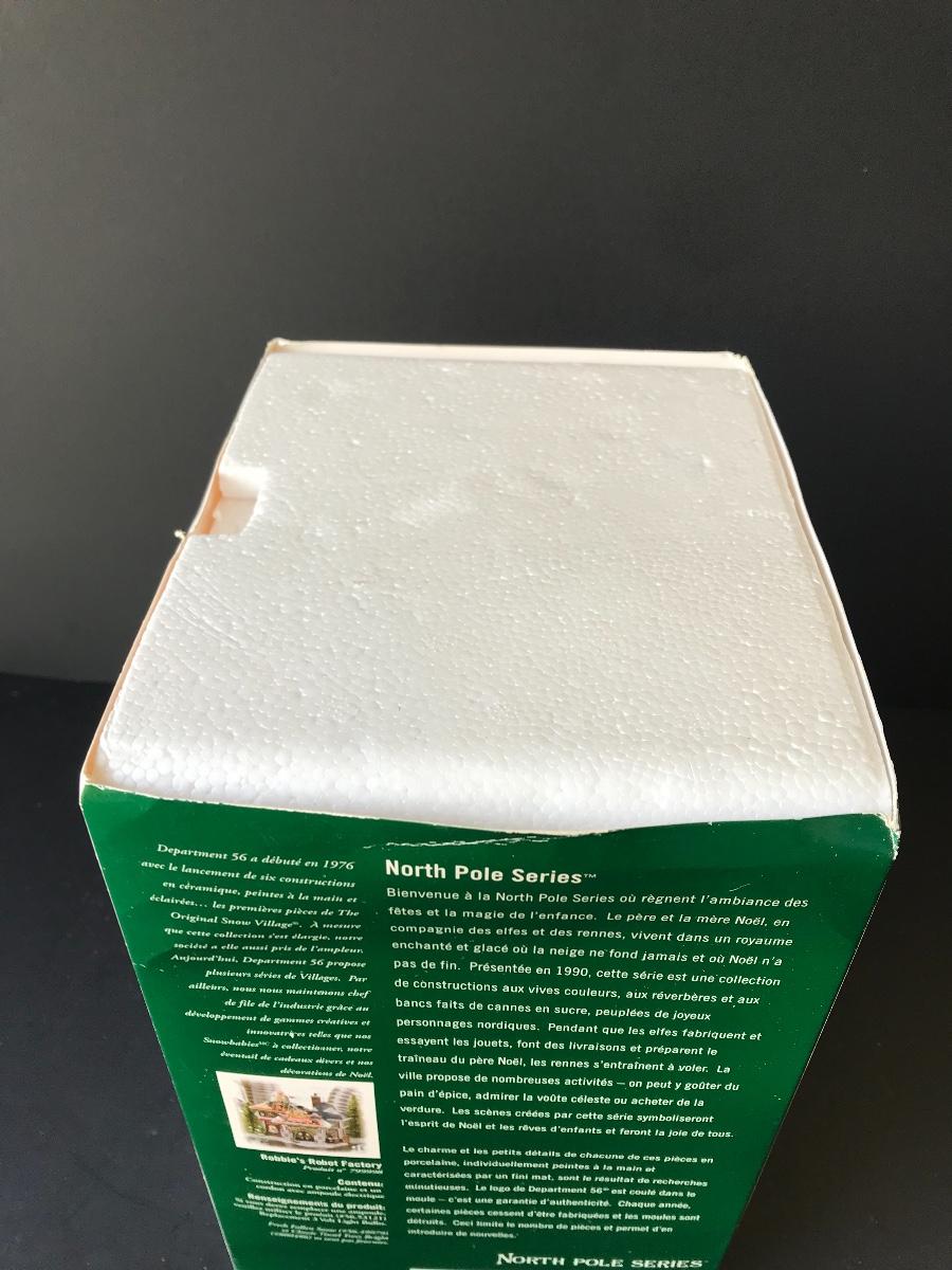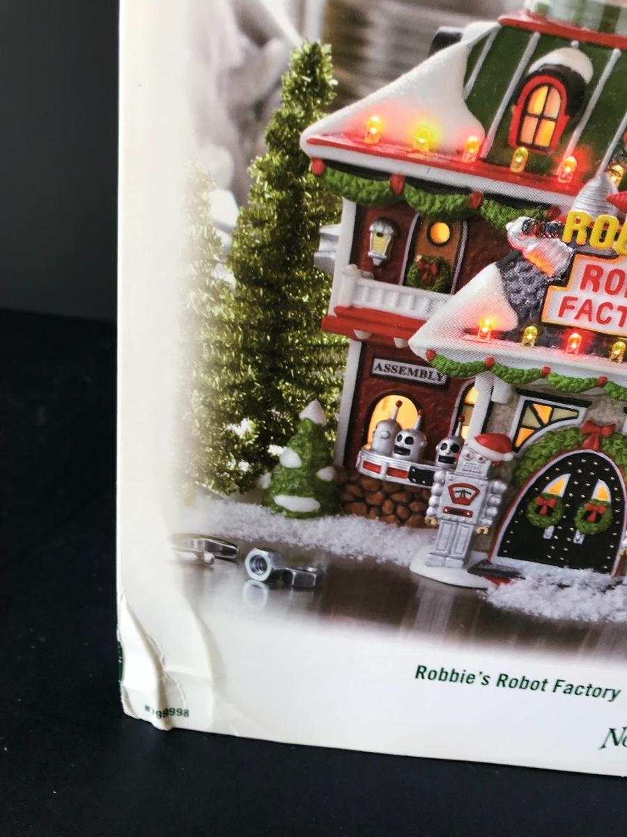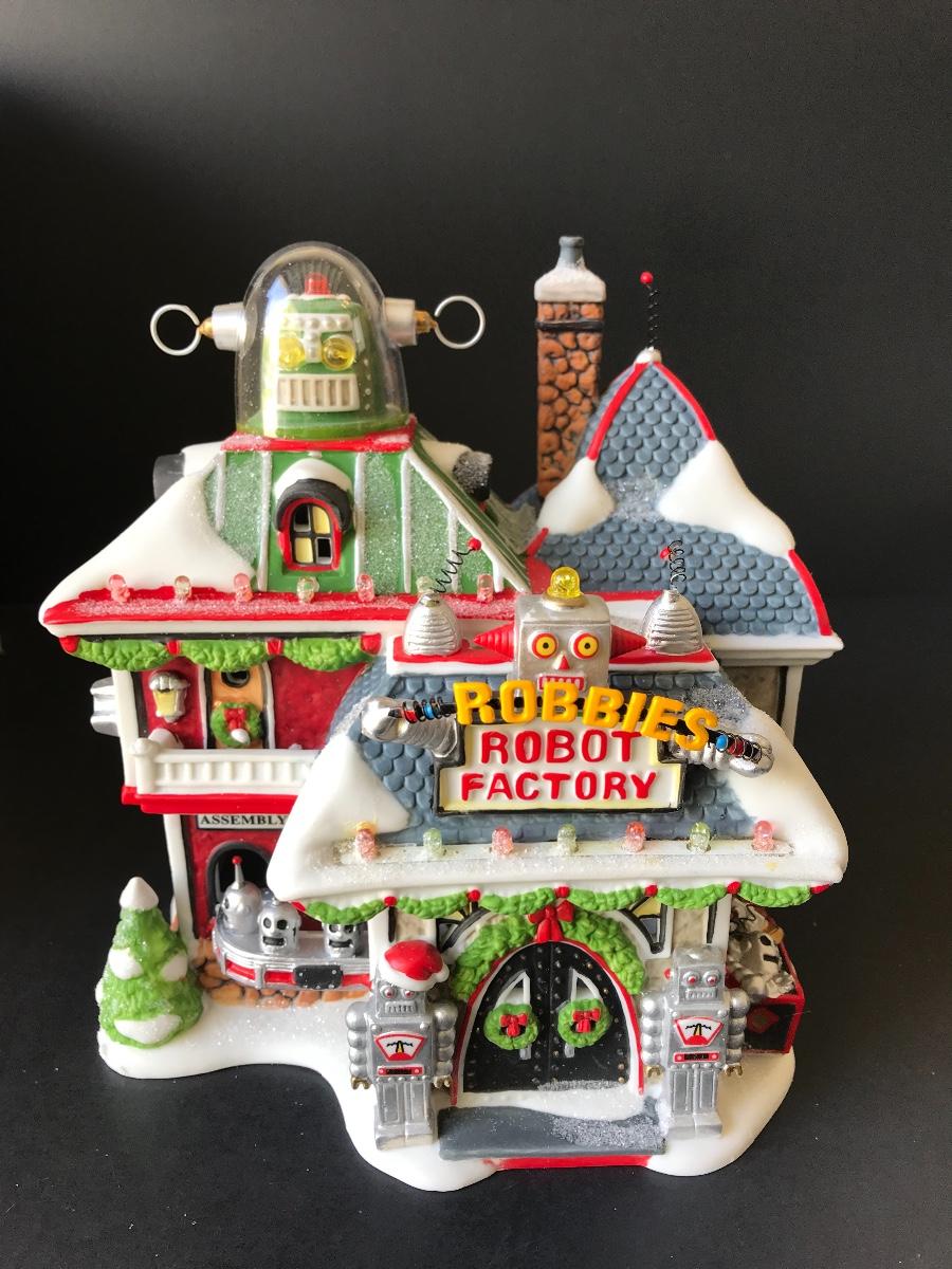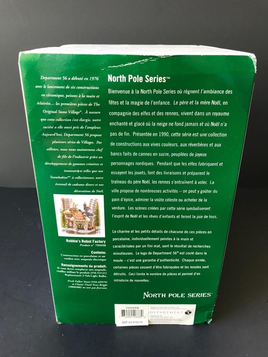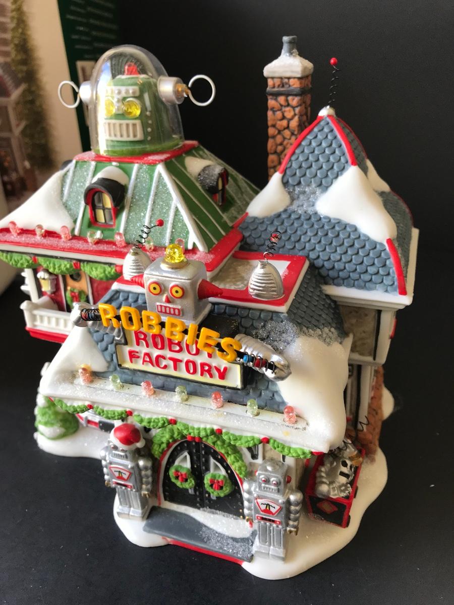 Robbie's Robot Factory - Department 56 - North Pole Series. All Holiday items in this auction are as-seen. The client collected a lot of holiday pieces and some are new in box, some were displayed once and come with original box, and some have been displayed and come with no box. They are all pre-owned in some fashion and have been stored in an attic or on shelf in library. Please see all pictures. The pictures show condition, measurements if taken, and what is included in the lot. Due to the large amount that we photograph and the time frame, we are not always able to take measurements. All items unless noted, are pre-owned and have been used. Thank you