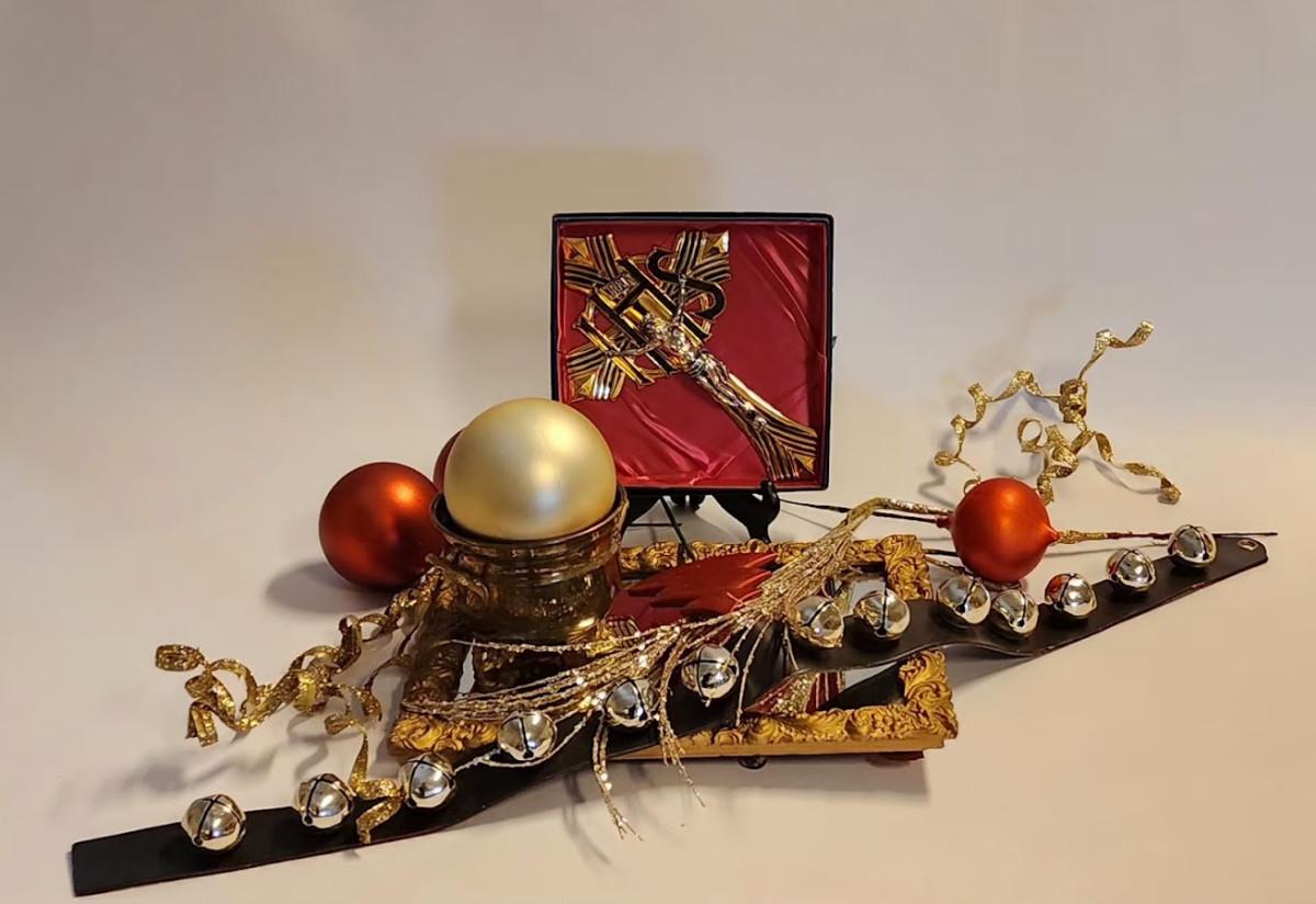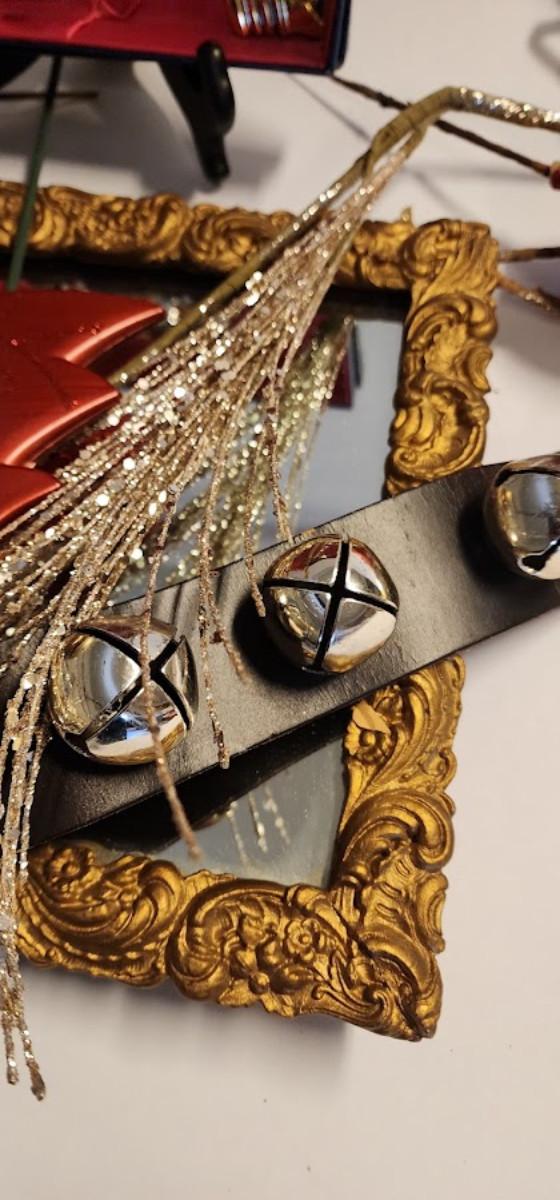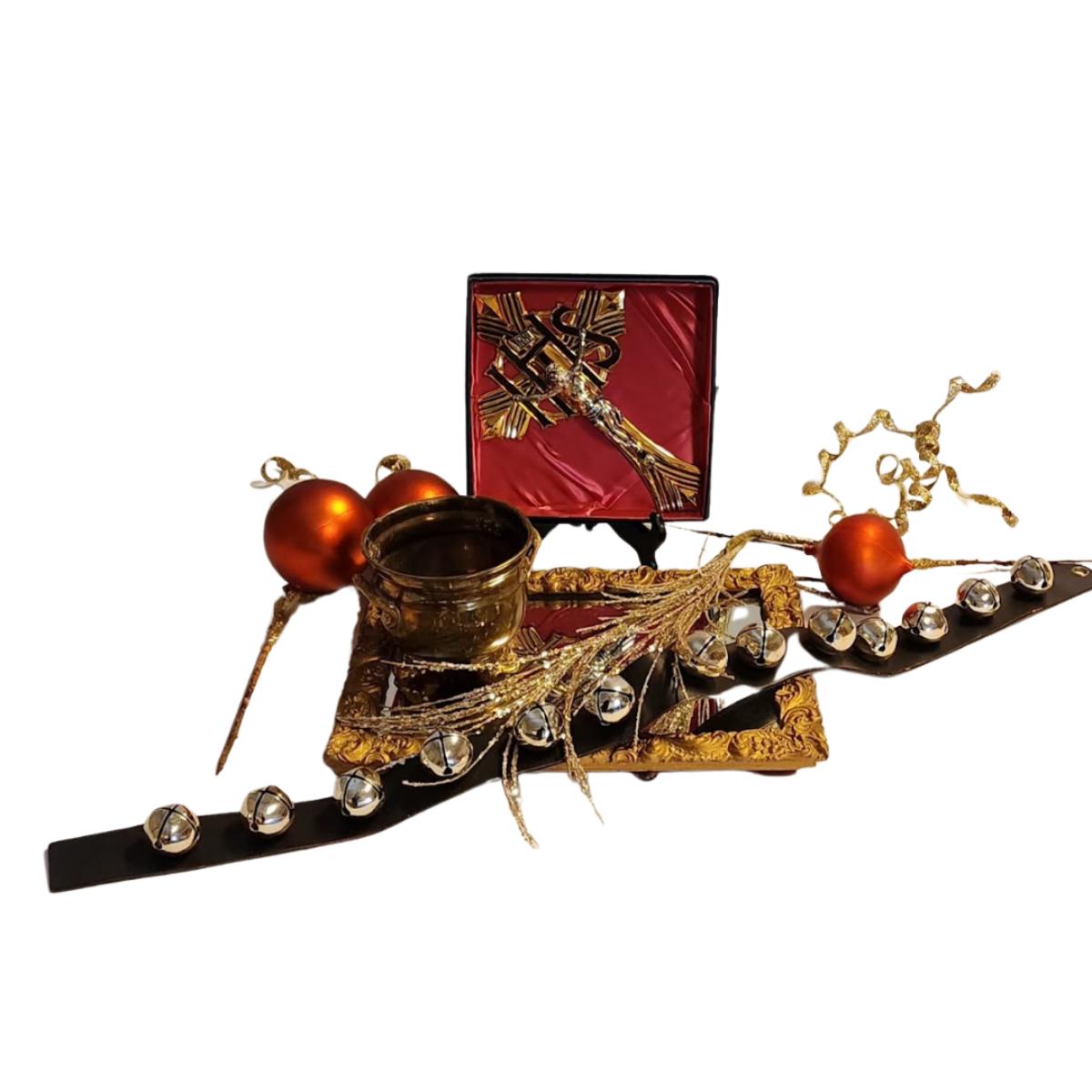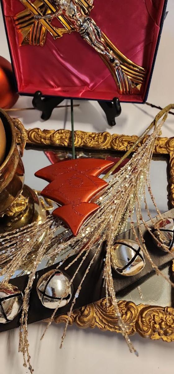 Lot includes: Vintage Brass Crucifix & Gold Frame Mirror and Bell Christmas Ornaments