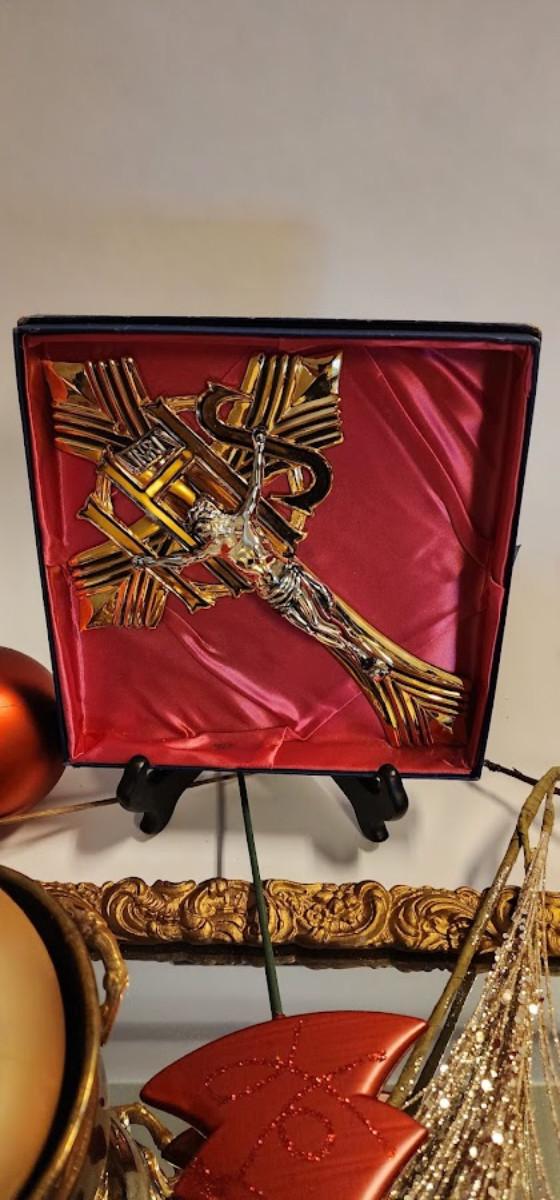 Lot 470 Vintage Brass Crucifix & Gold Frame Mirror With Other Christmas Ornaments