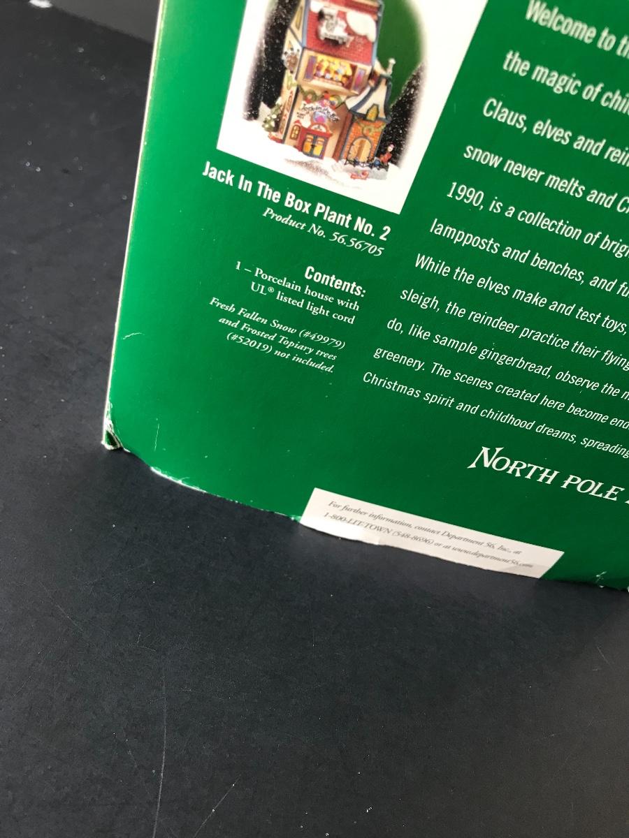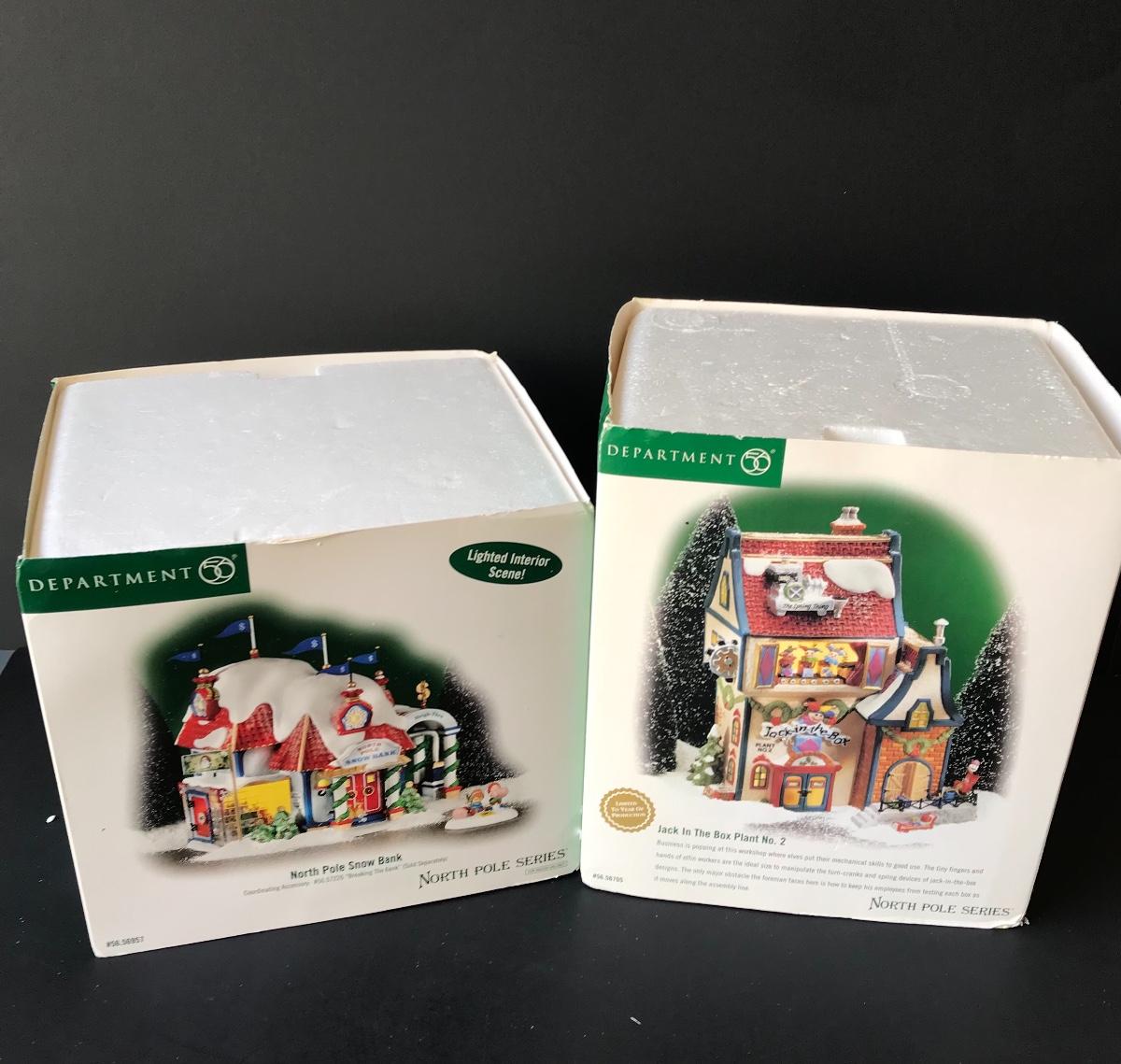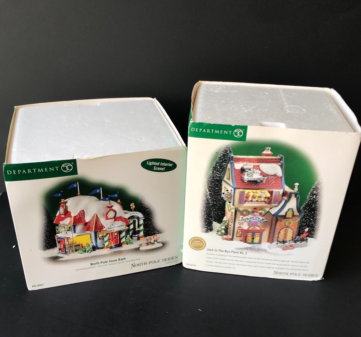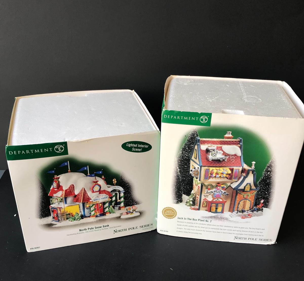 Lot of 2 Department 56 Christmas Display Decorations - North Pole Series - North Pole Snow Bank and Jack in the Box Plant No. 2. All Holiday items in this auction are as-seen. The client collected a lot of holiday pieces and some are new in box, some were displayed once and come with original box, and some have been displayed and come with no box. They are all pre-owned in some fashion and have been stored in an attic or on shelf in library. Please see all pictures. The pictures show condition, measurements if taken, and what is included in the lot. Due to the large amount that we photograph and the time frame, we are not always able to take measurements. All items unless noted, are pre-owned and have been used. Thank you