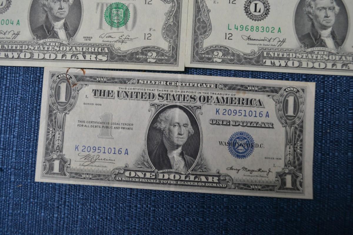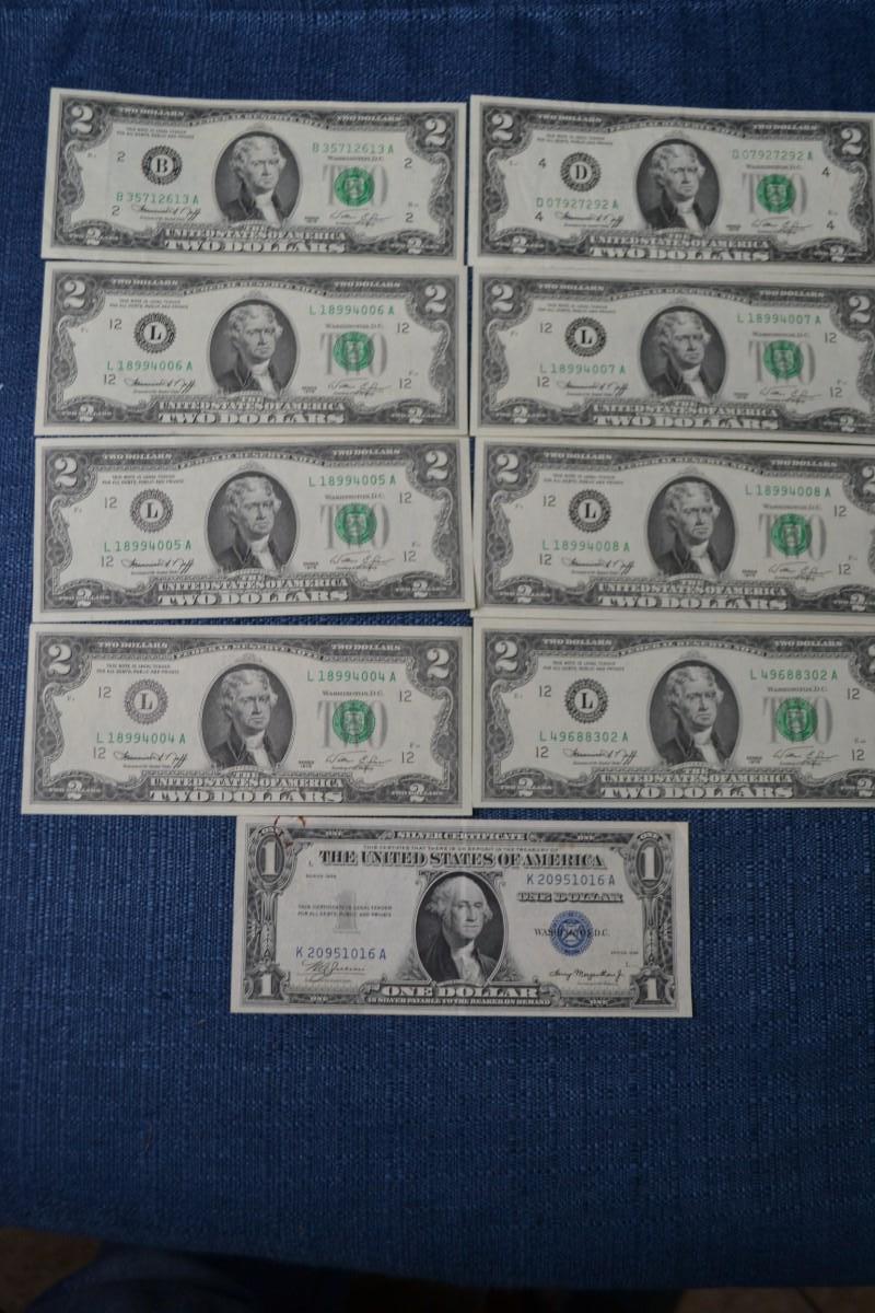 EIGHT TWO DOLLAR GREEN SEAL BILLS AND ONE DOLLAR SILVER CERTIFICATE