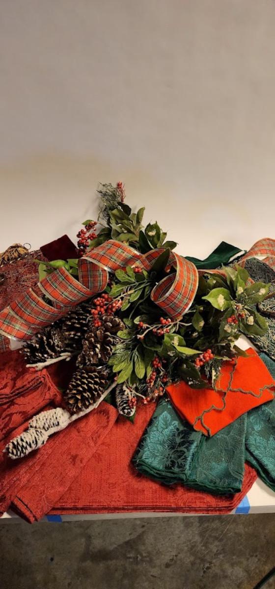 Lot 471 Red Christmas Place Mats, Green Christmas Napkins, & Other Christmas Decorations