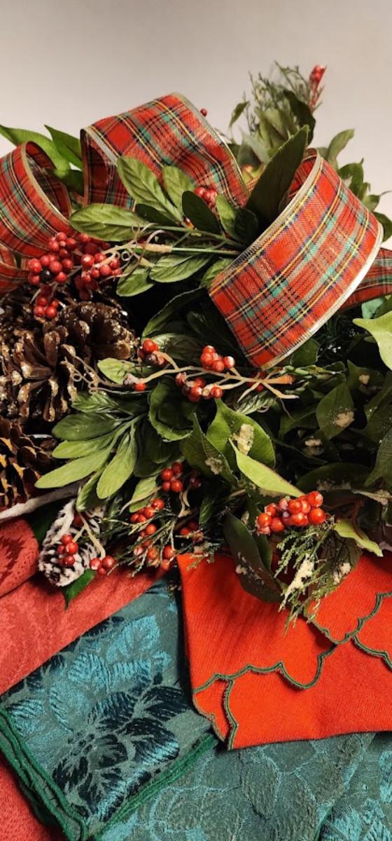 Lot includes: Four Red Christmas Place Mats, Four Green Christmas Napkins & Holly and Glitter Pine Cones Christmas Decorations