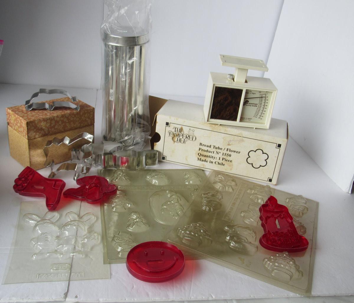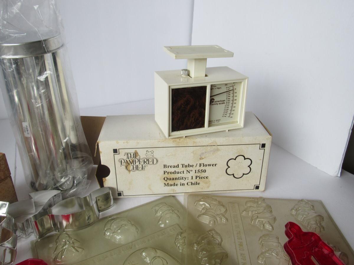 Lot 472: Lot of Kitchen Stuff, Pampered Chef, Scale, Xmas Chocolate Molds, Cutters