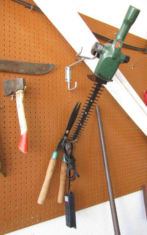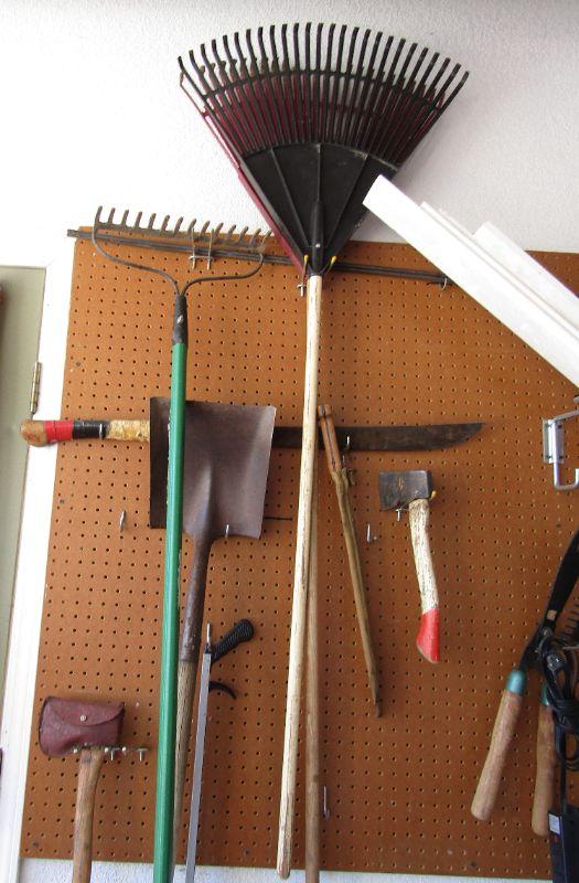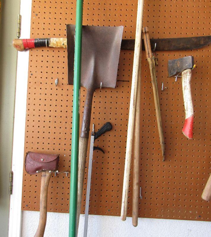 RAKES, SHOVELS, HEDGE TRIMMER, 2 HATCHETS, MACHETE (HANDLE REPAIRED), SPUD BAR AND MORE