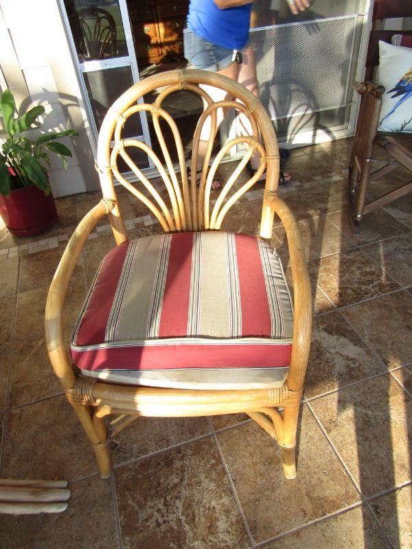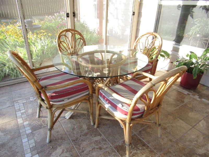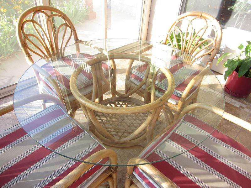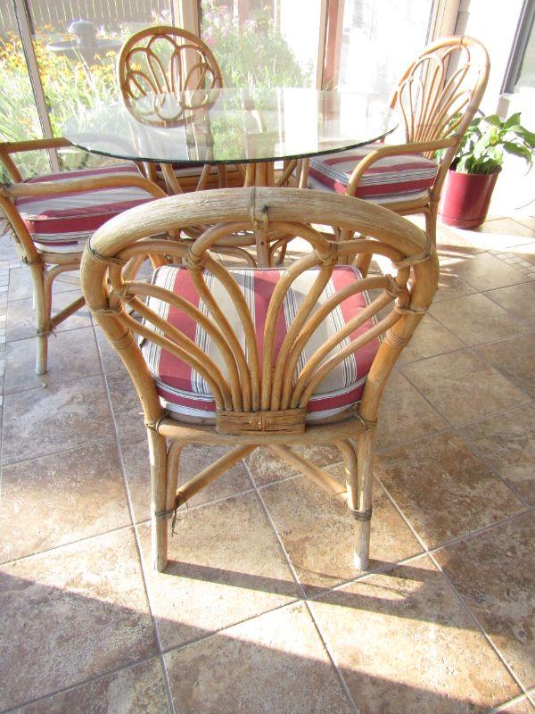 GLASS TOP TABLE WITH BAMBOO BASE AND 4 BAMBOO ARMED CHAIRS
