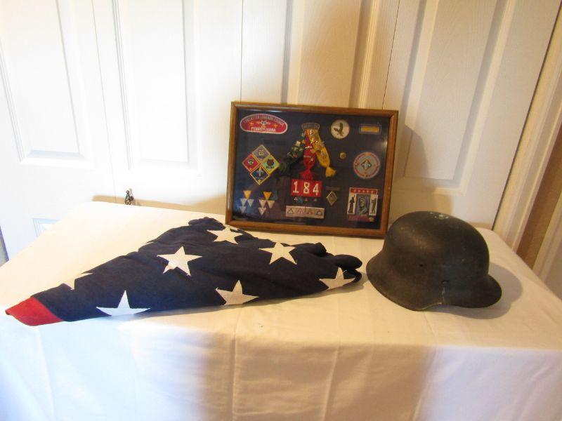 LOT 94 WEBLOS BADGES, FLAG & MILITARY HELMET