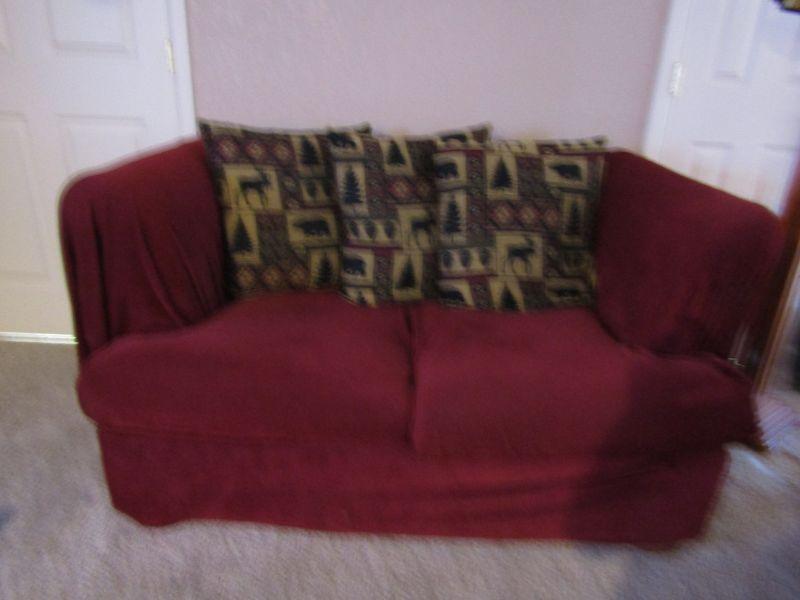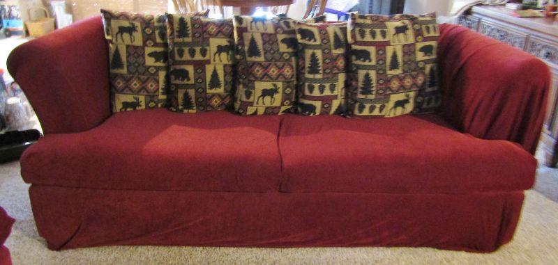SLIP COVERED SOFA WITH LARGE MOOSE & BEAR PILLOW GOOD CONDITION MEASURES 74"