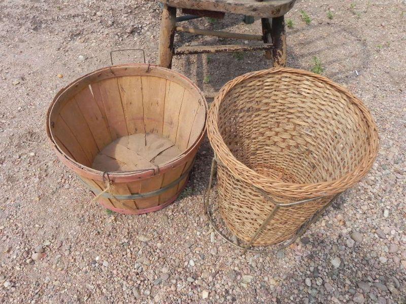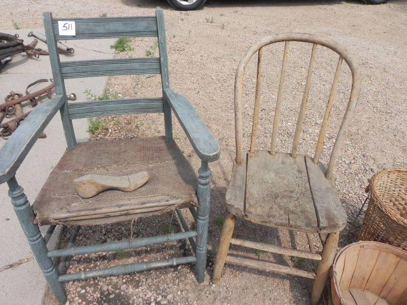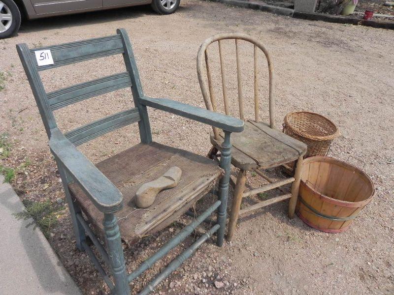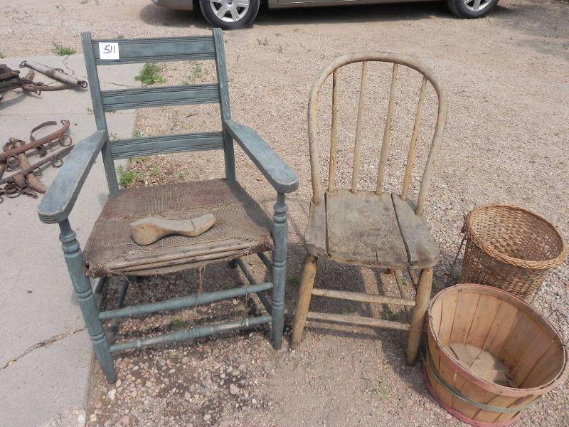 CHAIRS, BUSHEL BASKETS AND WOODEN SHOE FORM
