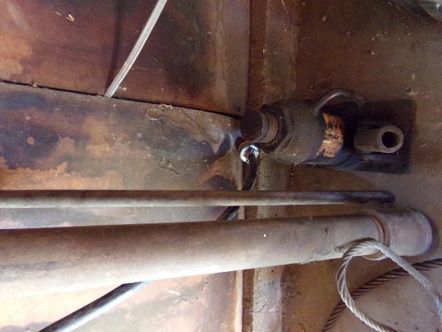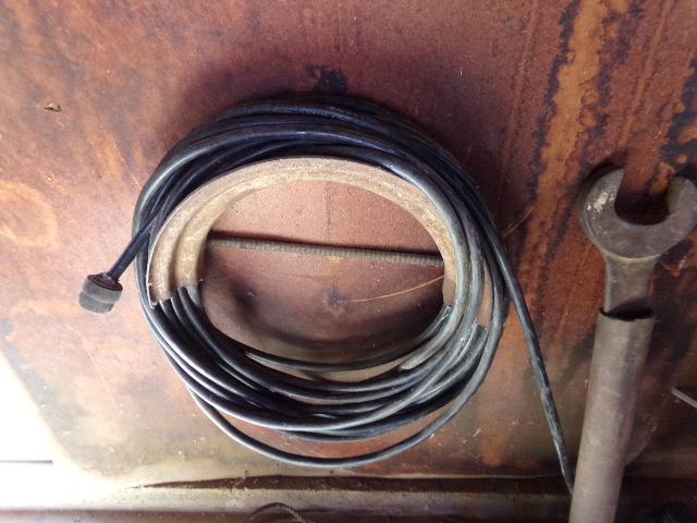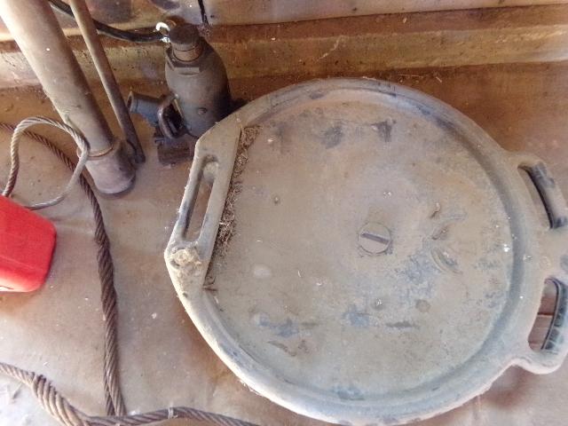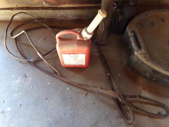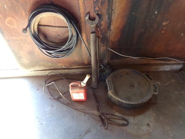 OIL PAN, JACK, LARGE WRENCH, GAS CAN AND EXTENSION CORD.