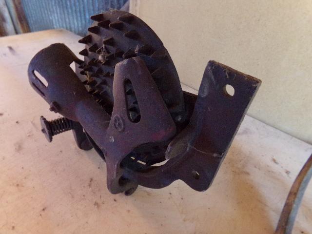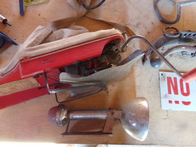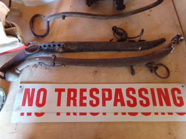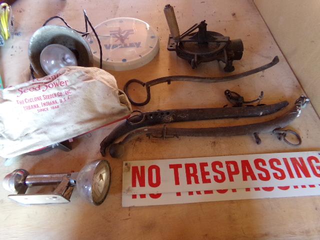 HORSE COLLAR, HEAT LAMP, FLASH LIGHT, CLOCK, AND CORN HUSKER AND 2 NO TRESPASSING SIGNS.