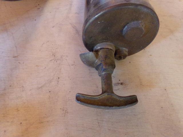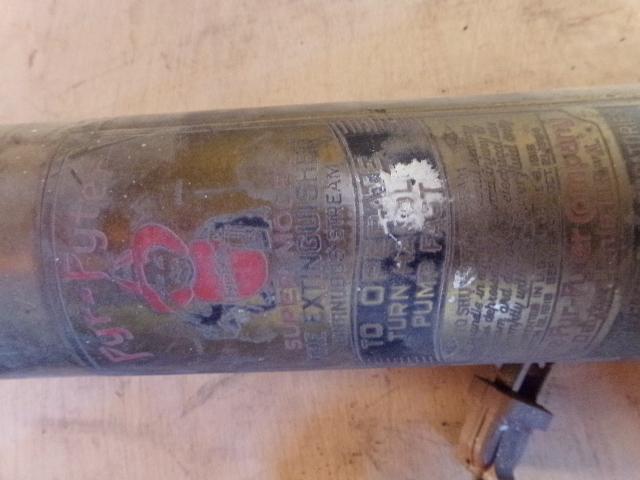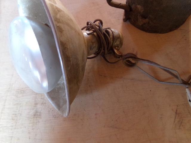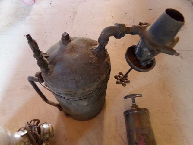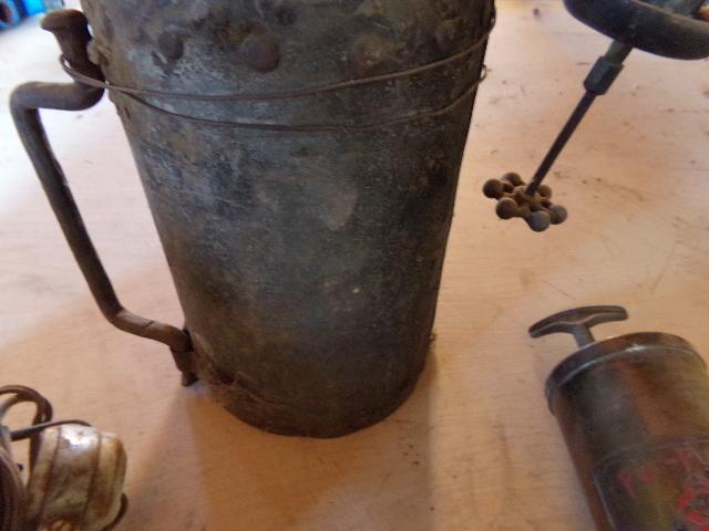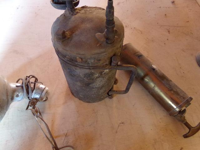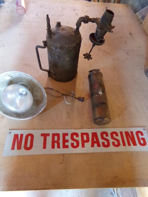 VINTAGE TORCH, GREASE GUN, HEAT LAMP AND A NO TRESPASSING SIGN.