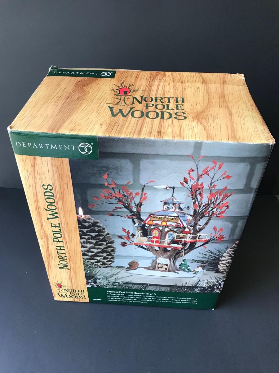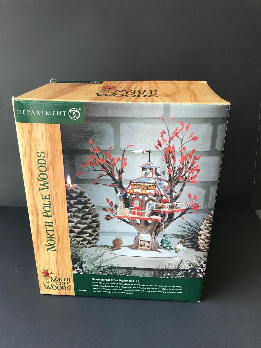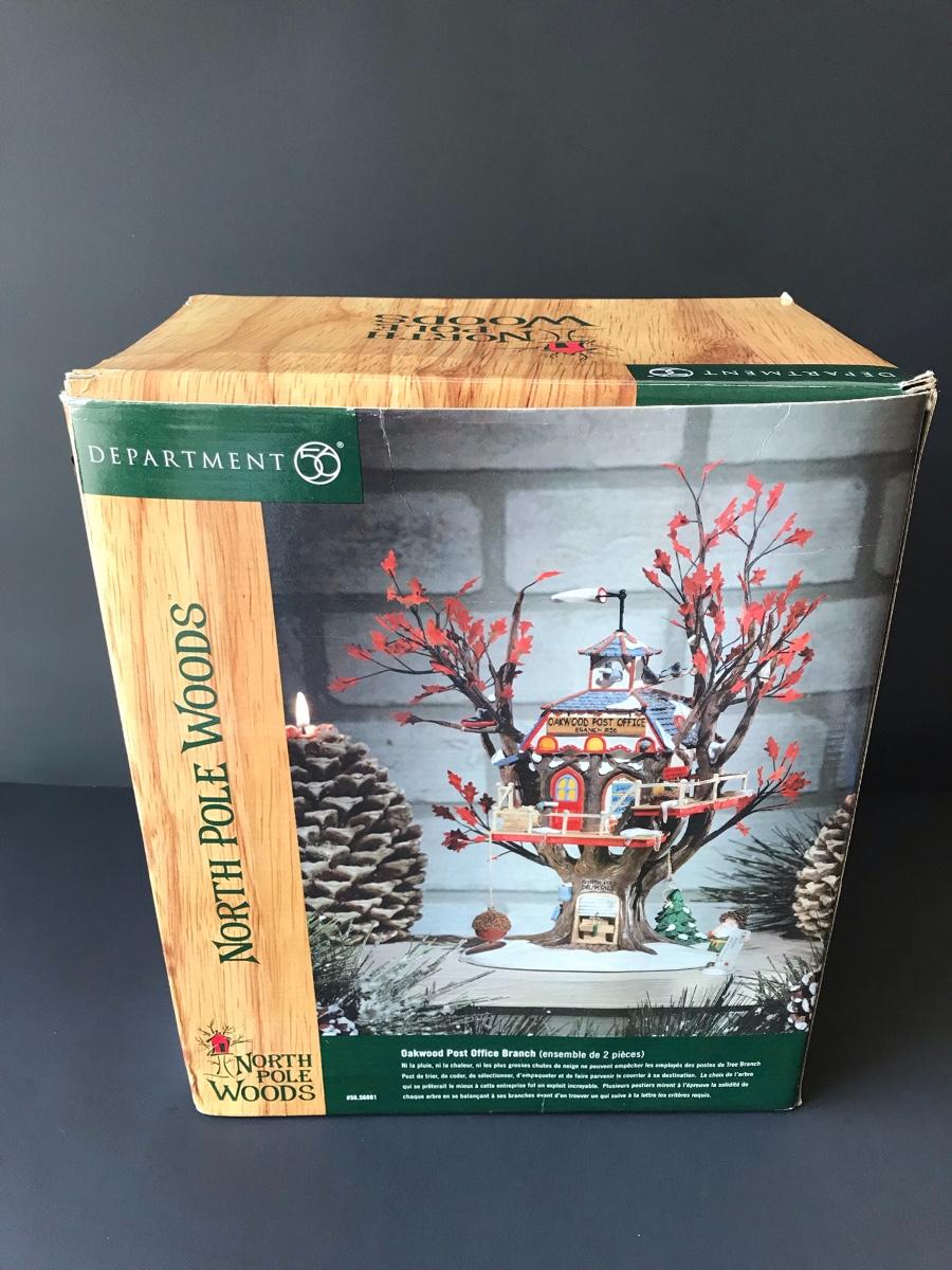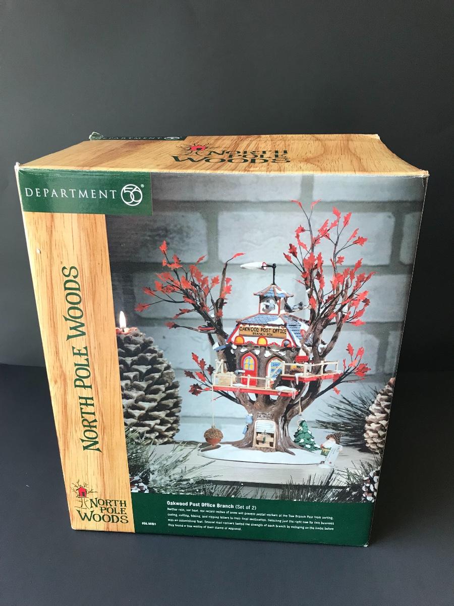Oakwood Post Office Branch - Department 56 - North Pole Woods. Figure included is not the one pictured that originally came with display. Missing power adapter. All Holiday items in this auction are as-seen. The client collected a lot of holiday pieces and some are new in box, some were displayed once and come with original box, and some have been displayed and come with no box. They are all pre-owned in some fashion and have been stored in an attic or on shelf in library. Please see all pictures. The pictures show condition, measurements if taken, and what is included in the lot. Due to the large amount that we photograph and the time frame, we are not always able to take measurements. All items unless noted, are pre-owned and have been used. Thank you