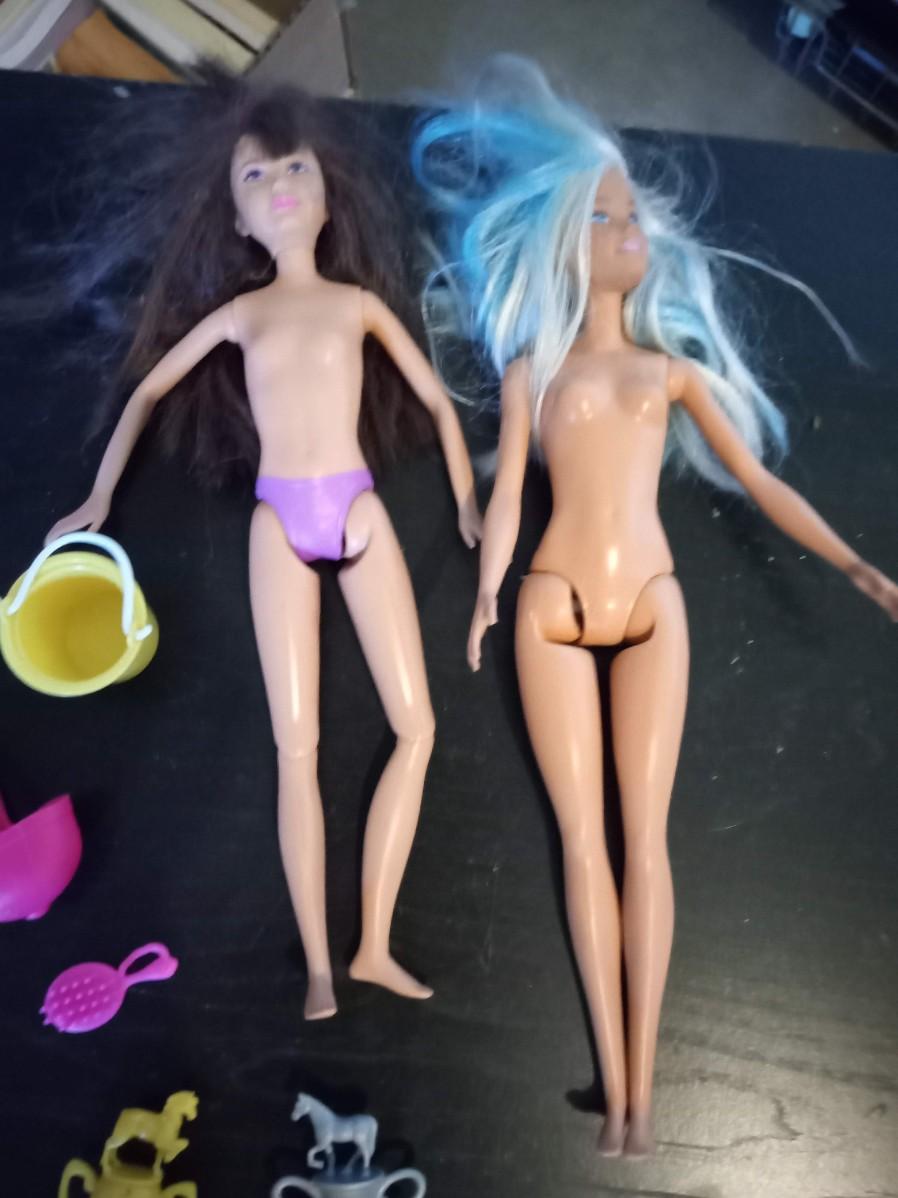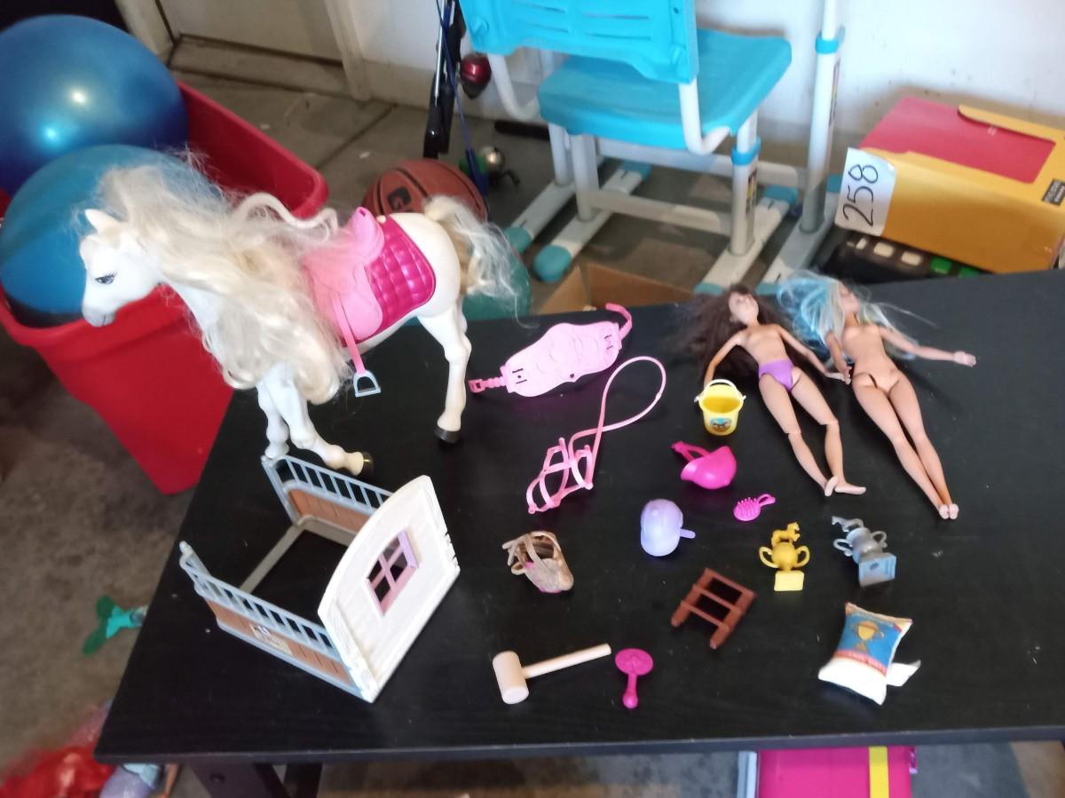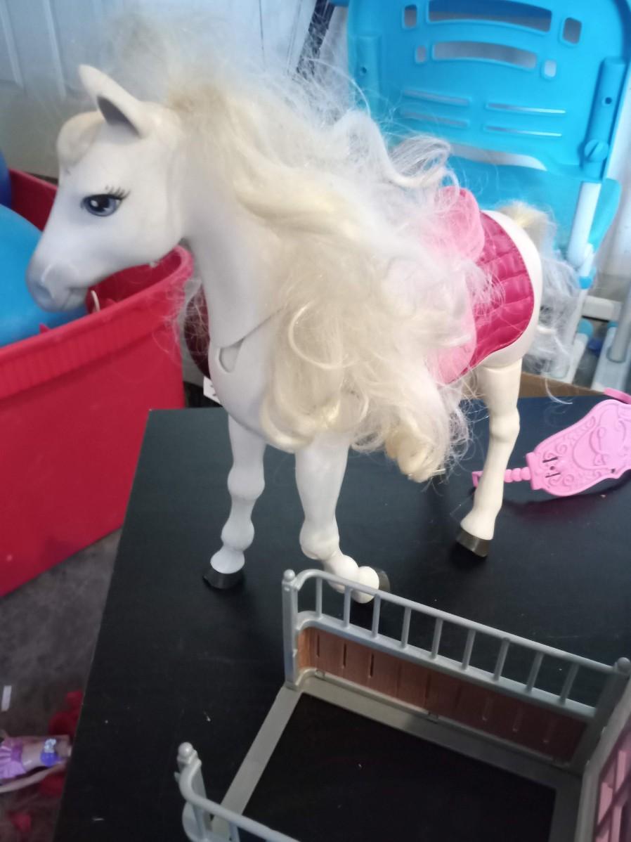 LOT 474  TOY HORSE WITH SOUNDS, BARBIE LIKE DOLLS AND EQUESTRIAN ACCESSORIES  (G)