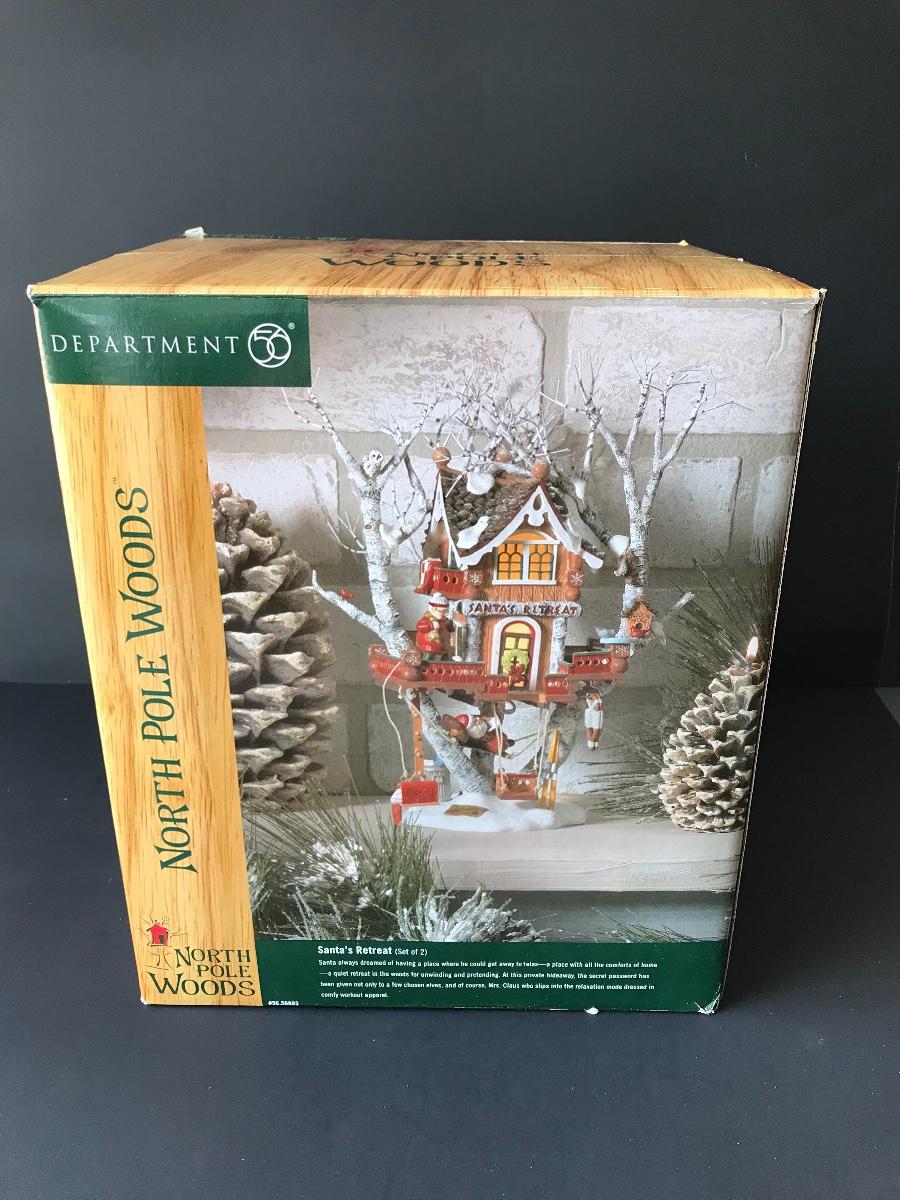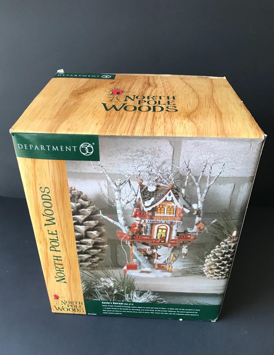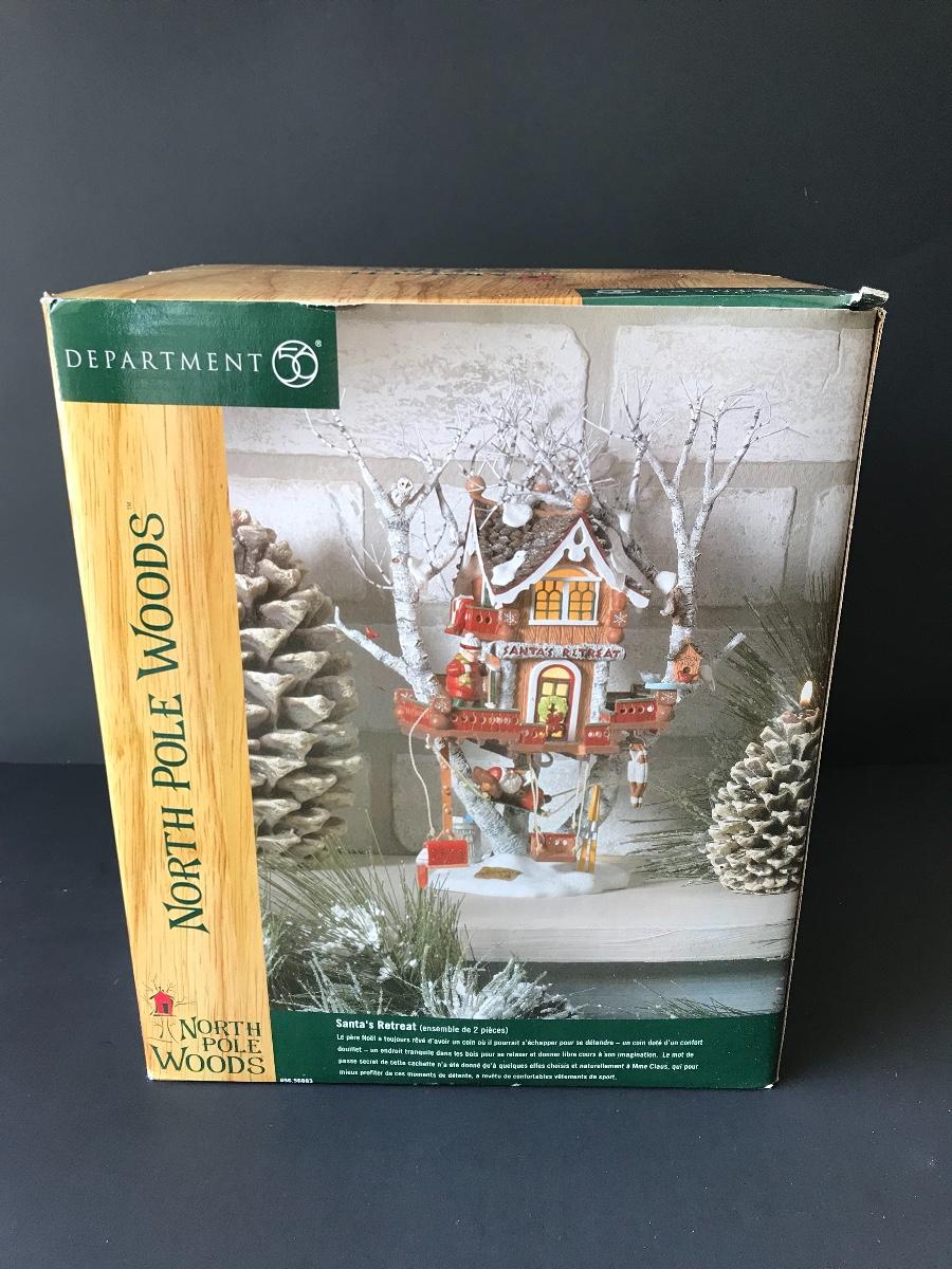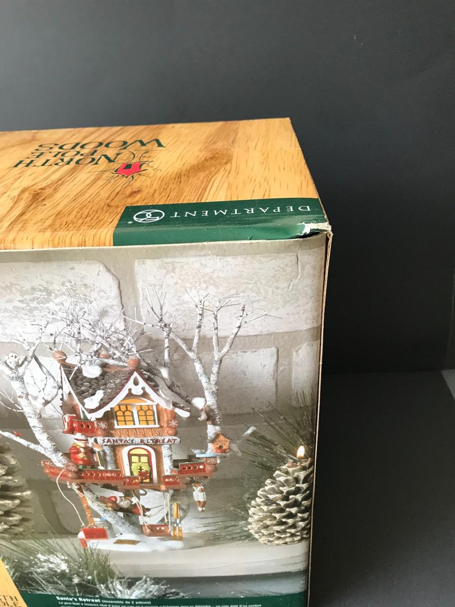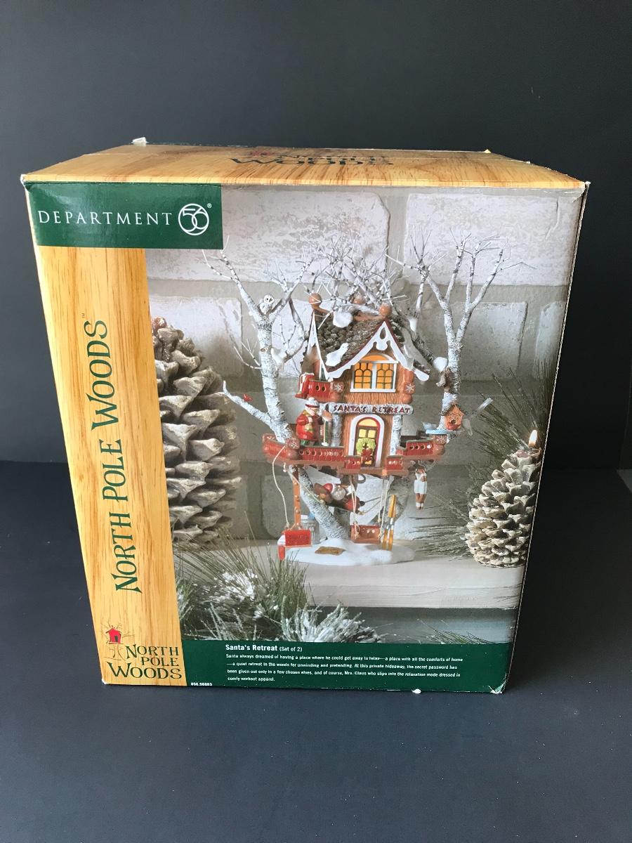 Santa's Retreat - Department 56 - North Pole Woods. Has some broken pieces. Missing power adapter. All Holiday items in this auction are as-seen. The client collected a lot of holiday pieces and some are new in box, some were displayed once and come with original box, and some have been displayed and come with no box. They are all pre-owned in some fashion and have been stored in an attic or on shelf in library. Please see all pictures. The pictures show condition, measurements if taken, and what is included in the lot. Due to the large amount that we photograph and the time frame, we are not always able to take measurements. All items unless noted, are pre-owned and have been used. Thank you