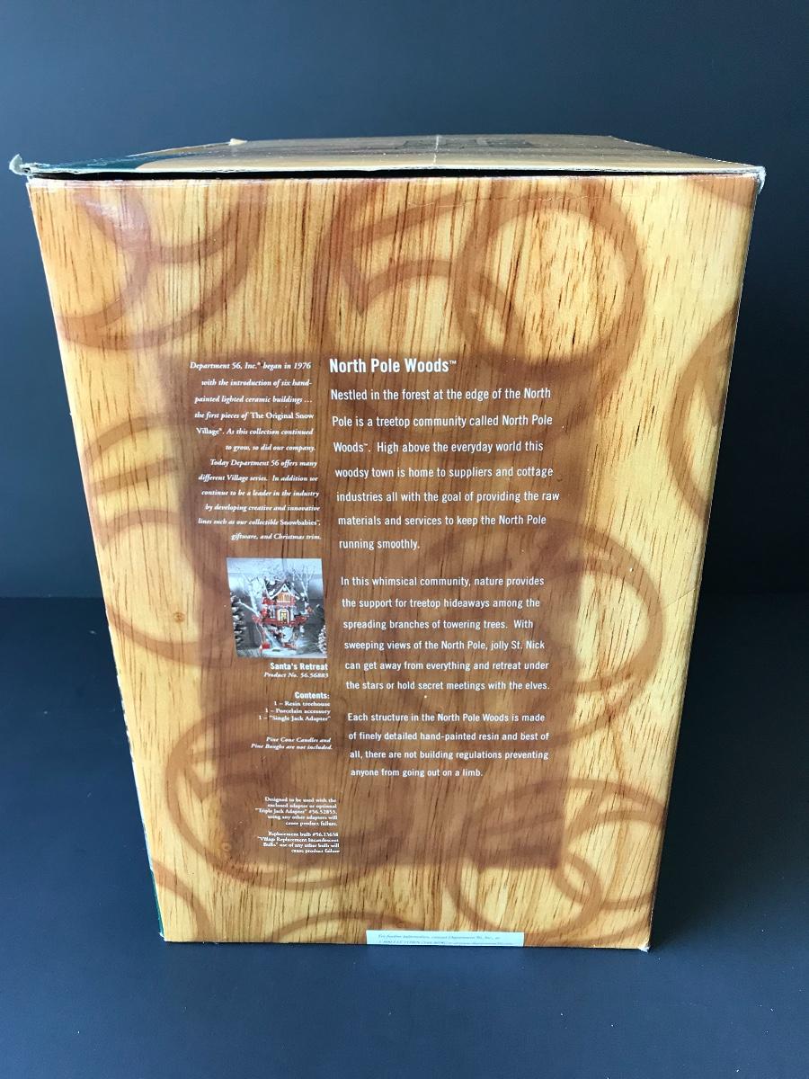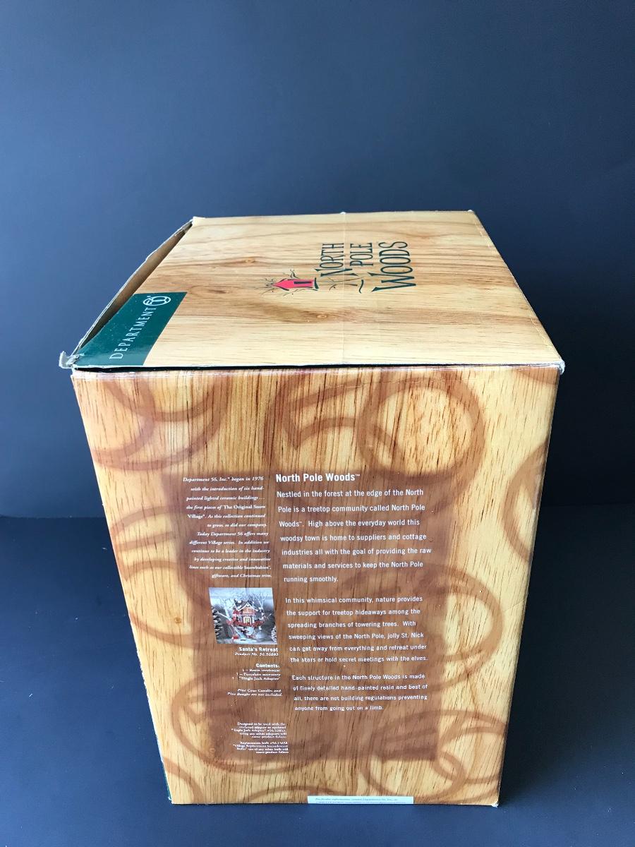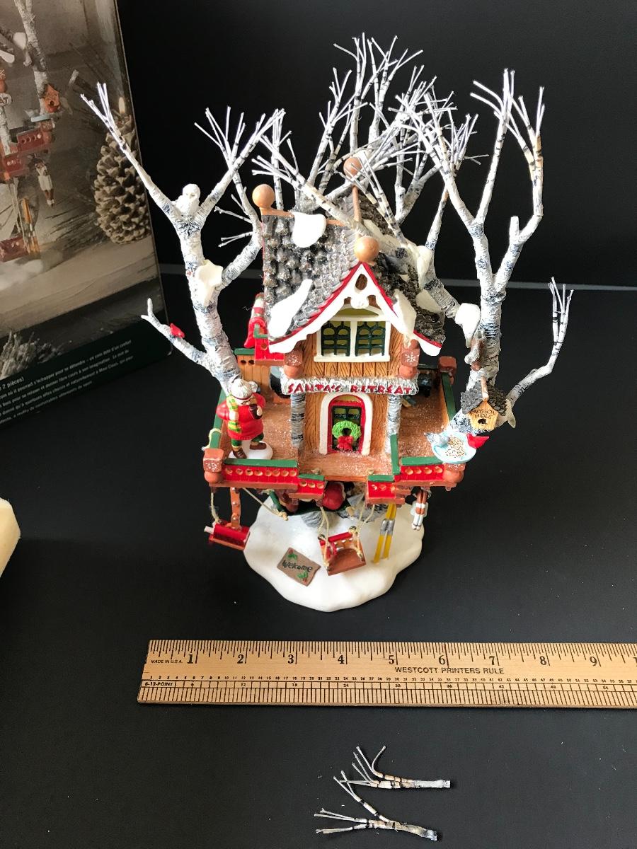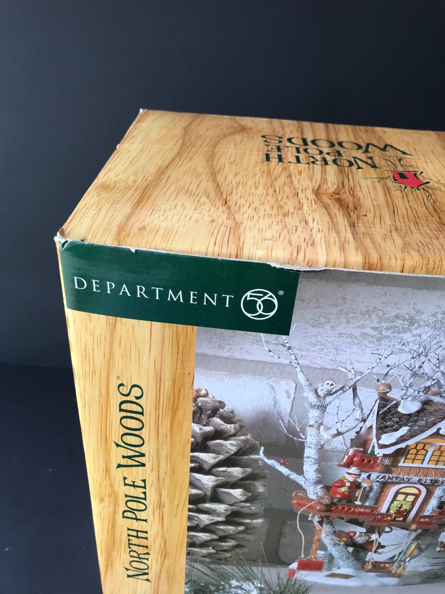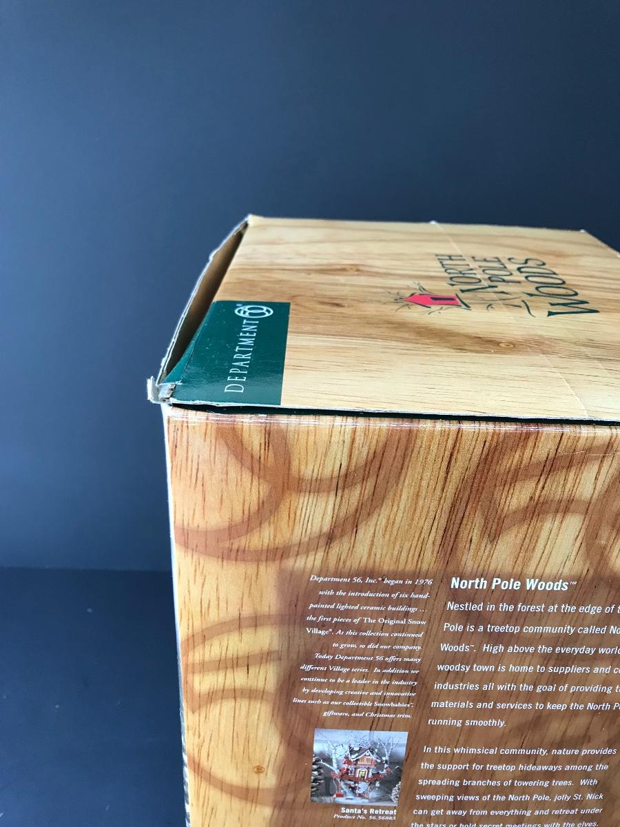 Santa's Retreat - Department 56 - North Pole Woods. Has some broken pieces. Missing power adapter. All Holiday items in this auction are as-seen. The client collected a lot of holiday pieces and some are new in box, some were displayed once and come with original box, and some have been displayed and come with no box. They are all pre-owned in some fashion and have been stored in an attic or on shelf in library. Please see all pictures. The pictures show condition, measurements if taken, and what is included in the lot. Due to the large amount that we photograph and the time frame, we are not always able to take measurements. All items unless noted, are pre-owned and have been used. Thank you