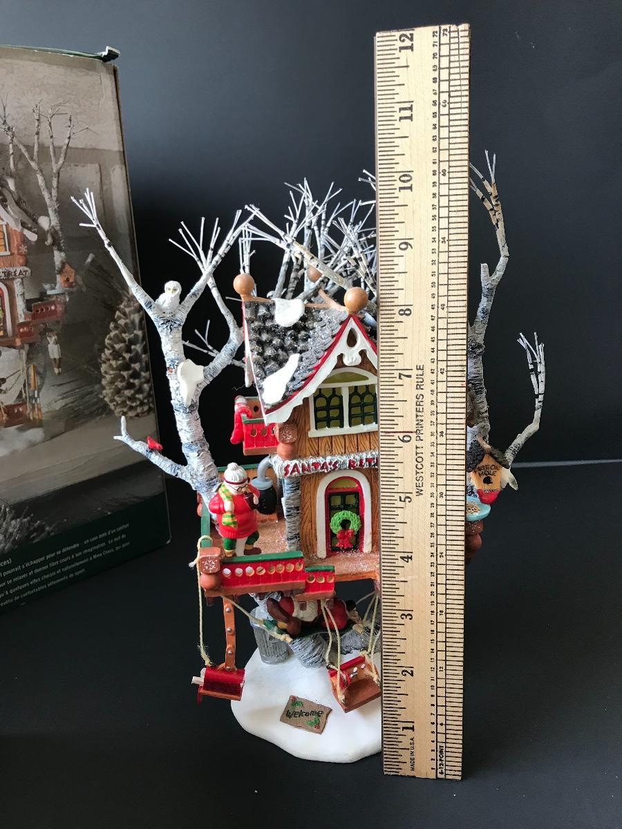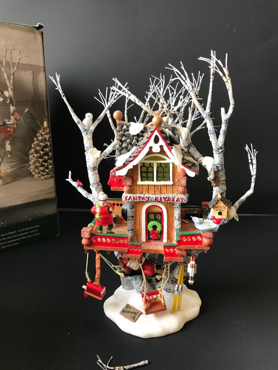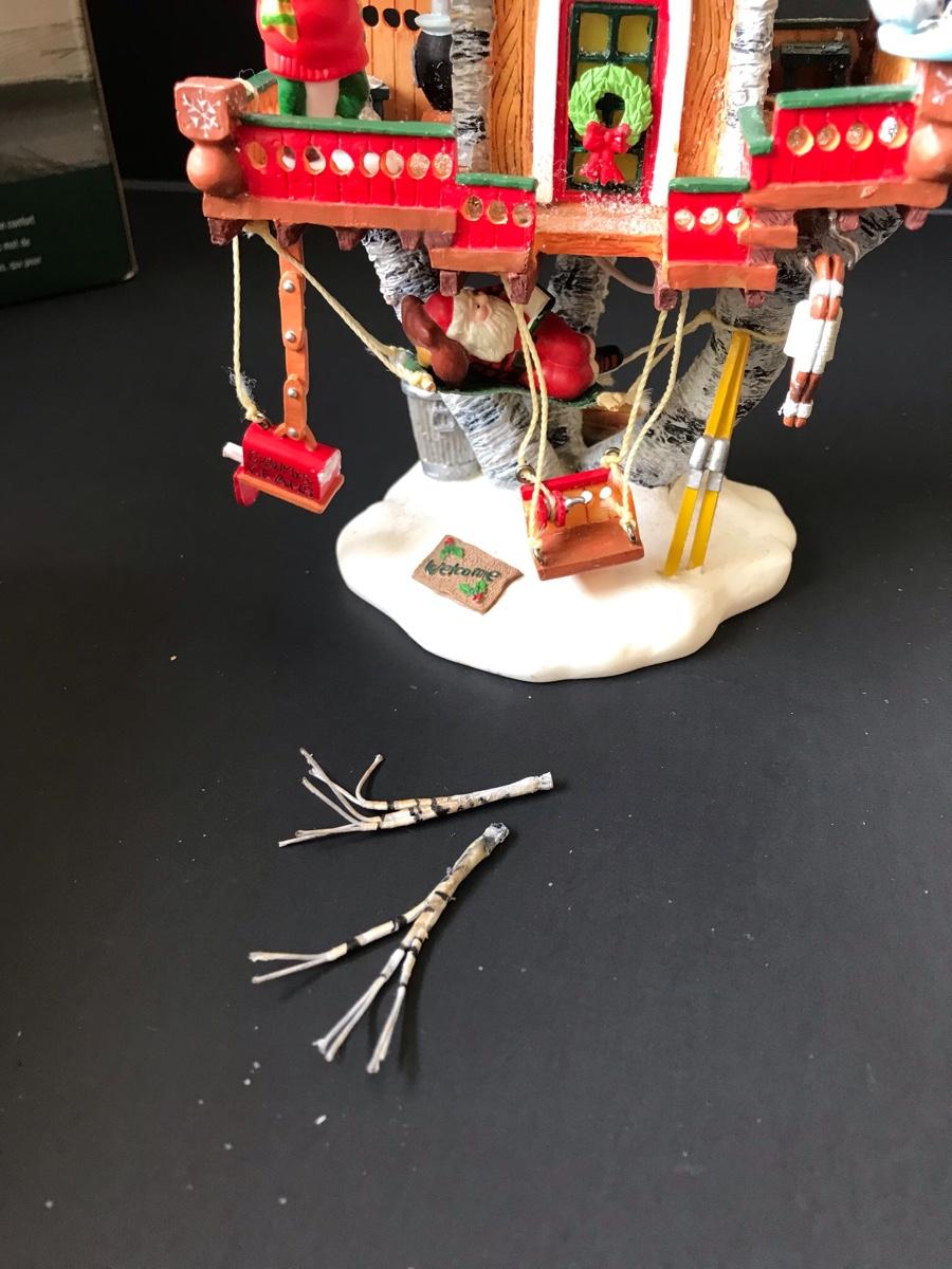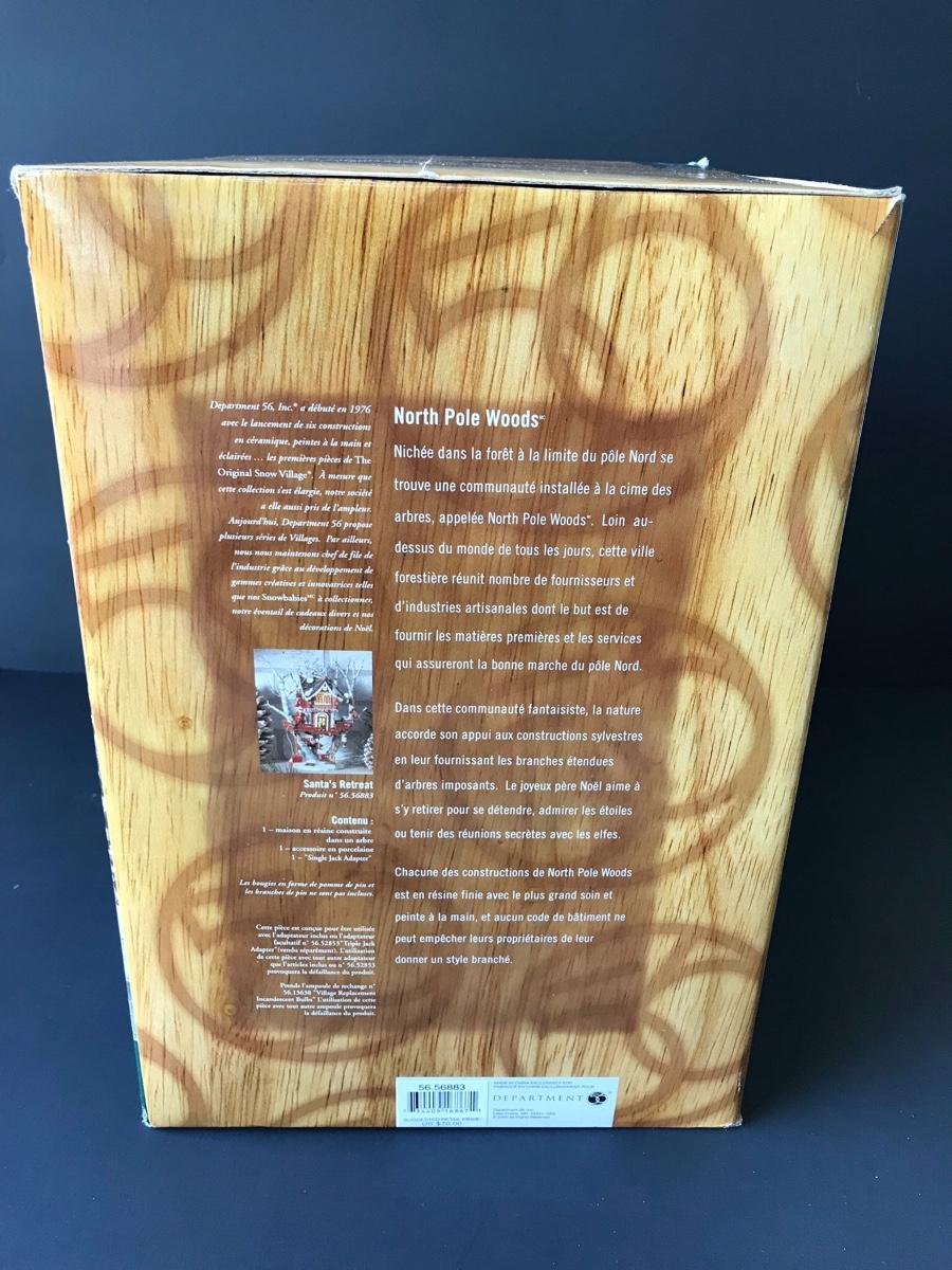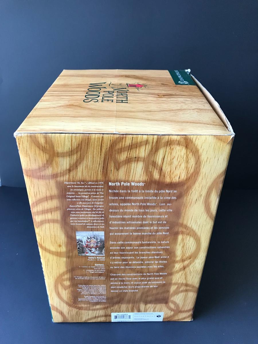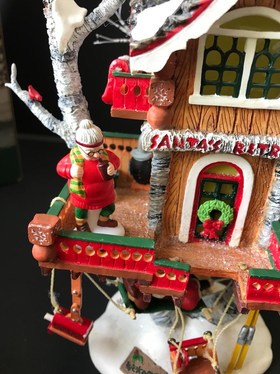 Santa's Retreat - Department 56 - North Pole Woods. Has some broken pieces. Missing power adapter. All Holiday items in this auction are as-seen. The client collected a lot of holiday pieces and some are new in box, some were displayed once and come with original box, and some have been displayed and come with no box. They are all pre-owned in some fashion and have been stored in an attic or on shelf in library. Please see all pictures. The pictures show condition, measurements if taken, and what is included in the lot. Due to the large amount that we photograph and the time frame, we are not always able to take measurements. All items unless noted, are pre-owned and have been used. Thank you