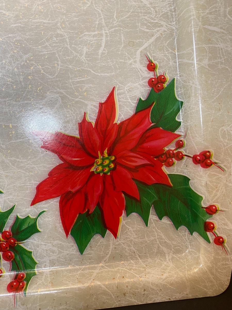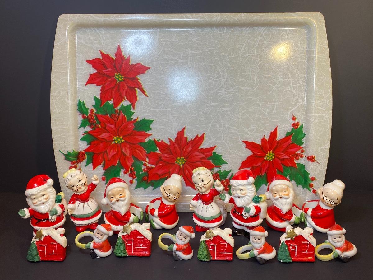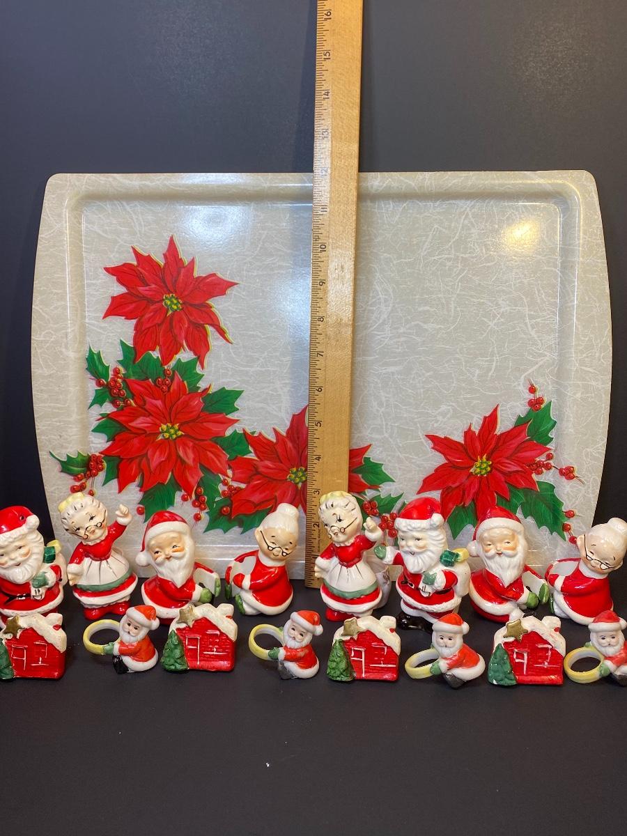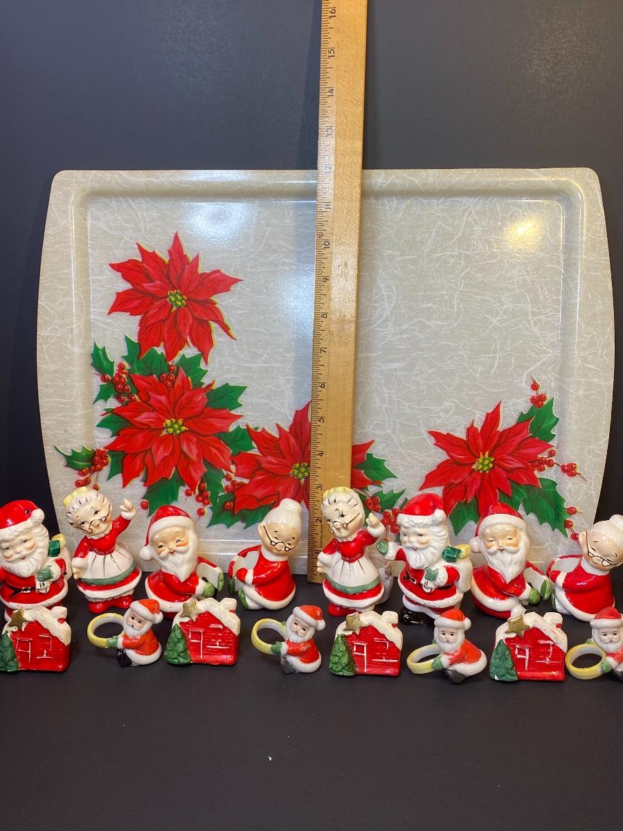 Vintage Poinsettia tray, Mr. And Mrs Clause candle holders, cabin and Santa napkin holders. The pictures show condition, measurements if taken, and what is included in the lot. Due to the large amount that we photograph and the time frame, we are not always able to take measurements. All items unless noted, are pre-owned and have been used, and are untested. Thank you.